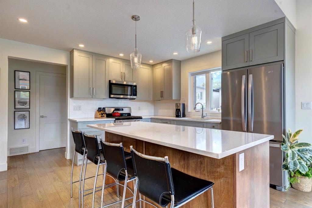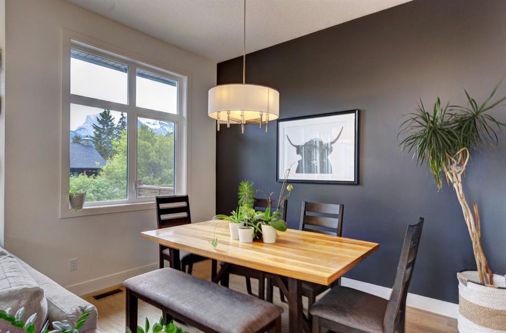 Stunning mountain triplex in the heart of Canmore. Perfectly positioned a short walk from downtown Canmore, this beautifully designed home spans three spacious levels and offers an exceptional blend of style, comfort and functionality. The main floor boasts an open-concept layout featuring a modern kitchen, dining area and living room with vaulted ceilings and a striking fireplace as the centrepiece. Step out onto the expansive deck to take in breathtaking mountain views. This level also includes two well-appointed bedrooms and a full bath. Upstairs, the private primary suite offers a luxurious retreat complete with a spa-inspired ensuite, walk-in closet and convenient laundry area. The fully finished lower level offers flexibility and is ideal for guests or roommates, featuring a large family room, a kitchenette, an additional bedroom and another full bathroom. Additional highlights include attached garage, ample storage and premium finishes throughout—engineered hardwood floors, stainless steel appliances and quartz countertops.