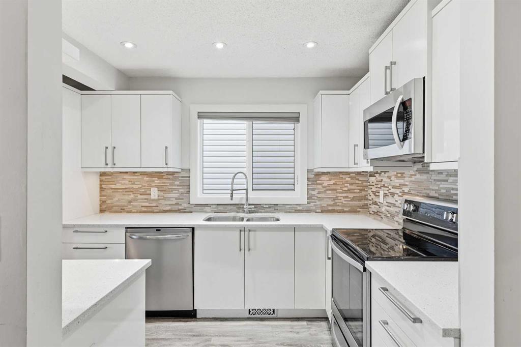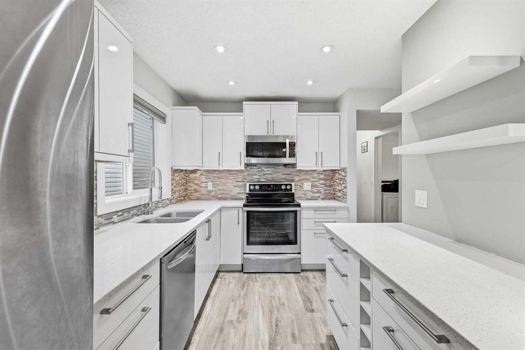 The main floor features a bright great room layout with pot lighting, durable laminate flooring, and seamless flow throughout. The timeless white kitchen showcases glossy flat-panel cabinetry, quartz countertops, stainless steel appliances, and a glass tile backsplash — perfect for both everyday living and entertaining. You’ll also find convenient main floor laundry, a 2-piece powder room, and access to a large private front wood deck surrounded by mature trees for added privacy.