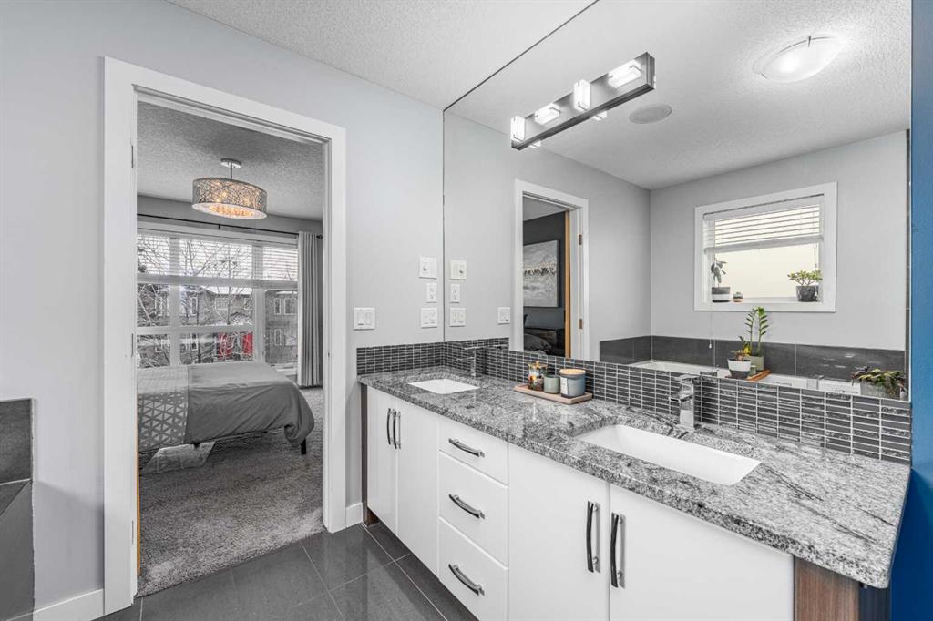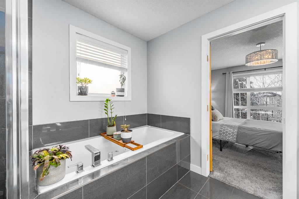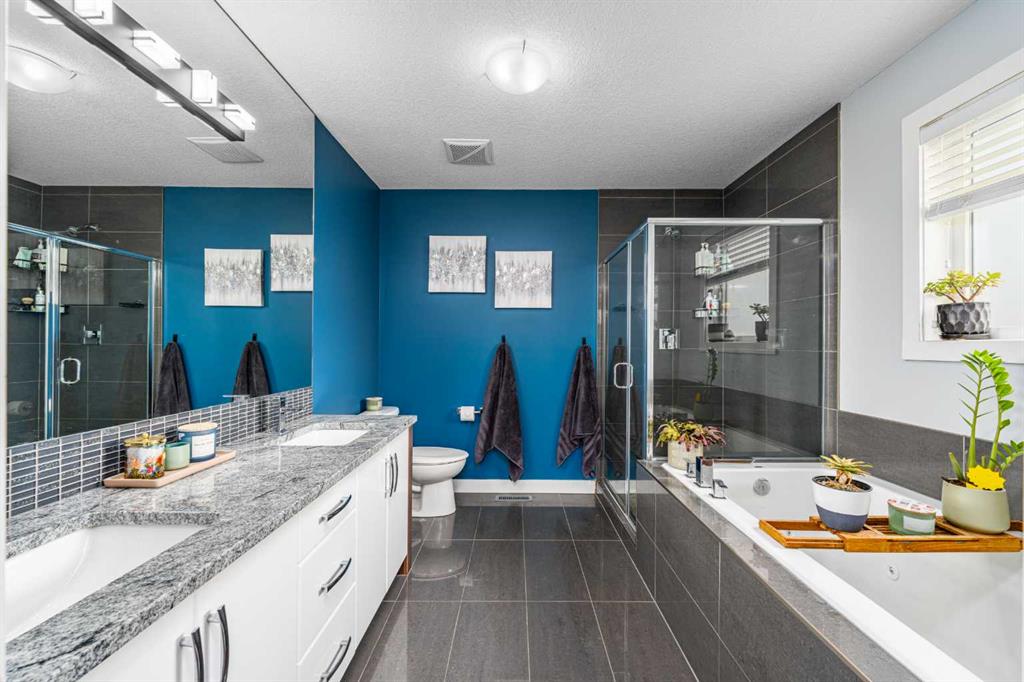 Upstairs, two generously sized bedrooms provide comfort and privacy, including a refined primary retreat featuring massive west-facing windows, a spacious walk-in closet, and an impressive 5-piece ensuite with double sinks, deep jetted soaker tub, and separate glass shower. The second bedroom offers its own private 4-piece ensuite, along with dedicated upper-level laundry for added convenience.