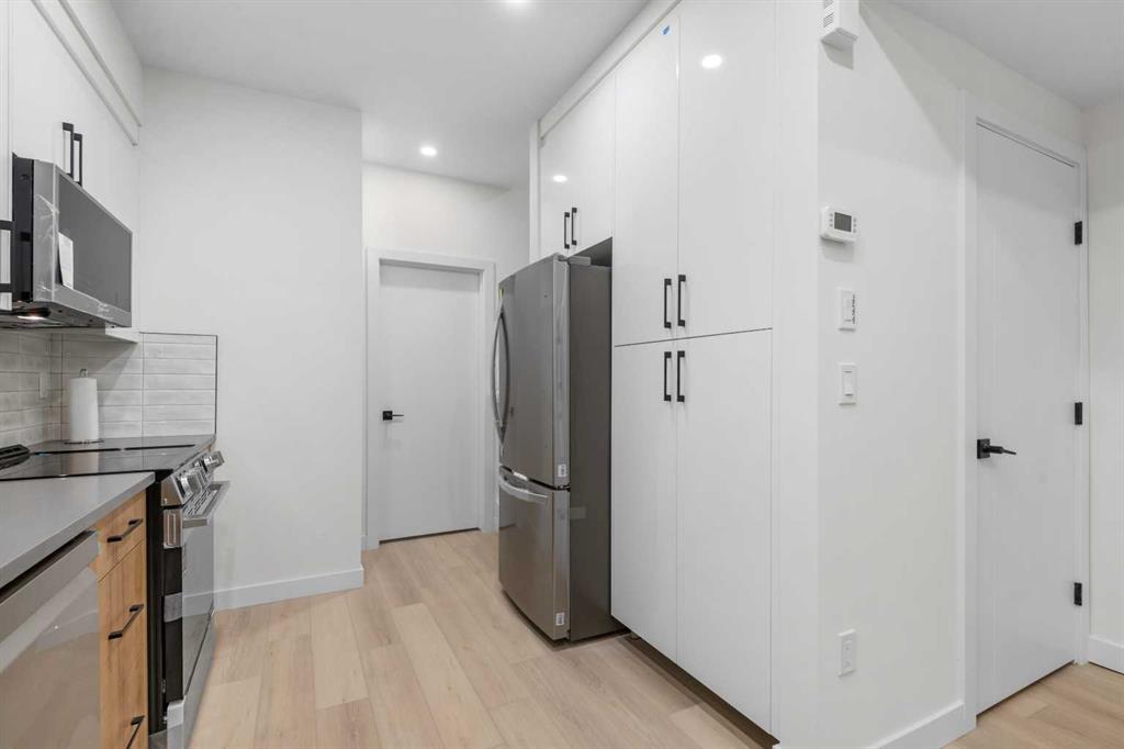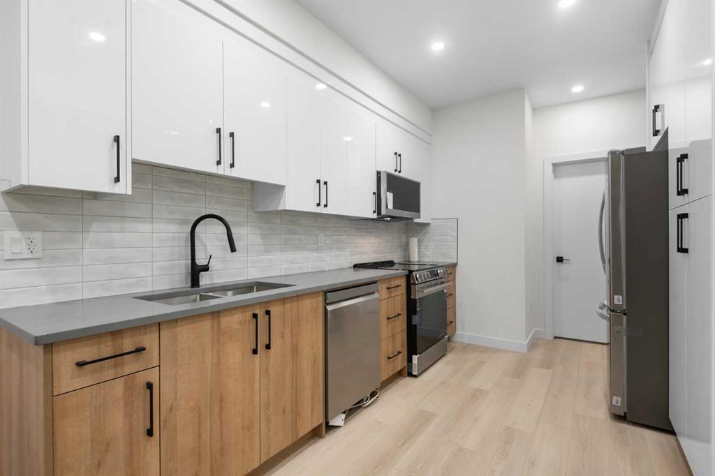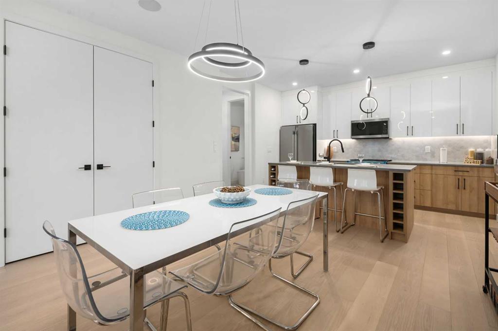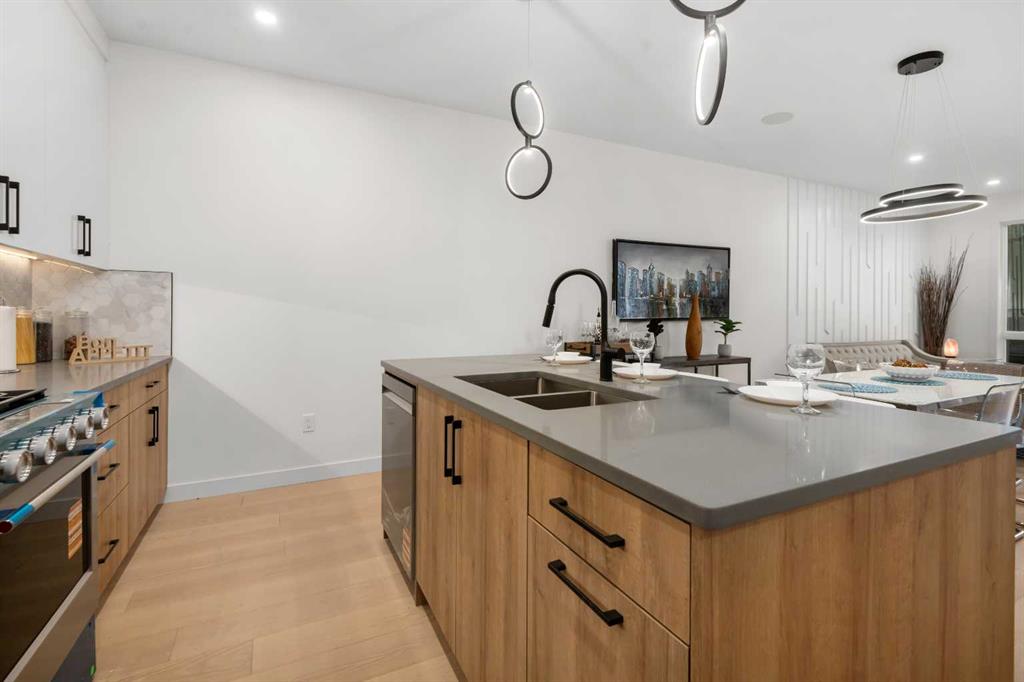 Located on a tree lined street, steps to river park, and the heart of Marda Loop. Featuring over 1800 square feet of space on three levels, and an addtional 570 square feet separate legal basement suite with separate entrance. (Units can be connected to basement directly if desired) High quality modern finishes throuhout this spacious townhouse. Hardwood, quarts, stainless steel appliances, ceramic tiles. Three bedrooms and 3 and a half baths. An excellent main level with living, dining and large kitchen with Island. The upper floor boats two large bedrooms both with large closets and ensuites. The top floor showcases an amazing Primary suite complete with a huge walk in closet, large ensuite with walk in 2 or 3 person shower. Dual sinks, and a full east facing private balcony. Single detached garage for all units. Excellent value as a mortgage helper, home office or just a family suite. Condo plan not yet registered. Can be purchased as a 4 plus 4 unit complex also as an option for investors. A unique complex in a great location.