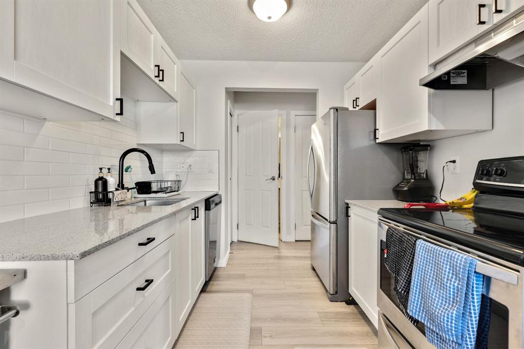 Investors & First-Time Buyers – No Condo Fees! Available for quick possession and welcoming to pets, this beautifully updated townhome offers unbeatable value with style and comfort throughout. Inside, the kitchen stands out with stainless steel appliances, modern cabinetry, quartz counters, a designer backsplash, and a deep basin sink with upgraded faucet. A full pantry adds even more storage. Next to the kitchen, the refreshed half bath features new quartz counters, sink, faucet, and toilet. The main floor living area is bright and versatile, perfect for different furniture layouts. Even the fireplace adds character, whether used as-is or reimagined as a cozy candle feature!! New window coverings, luxury vinyl plank flooring, and a fresh coat of paint on the main and upper levels tie everything together with a clean, contemporary feel. Upstairs you’ll find three spacious bedrooms plus an updated full bathroom with a relaxing soaker tub and a handy linen closet. The lower level offers extra living space, ideal as a family room, games area, or teen retreat. There’s also a bar area, large utility/laundry room, and generous storage!! Practical upgrades include a brand-new furnace, hot water tank (just replaced), and recently updated windows for improved efficiency!! Outside, low-maintenance vinyl siding, a wrap-around deck, and a powered parking stall add convenience, with extra street parking available for guests. The location is excellent, close to schools, shopping, and with quick access to Deerfoot Trail for an easy commute!!