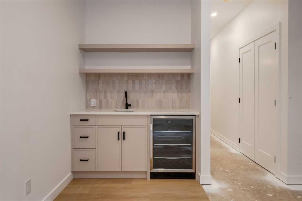 Inside, the home offers over 2,400 sq.ft. of finished living space with 3 bedrooms above grade & a 4th bedroom in the basement with large sunshine windows, along with 3.5 bathrooms. The main floor features flexible living with interchangeable dining, living, and den spaces, a custom fireplace, full height cabinetry, quartz counter-tops, stainless appliances, and luxury hard surface flooring throughout main/upper levels. The primary suite includes a private patio & spa inspired ensuite with walk-in shower and freestanding tub. The lower level includes a custom designed bar & spacious media room, ideal for entertaining. Large windows throughout the home fill the space with natural light, enhancing the modern & refined interior design. The exterior offers a generous backyard with a full custom deck and strong separation from neighbouring homes. Additional features include a detached double car garage, rough-in for air conditioning, a gas line for BBQ, and a durable exterior finished with Hardie board siding and corrugated metal accents. Located in the heart of Bowness, residents enjoy a vibrant community w/ access to a growing mix of local cafes, restaurants, and shops. With quick access to downtown and the mountains, this location offers an exceptional connected lifestyle.