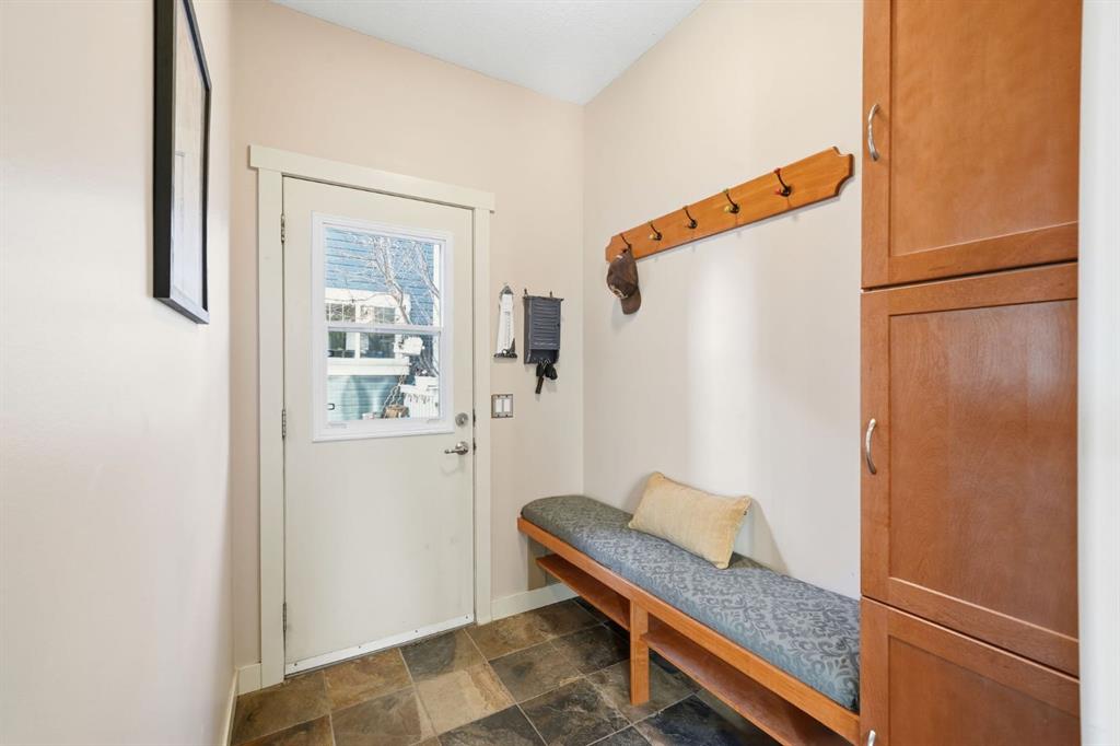 The adjoining living room is both cozy and inviting with a gas fireplace, tile surround, granite hearth, and built-in shelving. A convenient pocket office provides a tucked-away workspace, while the rear entry keeps things organized with a built-in storage bench, hooks, and cabinets. A stylish 2-piece powder room completes the main floor.