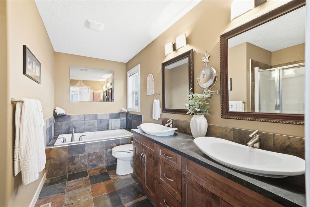 Upstairs, the spacious primary retreat features a walk-in closet and a beautiful ensuite with slate flooring, deep soaker tub, separate shower, and double vanity with vessel sinks. The second bedroom also offers a walk-in closet, and completing the upper level is a 3rd bedrm, 4-pce bath with slate floors, plus a fantastic laundry room with drawers, upper cabinets, & folding counter.