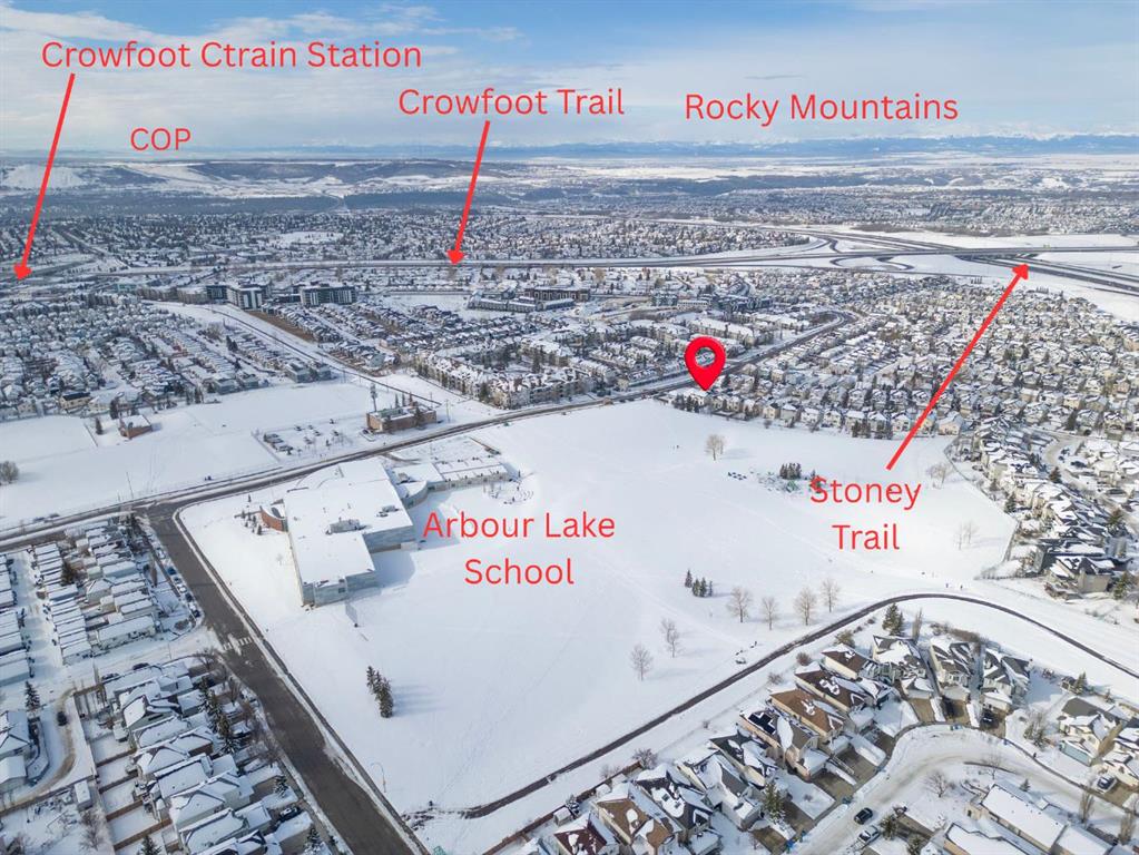 Welcome to this well-maintained home with mountain views from upstairs bedrooms and east facing backyard beside School Playground located in the highly sought-after Only Lake Community of Arbour Lake in NW Calgary. Just 4-minutes walking distance to Arbour Lake School (G5-9), 8-minutes to St. Ambrose School (K-G9) individually and 10 minutes to the community amenities. The main floor provides open concept layouts with a flexible room, a formal dining room with a big side window, a high ceiling living room with large east facing bright windows allowing for tons of natural light in, an updated Kitchen with SS appliances, a large island and a walk-in pantry, and a spacious breakfaster area with a French Door leading to a nice composite deck (2020) to the backyard for outdoor entertaining, a 2-piece powder room and a laundry room leading to the Double Garage. You are impressed by a grand staircase with iron railings leading to the upper floor. It provides a primary bedroom with an east facing large window towards the school playground and to take in the morning sunshine, a walk-in closet, and a 4-piece En-Suite, another two west facing bedrooms with gorgeous mountain views and a family 4-piece bathroom. The basement is unfinished with lots of potential to renovate in the future. The updates include Garage Door (2012), Roof (2013), Interior Paint (2014), Electric Car Charger Circuit (Permit-2019, does not come with Charge Point Charger), Natural Gas Outlet (Permit 2020), A/C (2021), Furnace and Humidifier (2022), Newer Water Softner and Tinted Windows. Arbour Lake offers a great community life, and amenities including year-round lake access for water sports, swimming, skating, tennis courts etc., playgrounds, schools, walking/biking paths, YMCA, Library, Crowfoot Crossing, and the Crowfoot LRT Station. Easy access to major commuting routes such as Crowchild Trail and Stoney Trail to U of C, Downtown, COP and National Parks etc. Call now for your own viewing!