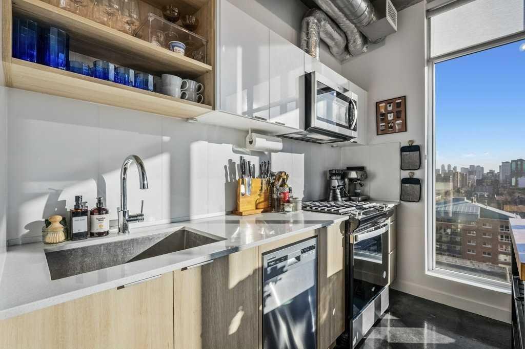 Experience vibrant inner-city living in this striking modern condo at Nude by Battistella, perfectly positioned in Calgary’s coveted Beltline community. This stylish unit offers an exceptional opportunity for both first-time buyers and investors seeking a turnkey property in one of the city’s most walkable and dynamic neighbourhoods. What truly sets this opportunity apart is that Nude is an Airbnb-friendly building, offering incredible flexibility for investors and owners! Step into a thoughtfully designed layout featuring soaring ceilings and expansive floor-to-ceiling windows that flood the space with natural light while showcasing impressive city views. The sleek industrial-chic aesthetic is defined by polished concrete floors, exposed structural elements, and contemporary finishes that create a bold yet welcoming interior. The modern kitchen boasts quartz countertops and stainless-steel appliances, blending form and function for effortless everyday living. Enjoy the convenience of in-suite laundry and a full four-piece bathroom, while the private balcony with a gas hookup expands your living space outdoors — ideal for morning coffee or evening BBQs. Residents of Nude by Battistella benefit from an impressive suite of lifestyle amenities including a rooftop patio with social spaces and panoramic skyline views, a resident lounge and games room, secure bike storage, and direct access to a vibrant streetscape filled with trendy restaurants, boutiques, cafés, and nightlife. The location offers unbeatable connectivity — only minutes to downtown, transit, and major pathways — making urban living effortless. Stylish, smartly appointed, and perfectly positioned — this is city living redefined. Live the Beltline lifestyle you’ve been dreaming of.