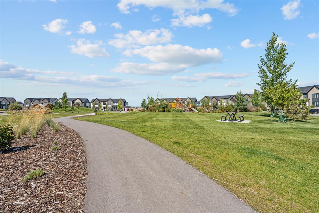 Discover this rare luxury end-unit townhome in Harmony, a former showhome offering a bright and open floorpan with exceptional upgrades, a private yard and an oversized triple garage. With unobstructed mountain views, high-end finishes and access to Harmony’s award-winning amenities, this property blends luxury with everyday convenience. Inside, the open-concept main floor showcases a gourmet kitchen with Bosch appliances, ceiling-height cabinetry, Silgranit sink and functional built-ins in the dining area. A custom wine bar with beverage cooler, wine rack and shelving makes entertaining easy, while the living room is centered around an upgraded designer electric fireplace. Large, bright windows are covered with Hunter Douglas blinds and flood the space with natural light. The primary bedroom is a true retreat, with soaring ceilings, oversized windows capturing the mountains and a walk-in closet with custom built-ins. The spa-inspired ensuite offers a soaker tub, tiled shower, dual sinks and shelving for elegant storage. Two additional bedrooms, a full bath and a well-planned laundry room with cabinetry, countertop and hanging rod complete the upper level. The fully developed basement adds even more living space, with a rec room featuring extensive built-ins, a games or work area, full bathroom and a large multipurpose room. Outdoors, enjoy one of the most desirable layouts among Harmony townhomes for sale, a private yard with concrete patio and spacious grass area, large enough to accommodate a garden, trampoline, pool or play structure. The oversized, drywalled triple garage provides parking and storage space unique to this home. Additional upgrades include air conditioning and sump pump. The showhome furniture is negotiable and all stylish wall art is included, making this stylish home move-in ready. From your doorstep and primary bedroom windows, take in the park and Rocky Mountain views. Just outside, you’ll find everything that makes Harmony a master-planned community, a private lake and beach club, Mickelson National Golf Course, LaunchPad golf facility, adventure zone, a locally owned coffee shop, daycare, dog parks, walking paths and so much more. Want to escape to the mountains for the weekend? Canmore is less than 45 minutes away from your door. If you’re searching for a luxury townhome in Harmony with a triple garage, private yard and stunning mountain views, this is it!