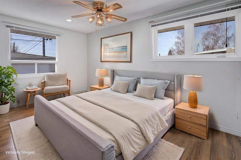 Proudly owned by the original owners since 1965, this well-cared-for bungalow offers classic charm, and incredible potential for future renovations. With its desirable layout and solid construction, this home is the perfect opportunity to personalize while enjoying a property that has been lovingly maintained over the years. The main floor features two bedrooms and two full bathrooms, along with a spacious living room, a dedicated dining area, and a functional kitchen that opens directly onto the back deck – ideal for seamless indoor-outdoor entertaining. The basement presents an excellent renovation opportunity, offering a large recreation room for family gatherings, a generously sized bedroom, a full bathroom, and a spacious utility room providing ample storage and flexibility. The heated garage adds year-round convenience, while the south-facing backyard is perfect for outdoor enjoyment. For gardeners, you will enjoy the beautifully maintained flower beds complete with a mature crabapple tree – ideal for late summer harvesting! Situated in a quiet neighbourhood with only one next door neighbour and convenient alley access, this property offers added privacy. With parking for up to 6 vehicles, there’s plenty of space for family and guests. Some upgrades to appliances include refrigerator in the kitchen (2023), furnace (2019), hot water tank (2015 only used by 2 people). The shingles on the house and garage were replaced in 2017. While the home may require some more updating, it presents a fantastic opportunity to renovate, customize, or enjoy as-is. A rare find with great bones in a peaceful setting—don’t miss your chance to make it your own!