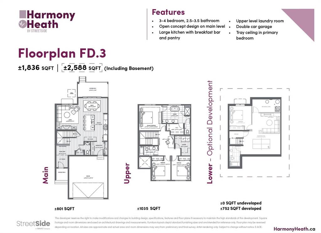 Experience the height of sophisticated living in this highly coveted luxury townhome, where a generous floor plan meets modern comfort and refined finishes. Proudly presented by StreetSide – this thoughtfully designed unit features 3 bedrooms, 2.5 bathrooms, and a front attached double car garage. The heart of the home is a spacious kitchen with a large central island, polished white quartz countertops, upgraded stainless steel appliances, and elegant sliding French patio doors that open to your covered deck area—ideal for both everyday living and entertaining. Light floods into the living room with ease through the large window, while luxury vinyl plank flooring flows throughout the main floor living areas, and carpeted stairs leading to the upper level and bedrooms provide extra warmth. The primary ensuite is a private sanctuary, complete with tile flooring, double sinks, a freestanding soaker tub, and an oversized tile-and-glass shower delivering spa-inspired comfort at home. The unfinished basement with roughed-in plumbing provides future potential for additional living space tailored to your needs. Professional landscaping and fencing complete your new home. Ideally located in the award-winning community of Harmony, residents enjoy Mickelson National Golf Course, private lake amenities, scenic walking and biking trails, and a wellness-focused lifestyle—just a shorty drive from Calgary city minutes and 45 minutes from the Rocky Mountains, where nature and convenience come together effortlessly. Please note Photos are renderings.