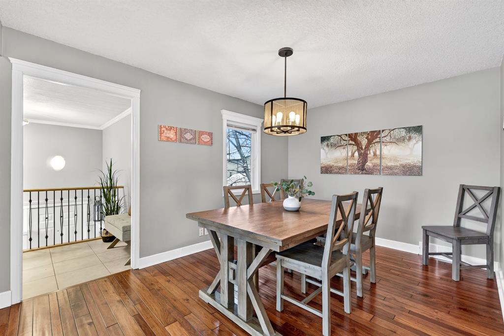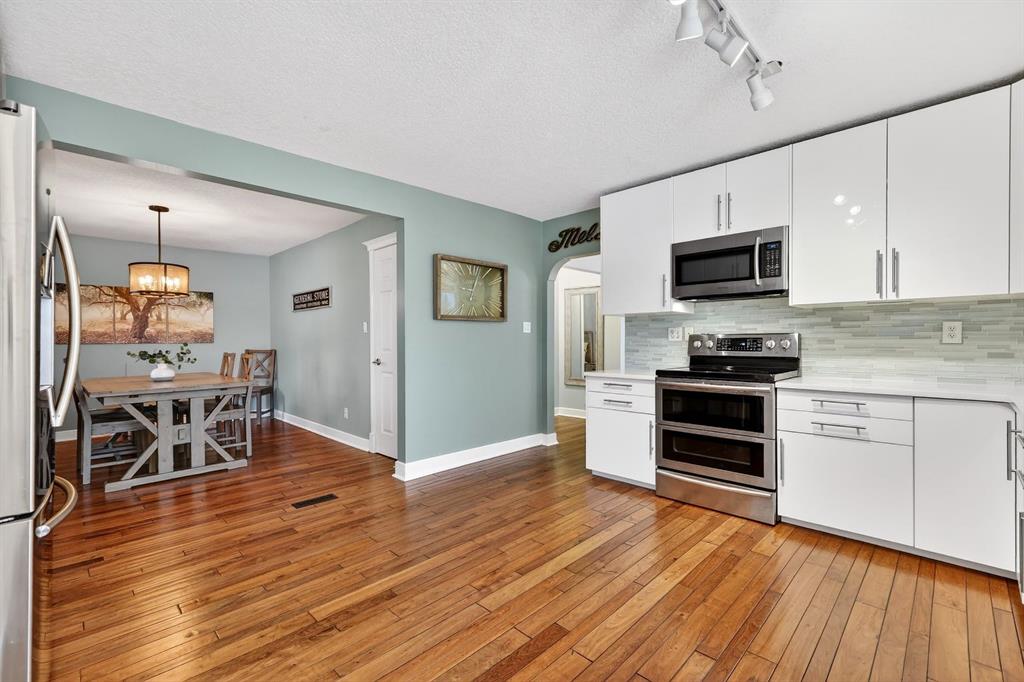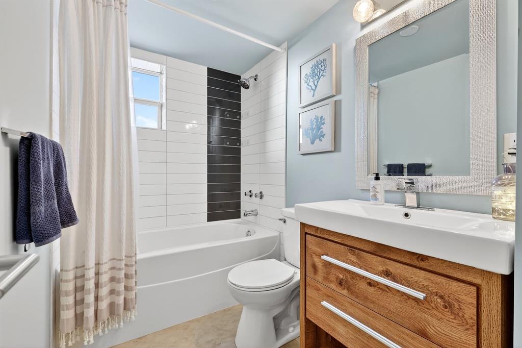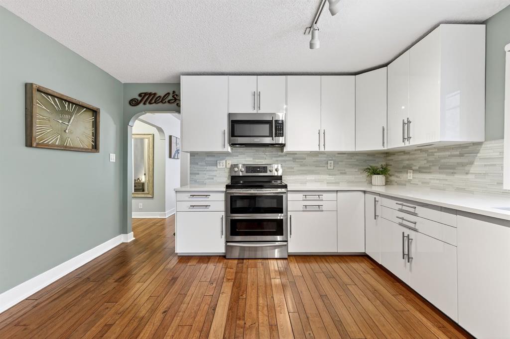 The oversized kitchen is a chef’s dream, showcasing stunning white cabinetry, quartz countertops, stainless steel appliances, and direct access to the formal dining room—perfect for entertaining. The beautifully renovated main-floor bathroom features a new window and custom tilework.