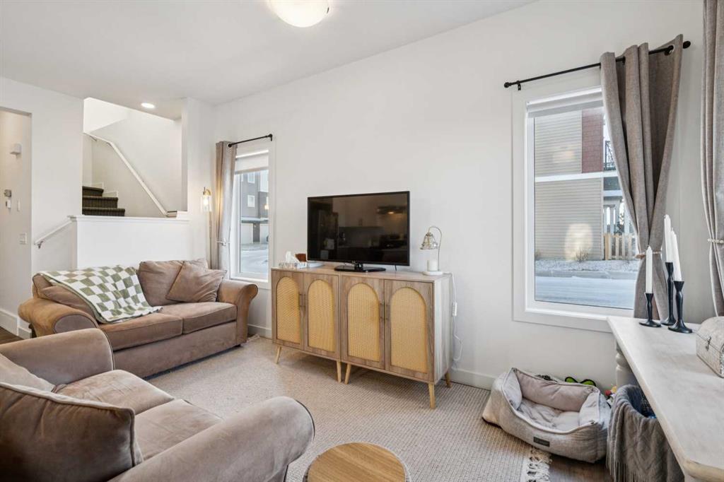 Discover the charm of contemporary living in this thoughtfully designed townhome. Filled with natural light from ample windows, the open-concept layout spans three inviting levels and offers beautiful mountain views. The stylish kitchen includes sophisticated cabinetry, quartz counters, a generous island, and stainless steel appliances. Offering 3 bedrooms, 2.5 baths. This home provides flexible living spaces. The primary bedroom boasts ample storage and direct access to the ensuite bath featuring a luxurious deep soaker tub/shower combo. A convenient half bath on the main level enhances functionality. Features include vinyl plank floors, main-level laundry, complete blinds, a single garage, and driveway plus street parking. Enjoy nearby pathways, local shopping, and convenient access to both Calgary and mountain adventures.