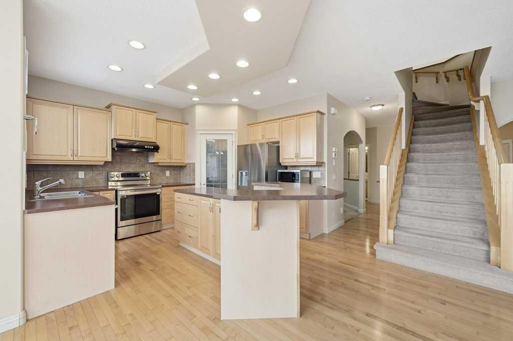The main floor and basement feature 9-foot ceilings, complemented by numerous large windows that flood the home with natural light. The spacious kitchen offers ample cabinetry, stainless steel appliances (new fridge, new dishwasher, newer stove), a large corner pantry, and a raised breakfast bar. The kitchen also features a drop-down ceiling with plenty of pot lights, creating a warm and functional cooking space. Oak hardwood flooring and carpet flow throughout the main floor, and the living room is anchored by a cozy fireplace.