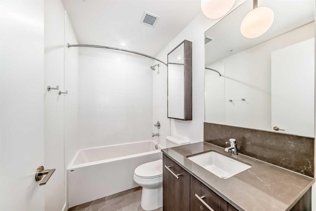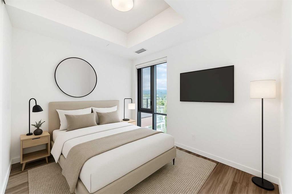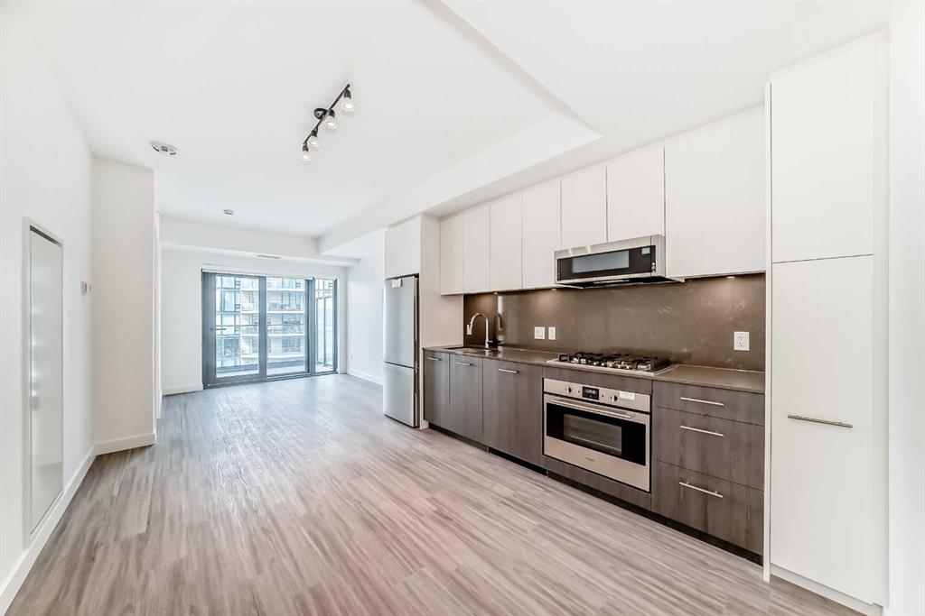 First & Park by Graywood Developments, located in Calgary’s sought-after Eau Claire neighbourhood. This new unit offers clear views of the Bow River and Peace Bridge, just steps from Prince’s Island Park, downtown offices, and river pathways. The open-concept layout features 9-foot ceilings, floor to-ceiling windows, and durable vinyl plank flooring. The kitchen includes Fulgor stainless steel appliances, a gas cooktop and quartz counters. The primary bedroom has its own ensuite and walk-through closet. A second full bathroom and bedroom offer flexibility for guests or roommates. Enjoy in-unit laundry, air conditioning, titled underground parking, and a private balcony with river views. Building amenities include a gym, meeting room, lounge, bike storage, visitor parking, and daytime concierge. Ideal for professionals or downsizers looking for a low-maintenance lifestyle in a central location.