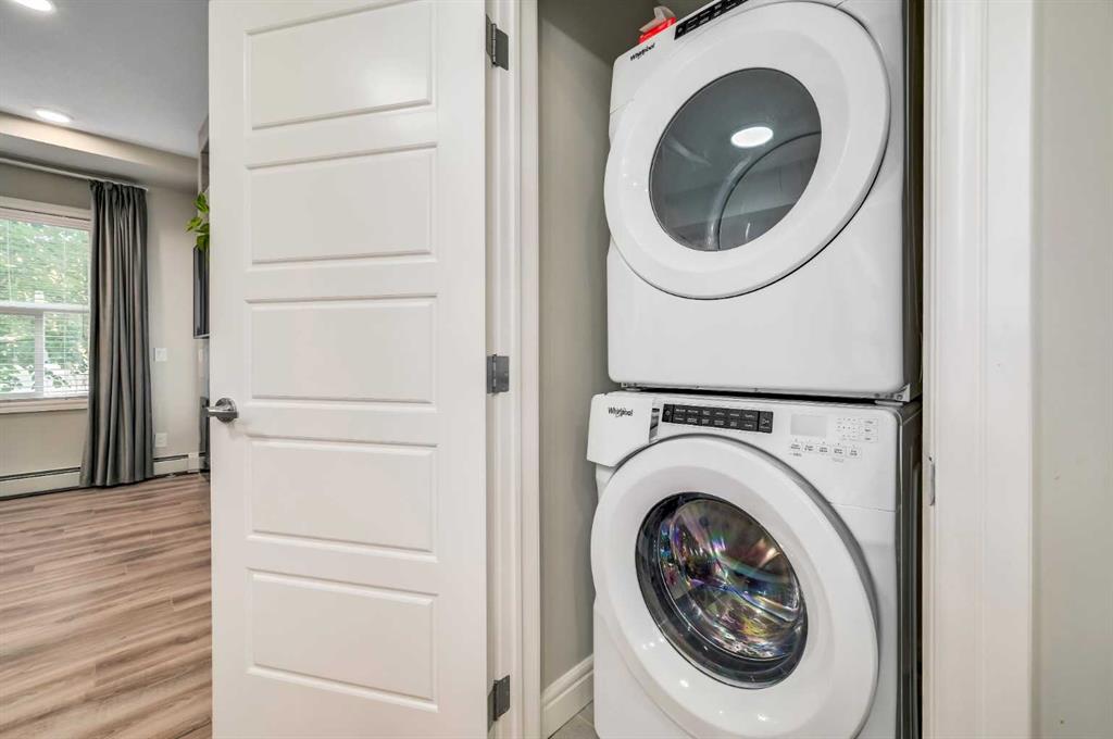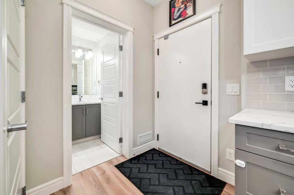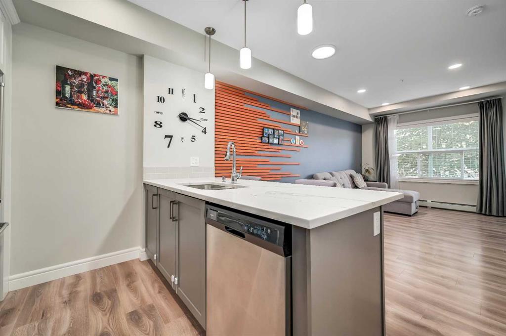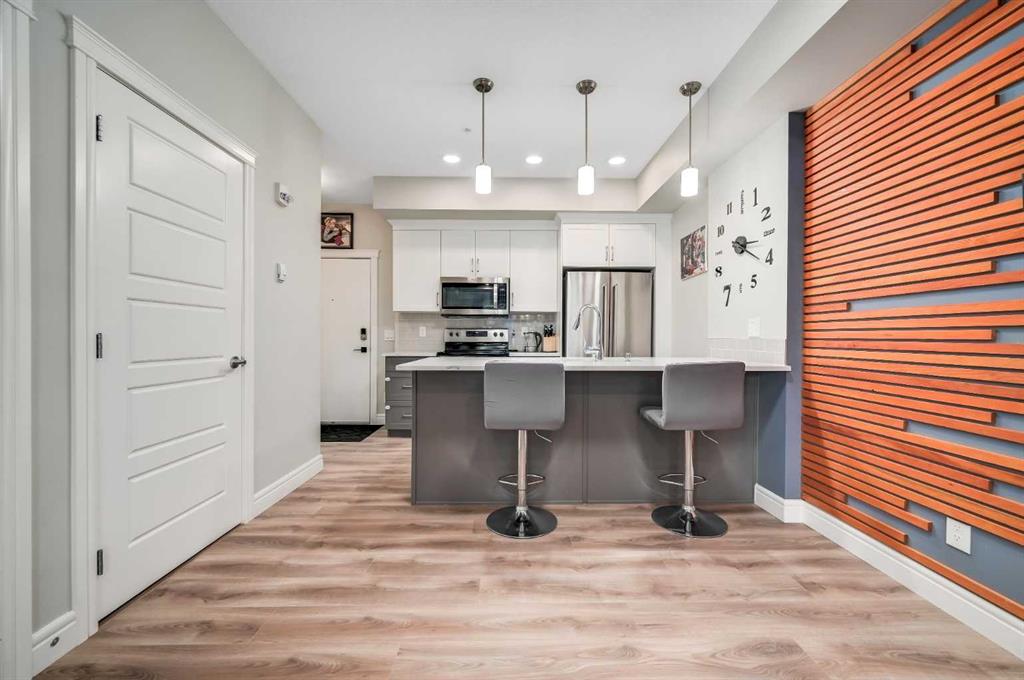 Exceptional, turnkey value in this well upgraded unit in desirable Seton! Just steps to all amenities including restaurants, Seton YMCA, scenic walking & bike pathway system, Cineplex VIP, nightlife, shops, big box retailers, & the South Health Campus medical center! Leave the car at home and enjoy the relaxed atmosphere of Seton away from the hustle and bustle of Calgary’s core. Like new unit, with a modern open plan and tall 9′ ceilings. Substantially upgraded from the standard builder’s package with deluxe stainless-steel appliances, quartz countertops throughout, stained wood feature wall, & built-in fireplace with tile clad full height surround! Upgraded full bathroom with custom marble style tilework & full body shower jets. Quiet, main floor unit with ground level patio ideal for pets! Luxury vinyl plank flooring throughout the unit, with designer chosen colors. In-suite laundry & heated underground parking + visitor spots. Ample parking for visitors & free street parking is nearby & abundant. Well managed building with very low condo fees, just pay electricity! Incredibly affordable home in a fantastic location in Seton, or a smart investment for someone looking to capitalize on proximity to the South Health Campus, Calgary’s newest and state-of-the-art medical center.