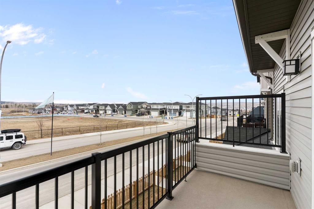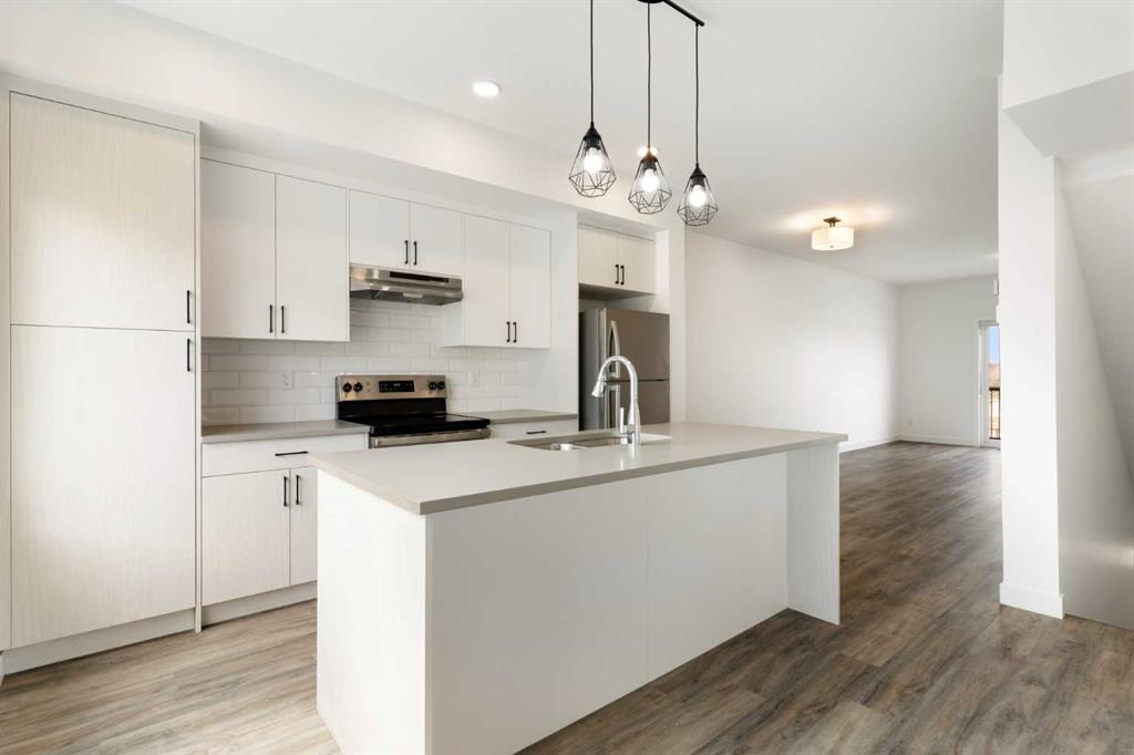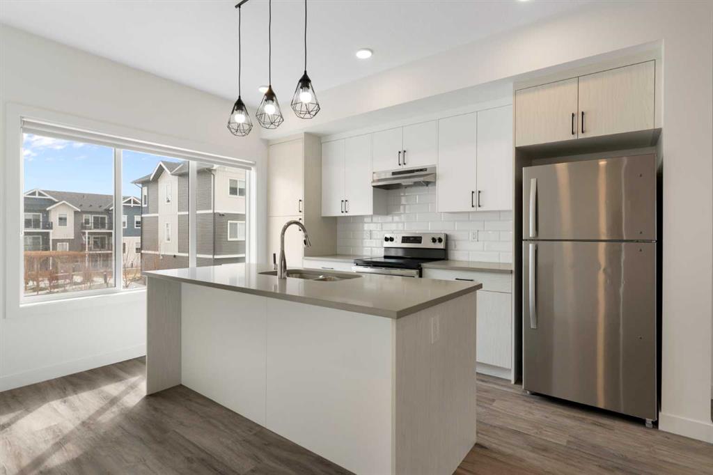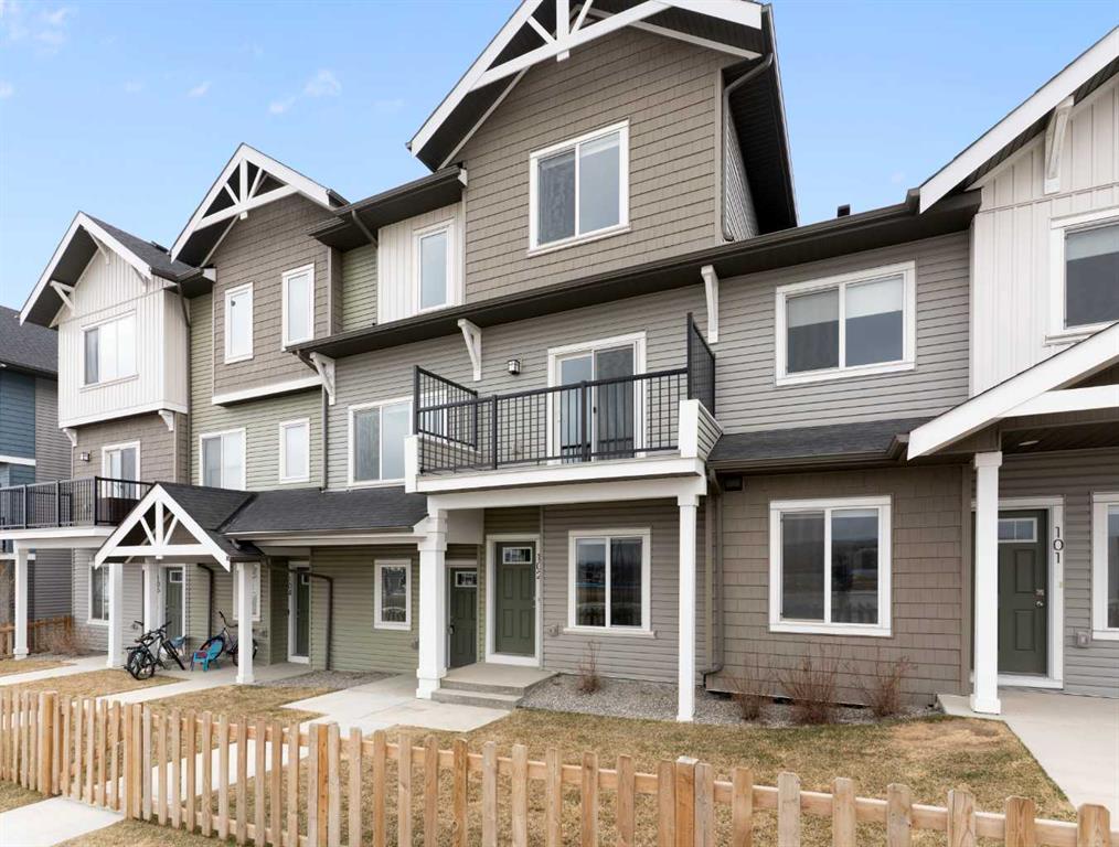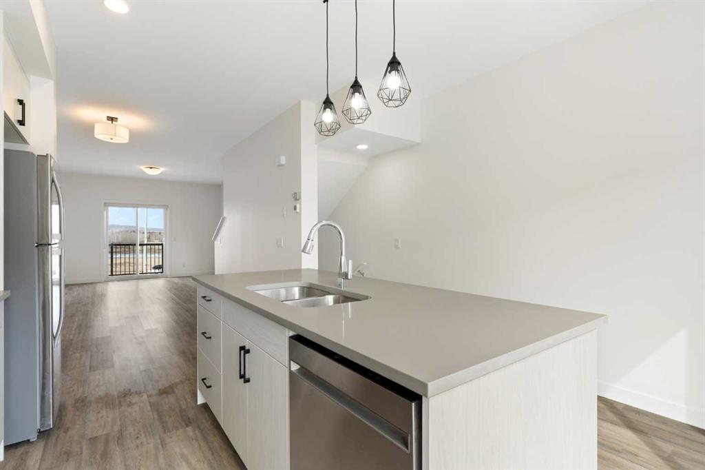 Experience the best of modern living in this lightly lived in Cochrane townhome. , enjoy a west facing backdrop! Located directly across from the future Rivercrest School! and offering stunning Mountain Views! The last interior unit with a deck facing the Mountains! Inside, discover a bright, open-concept haven designed for both entertaining and everyday comfort. The kitchen is the heart of the home, featuring a sprawling white quartz island perfect for casual meals or lively gatherings. You’ll love the sleek two-tone cabinetry with soft-close drawers, a full GE stainless steel appliance package, ample cabinet space, and a pantry, all illuminated by stylish pendant lighting. Large windows on both sides of the unit flood the space with natural light, highlighting the durable vinyl plank floors and soaring, knock-down textured ceilings. Pull-down window coverings offer privacy and shade when desired, while the adjacent living room provides a natural gathering spot. This meticulously designed townhome offers two spacious bedrooms, 2.5 baths, and a versatile flex space on the main level—perfect for a home office, guest room, or creative studio. The primary suite on the third level boasts dual closets for ample storage and large windows and its own 4pc ensuite. This level also features a convenient laundry area and a full 4-piece bath for the other bedroom. Convenience is paramount with the oversized, fully insulated single-car garage, with dual access (doors on both sides of the unit) Location is key! Nestled in a fantastic complex, you’re just steps from shopping, scenic pathways, and the tranquil Bow River. Bow Valley High School is close by, with a Cochrane’s newest school (K-8 Breaking ground this Spring) conveniently located next door , and local transit is mere steps away. Enjoy quick access to Calgary for work or entertainment and the majestic mountains for weekend adventures.