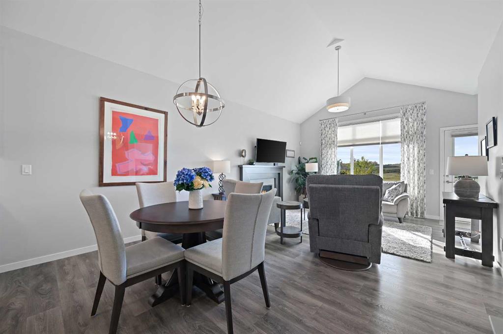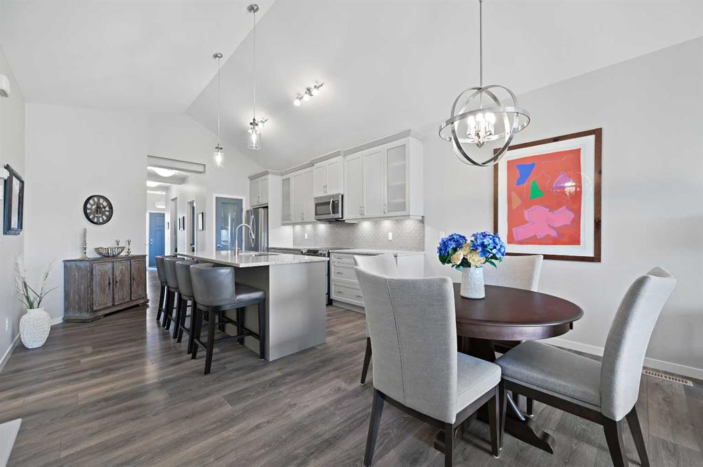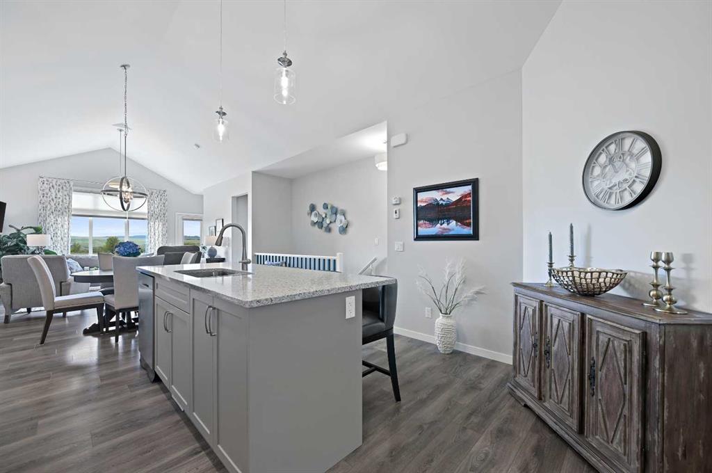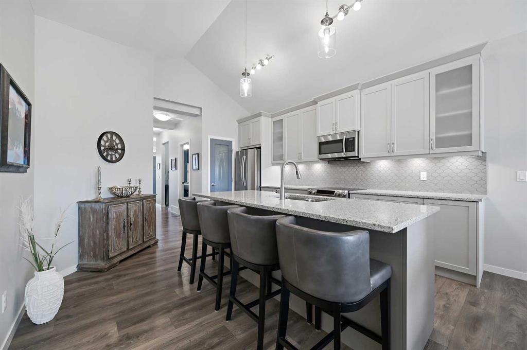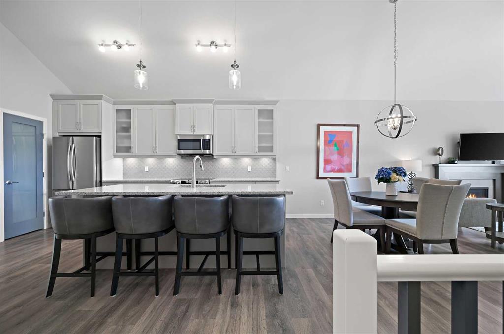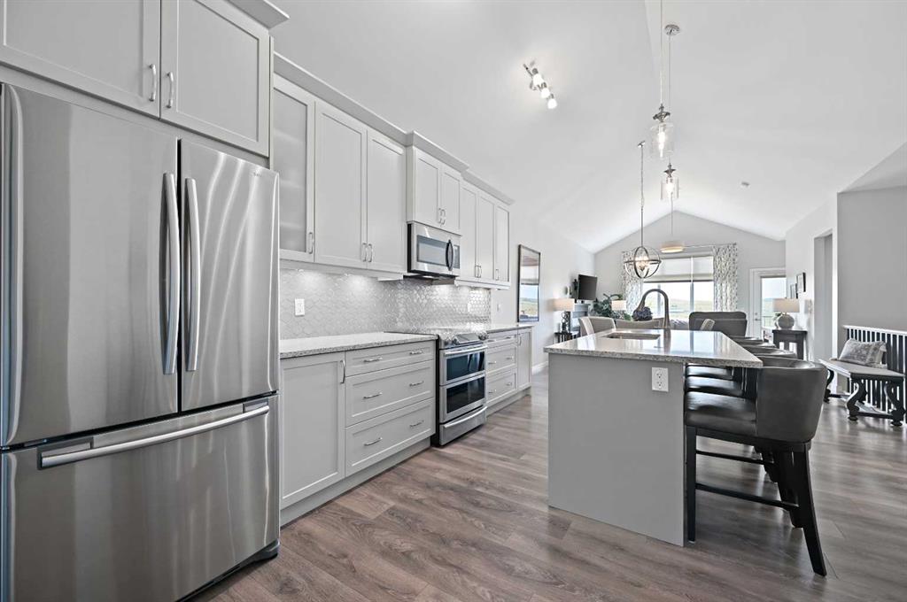 Inside, vaulted ceilings and luxury vinyl plank flooring create an airy, modern feel across the main level. The heart of the home is the open-concept kitchen, designed to impress with its stainless-steel range, quartz countertops, freshly refinished extended-height cabinetry that is in like new condition with modern designer colors, and large island that flows seamlessly into the dining area and cozy living room—complete with a gas fireplace. Whether you’re hosting family or enjoying a quiet evening, this space feels both welcoming and refined.