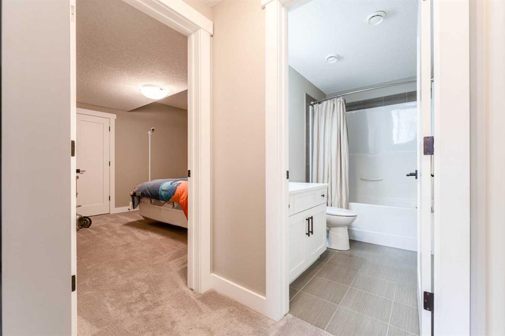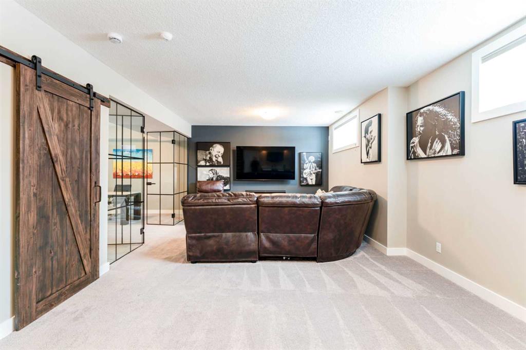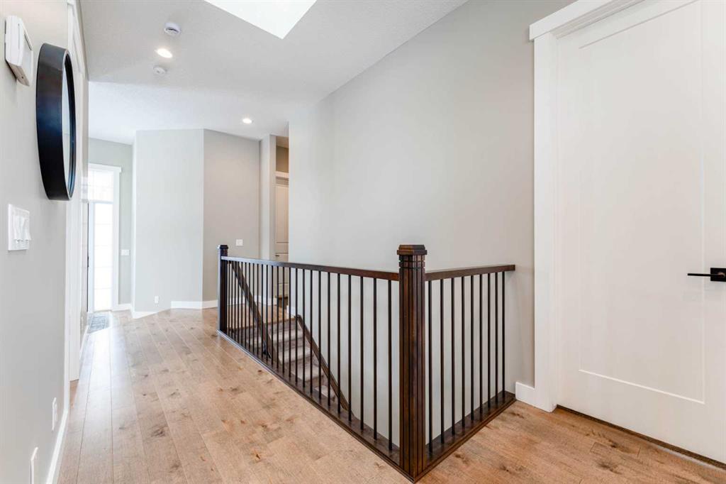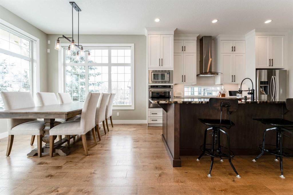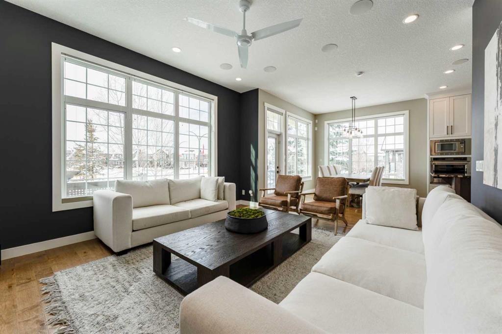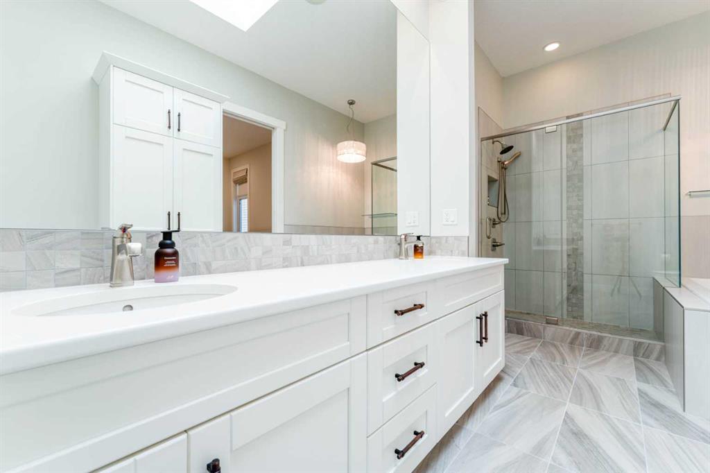 This beautifully crafted custom bungalow offers the perfect blend of modern elegance and thoughtful design, ideally located in the highly sought-after community of Coopers Crossing. Situated on a premium lot backing onto a park, and pathways with water features. This home provides both privacy and exceptional outdoor access. Flooded with natural light, the main level features expansive windows, two large skylights, and stylish upgraded lighting throughout. The open-concept layout is enhanced by 10’ ceilings, engineered hardwood flooring, a neutral colour palette, and a welcoming spacious entry. The living room is a true focal point, highlighted by a floor-to-ceiling feature wall with modern tile and a sleek linear fireplace. The adjacent dining area flows seamlessly into the chef-inspired kitchen, complete with granite and quartz countertops, a copper sink, a large central island, high-end appliances including an induction cooktop, and an abundance of custom cabinetry and pantry space. From here, step out to the beautifully landscaped backyard—perfect for entertaining or relaxing in your own private oasis. The primary suite is designed as a retreat, featuring a spa-like ensuite with skylight, dual sinks, quartz vanity, soaker tub, oversized glass and tile shower, and a walk-through closet with direct access to the laundry room. A convenient 2-piece powder room completes the main floor. The fully developed basement offers exceptional additional living space, including a large media/family room, a versatile office or bedroom with custom glass walls, a spacious bedroom, a full 4-piece bathroom, and ample storage room. Additional highlights include a multi-zone Sonos sound system, upgraded front door, phantom screens, exterior programmable lights, and beautiful exterior stone detailing. The garage is fully equipped with an upgraded door, side-mount opener, 220V power, and built-in metal cabinetry, and additional storage features. Outside, the private yard features professional landscaping, a composite deck, custom built wood Pergola, and tranquil views—ideal for summer enjoyment. All of this, just moments from Discovery Park, expansive pathway systems, schools, shopping and a wide range of amenities.