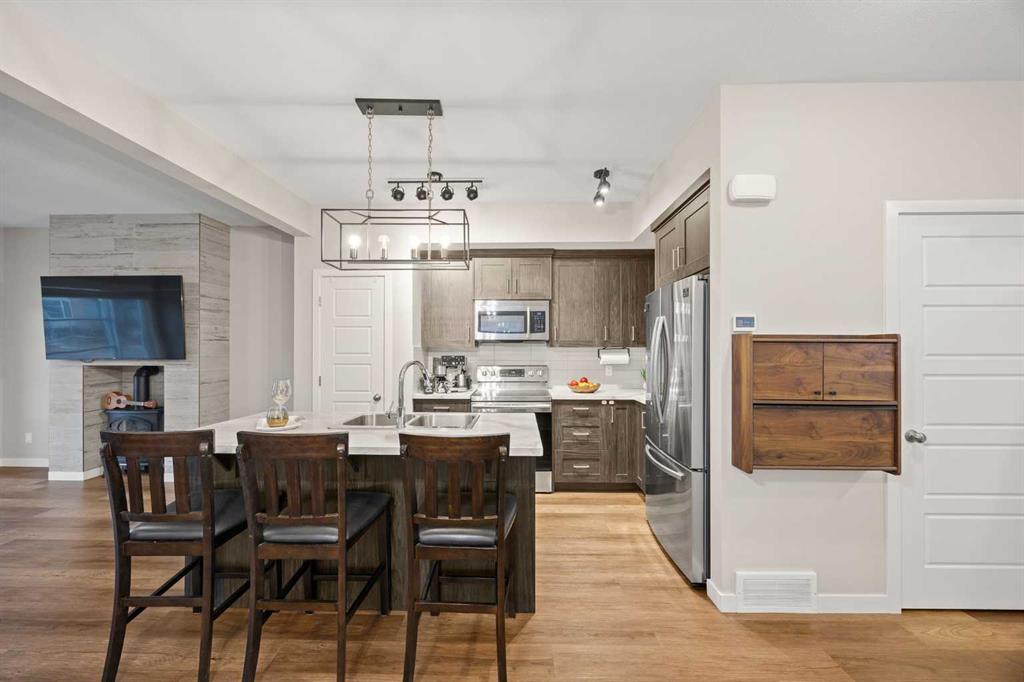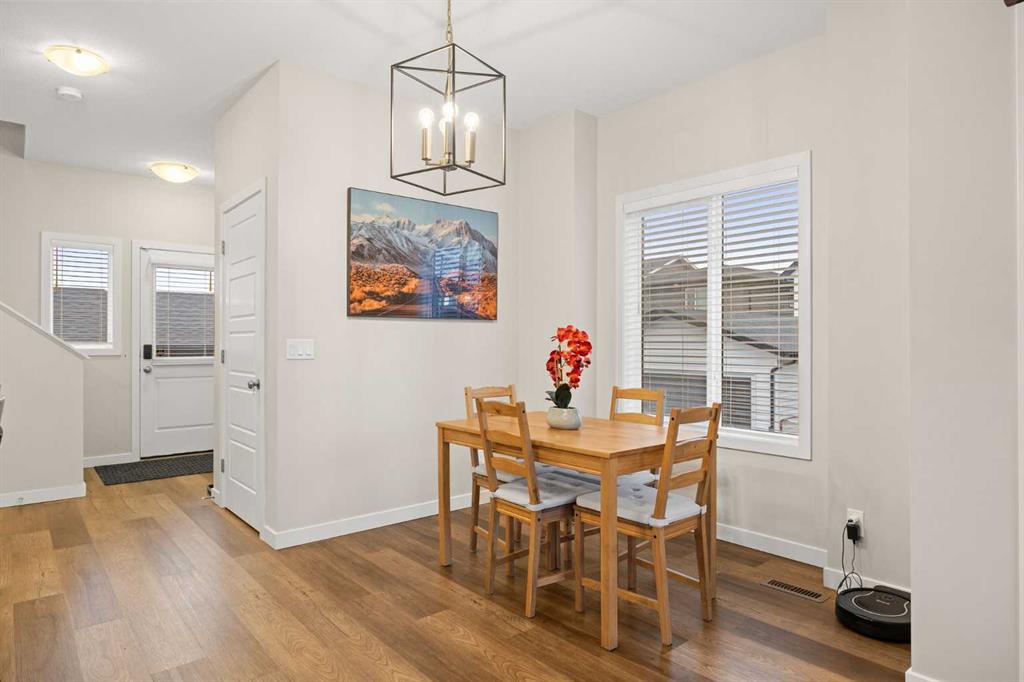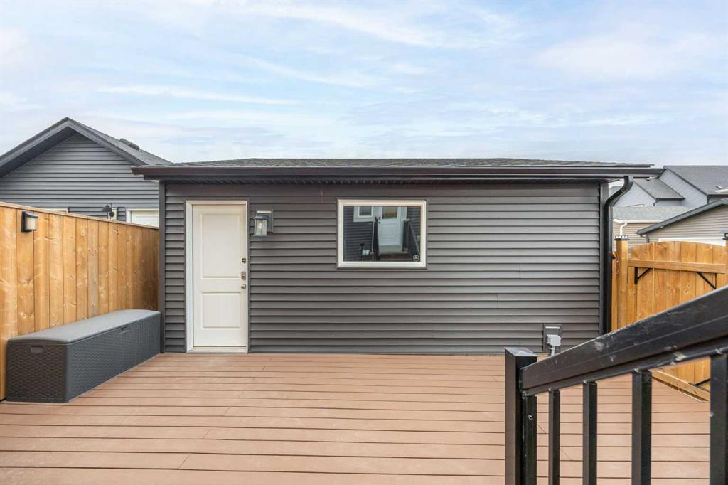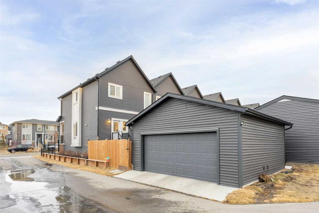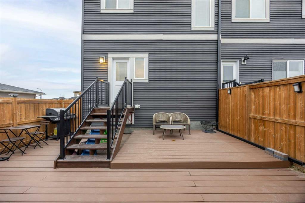 Welcome to this stunning end-unit townhouse in the desirable community of Lanark, Airdrie, offering the rare advantage of NO CONDO FEES and the pride of ownership you’d expect from a former showhome. From the moment you arrive, the home’s beautifully landscaped curb appeal creates a warm and welcoming first impression. Step inside to an open concept main floor, with vinyl plank flooring throughout, designed to feel bright, airy, and inviting. The living area is positioned at the front of the home and is filled with natural light from a large window, complemented by a cozy electric fireplace with an elegant decorative tile surround, a wonderful space to relax or entertain. The L-shaped kitchen is both stylish and functional, ideal for hosting family and friends. It features an island with seating, stainless steel appliances, ample counter space, a pantry, and a dining area that comfortably fits a table for four. A thoughtfully designed built-in storage cabinet that converts into a cozy study desk adds versatility and charm to the space. This level also includes a convenient half bath, a laundry room with stacked washer and dryer, and direct access to the fully fenced, south facing backyard. The outdoor space is completely maintenance-free, highlighted by a large composite deck and access to the double detached garage. Upstairs, you’ll find a spacious primary retreat complete with a walk-in closet and a private ensuite featuring a large vanity with excellent storage and timeless finishes. Two additional well sized bedrooms, a full 4-piece bathroom, and a handy linen closet complete the upper level, offering plenty of room for family or guests. The unfinished basement provides endless potential, already roughed in for a future bathroom and featuring two windows, making it easy to customize the space to suit your family’s needs, whether that’s a home gym, rec room, or additional bedrooms. This home has been beautifully maintained and is truly move-in ready. An exceptional bonus is the corner unit location, which allows space to park a third vehicle beside the garage without obstructing traffic, a rare and very convenient feature!