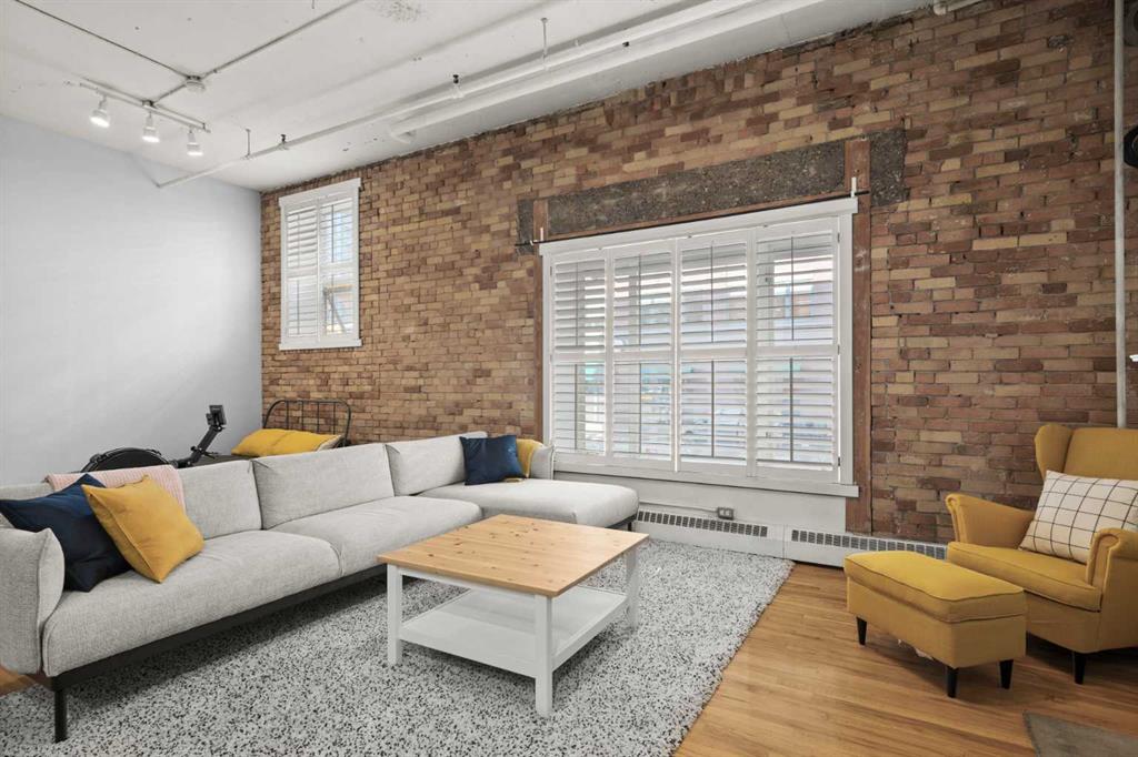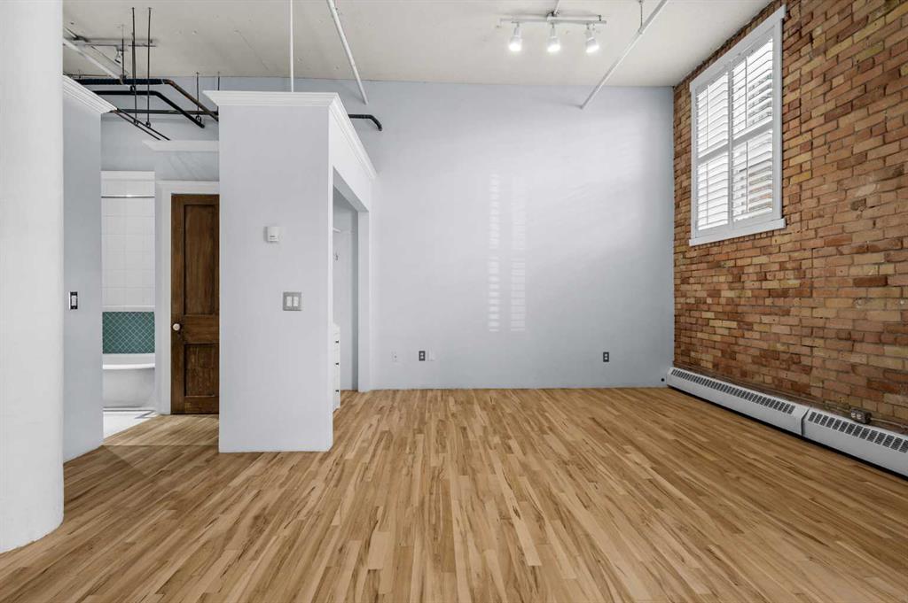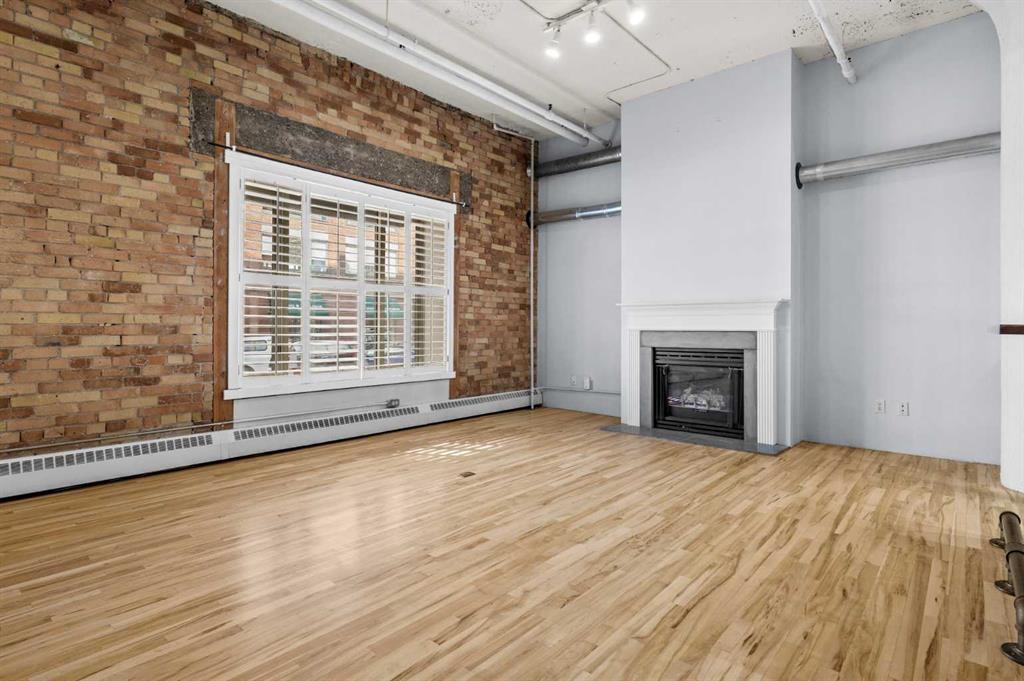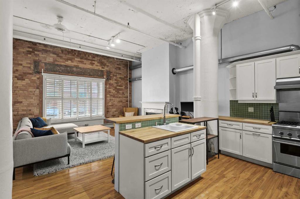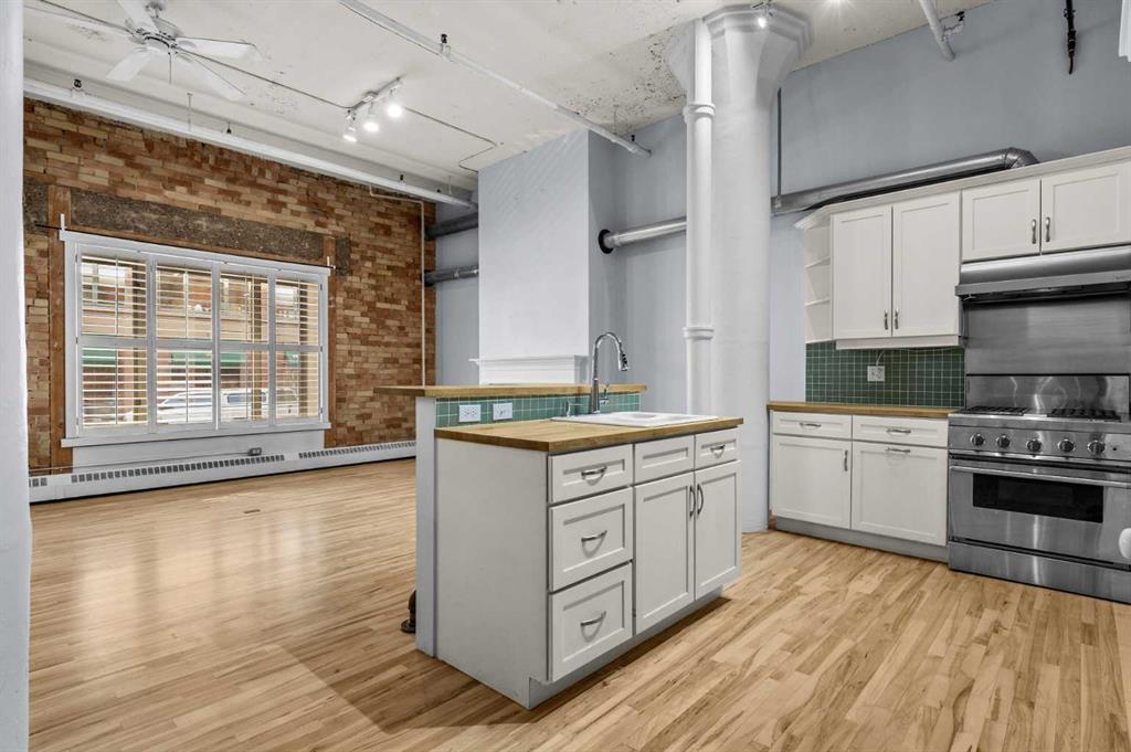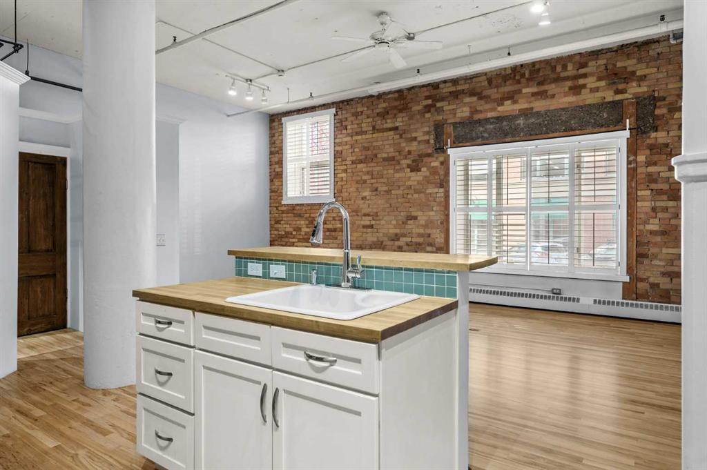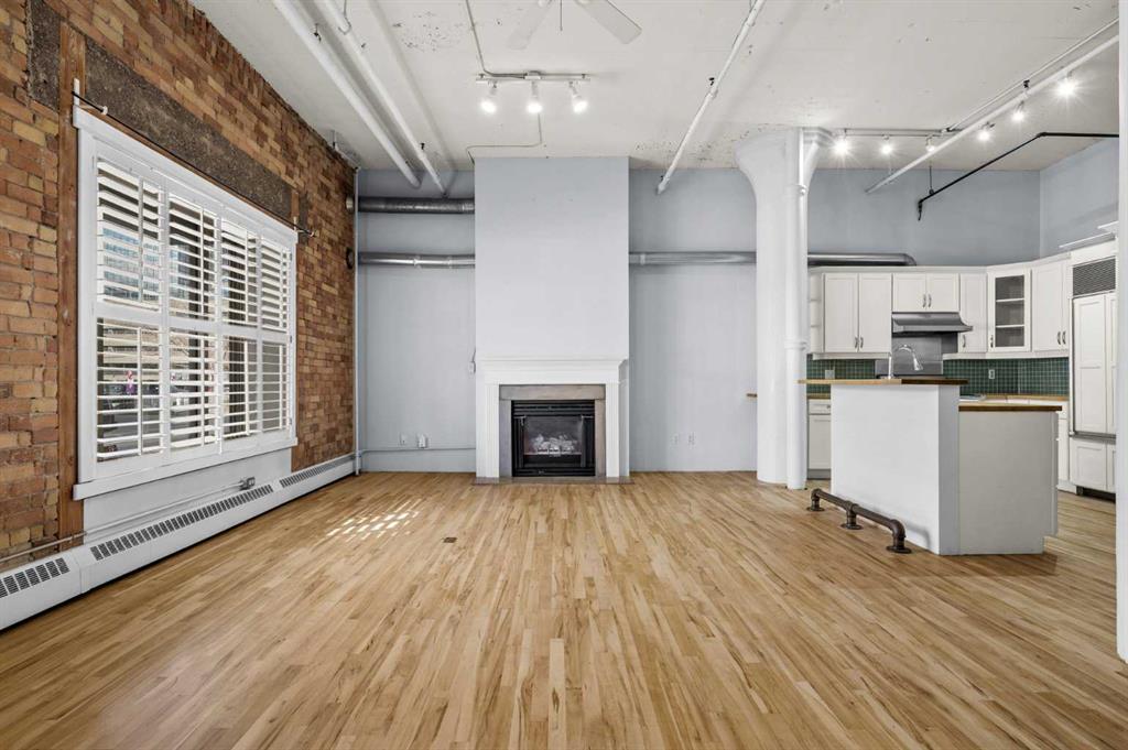 Welcome to the Lewis Loft Building, a historic gem nestled in the vibrant Beltline district of Downtown Calgary. This stunning unit boasts an open layout that seamlessly combines modern luxury with vintage charm. Hardwood floors and soaring high ceilings complement the exposed brick walls, creating an inviting and spacious atmosphere. The kitchen features stainless steel appliances, gas range, and striking butcher block countertops. A breakfast bar and ample cupboard space make this kitchen as functional as it is stylish. The living room is a cozy retreat with a large window that floods the space with natural light and a gas fireplace that adds a touch of warmth and elegance. Convenience is key with in-suite laundry, underground heated parking ( #45), and an additional storage locker (#56). Note the exceptional roof top retreat/patio area just one floor above. Attention to detail and meticulous care of this unit includes … Floors – repaired, sanded and refinished (January), ceiling painted (March), unit painted (2022), cabinets refinished (2024), wash/dryer (2022). The location is unbeatable, situated close to transit, tennis courts, parks, and an array of restaurants. Just a few blocks from both Stephen Avenue and 17th Avenue, you’ll be in the heart of Calgary’s cultural and social scene. Lewis Lofts is in the process of applying for Heritage Status. Pet lovers will be pleased to know that, with Board approval, the Lewis Loft Building allows for one dog and one cat or two cat. Come and experience the perfect blend of historic character and contemporary comfort.