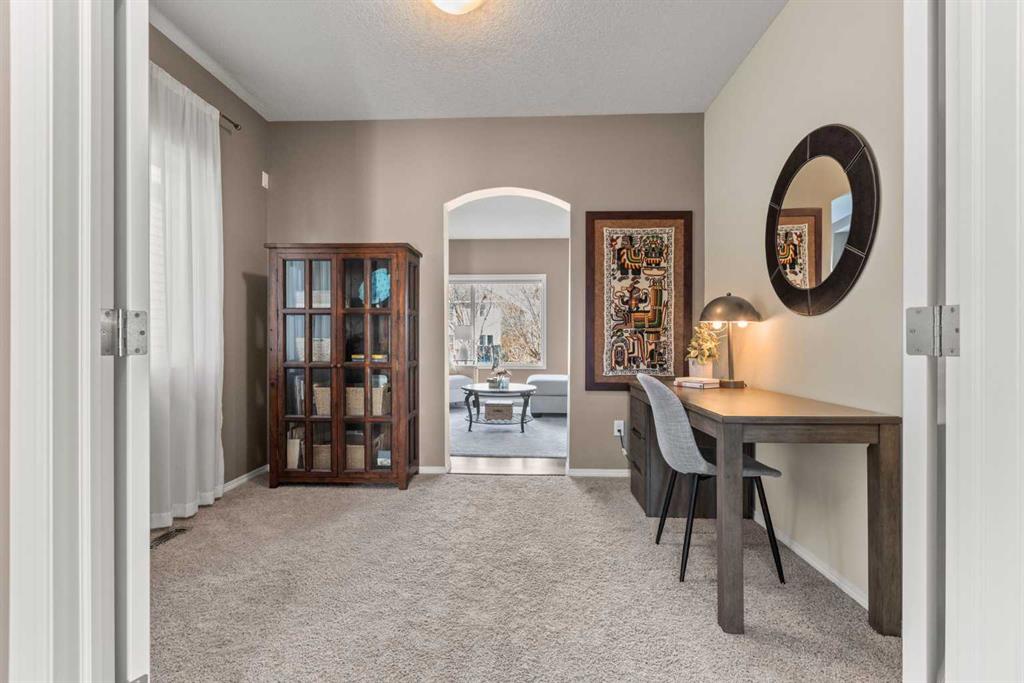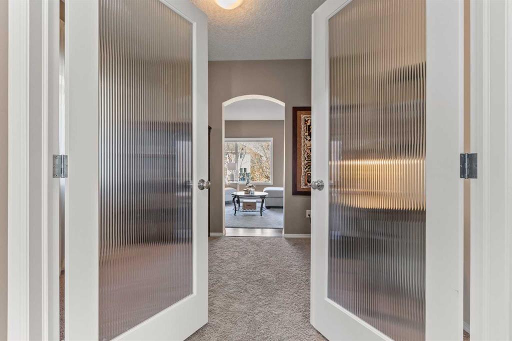 Step inside the grand two-storey foyer, where soaring ceilings and a wrought-iron staircase immediately make an impression. Overlooking the entryway, the open upper hallway—also wrapped in wrought iron—adds architectural drama and a sense of spaciousness. Just off the foyer, French doors open to a bright and versatile flex room, perfect for a home office, den, or library.