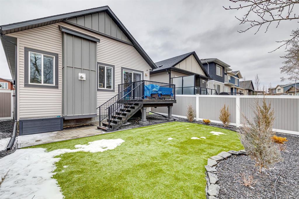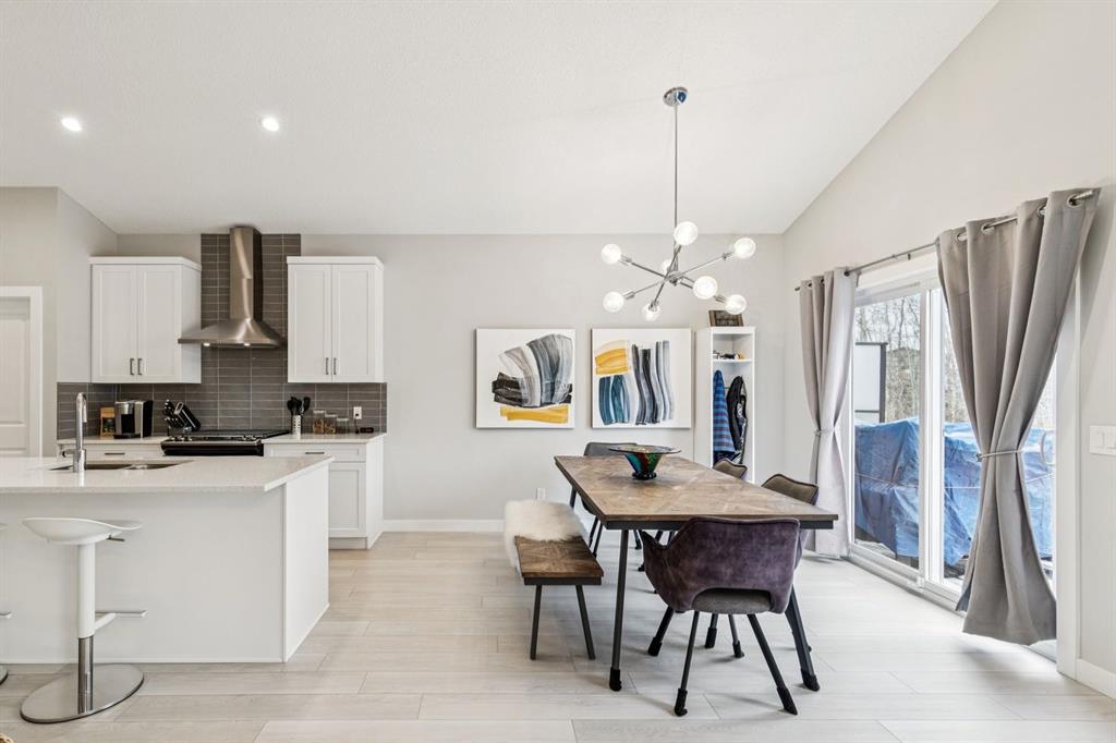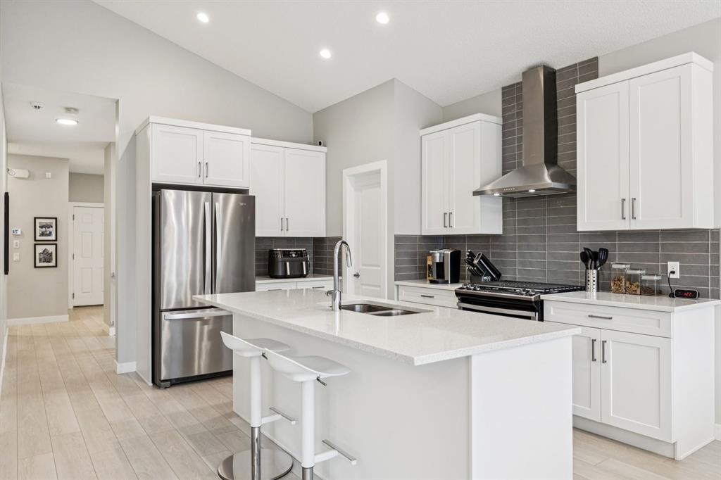 RARE! SPACIOUS BUNGALOW WITH ATTACHED DOUBLE GARAGE THAT BACKS ONTO TREED RESERVE! This home features vaulted ceilings in the main level, loads of sunny windows and a functional floorpan. BASEMENT FULLY FINISHED BY BUILDER. Exceptional design with modern colours and finishes. Kitchen boasts quartz counters, a gas range and loads of counter space. Open to the dining and living spaces, this is ideal for entertaining. Living room with cost gas fireplace and views of the trees on the reserve out back. Dining room next to large sunny patio doors. MAIN FLOOR OFFICE/DEN is ideal for working from home! Primary bedroom is massive and has a stunning ensuite with double sinks and stand up shower. Basement fully finished with high ceilings, 2 additional full-sized bedrooms, a full bath, lovely rec room and loads of storage. What a great place for movie nights! Backyard is landscaped with fake grass and lots of rock scapes and low maintenance shrubs. In-ground irrigation for your convenience. Deck off the upper dining room is ideal for catching the morning sun. BBQ with your built-in gas line and enjoy a maintenance free yard, fully private from homes behind you due to the treed reserve. CENTRAL AIR CONDITIONING IN THIS HOME. Garage is clean as a whistle. These bungalows rarely come up for sale and were built in limited quantity. WELCOME HOME! **QUICK POSSESSION AVAILABLE.**