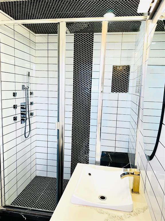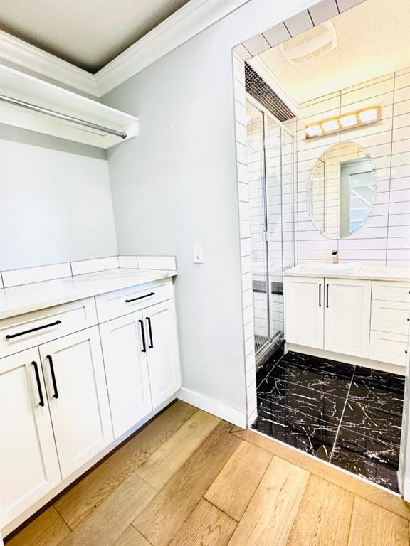 The gourmet kitchen is a true chef’s delight, featuring sleek, shaker-painted cabinets. It is equipped with premium Whirlpool stainless black series appliances, including a built-in oven and microwave, a gas cooktop, and a 36-inch French door refrigerator. A functional island with its own LED lighting completes this beautiful, practical space.