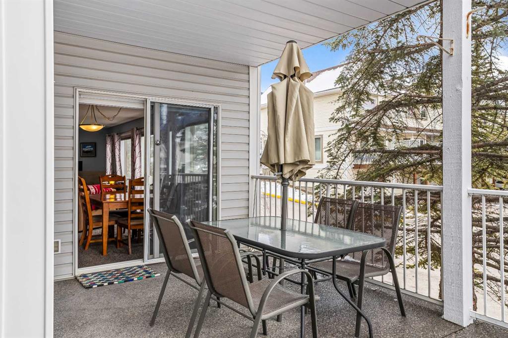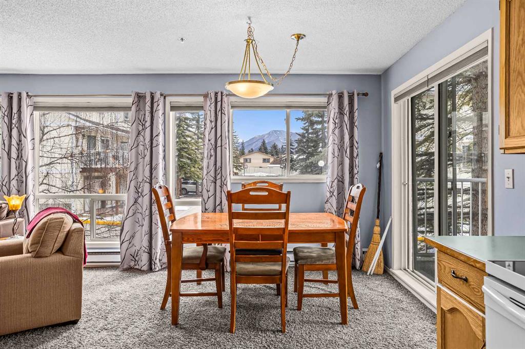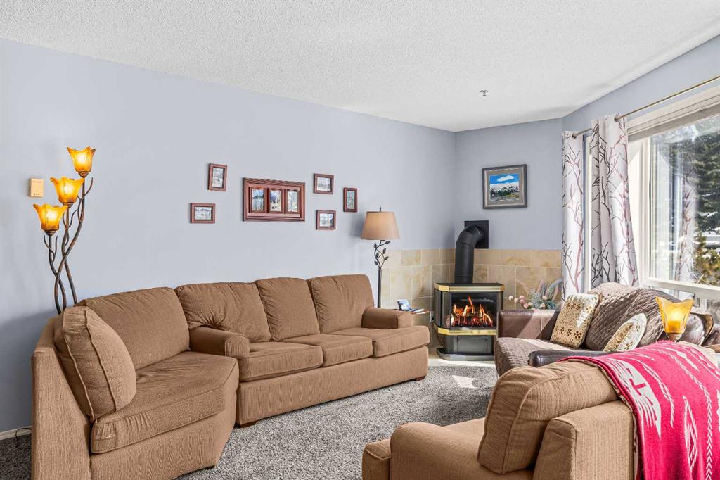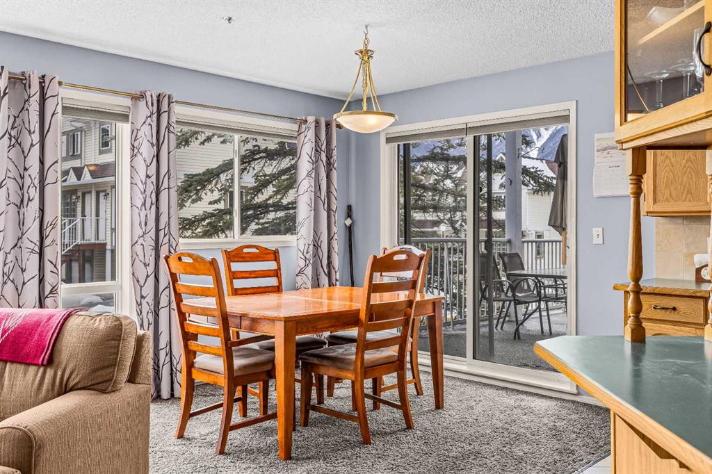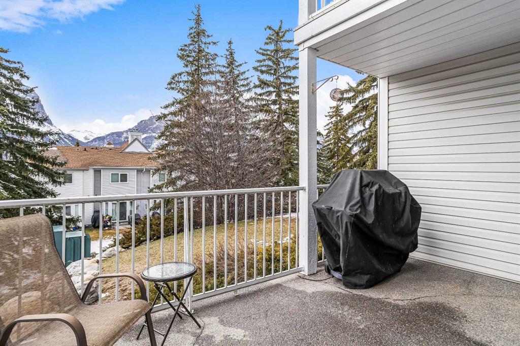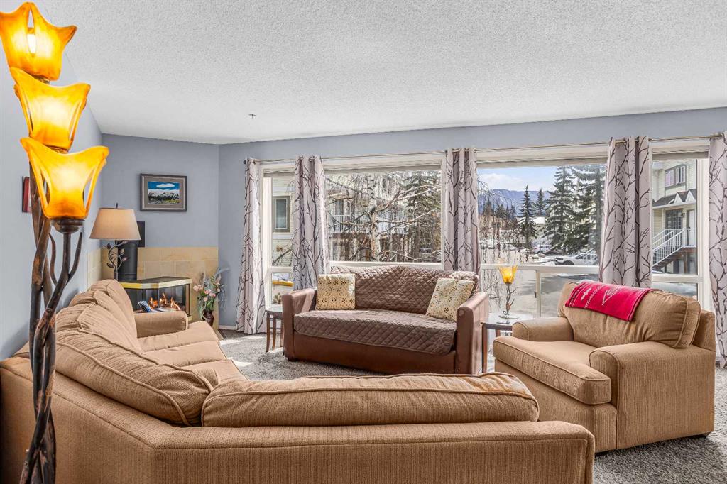 Step into this well-maintained two-bedroom, two-bathroom condo in Cougar Creek, offering a bright and functional open-concept layout. The entry and kitchen feature ceramic tile flooring that flows seamlessly into the living and dining areas. The west-facing living room captures afternoon and evening sun, highlighted by a corner gas fireplace and access to a spacious view deck with stunning mountain vistas. The generous primary bedroom includes a three-piece ensuite, while the second bedroom is thoughtfully positioned across from the updated four-piece main bathroom, alongside in-suite laundry and storage. Both bathrooms have been tastefully updated. This home also includes one heated underground parking stall and a storage locker. Located in a quiet complex with an amenities games room and out door hot tub, this property is well suited for full-time living or a mountain retreat.