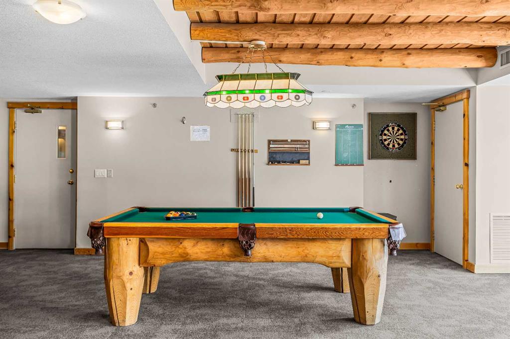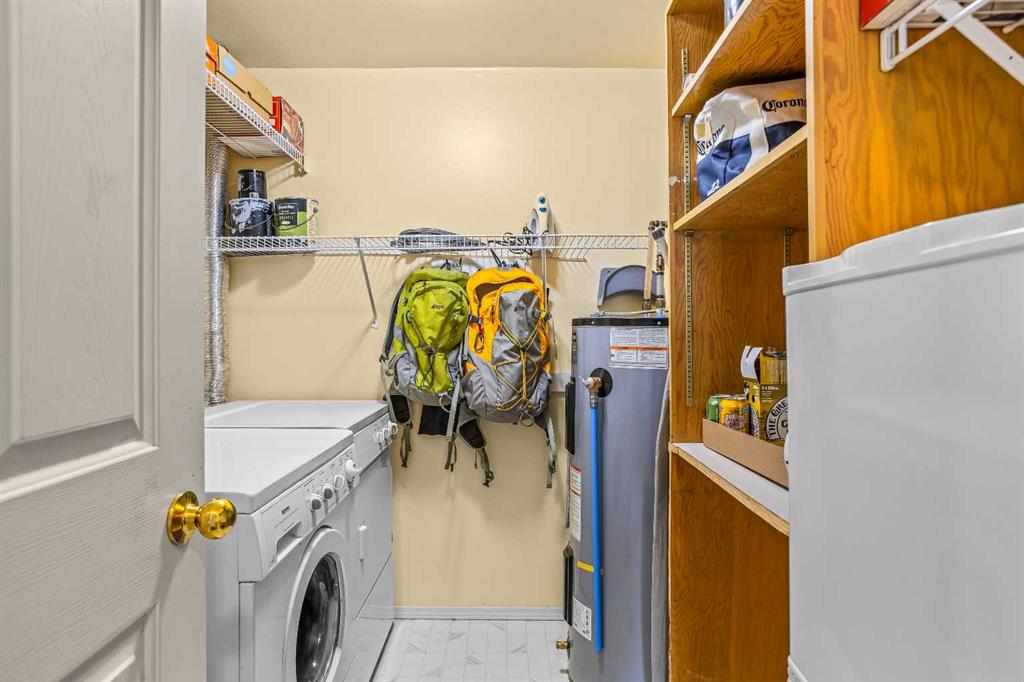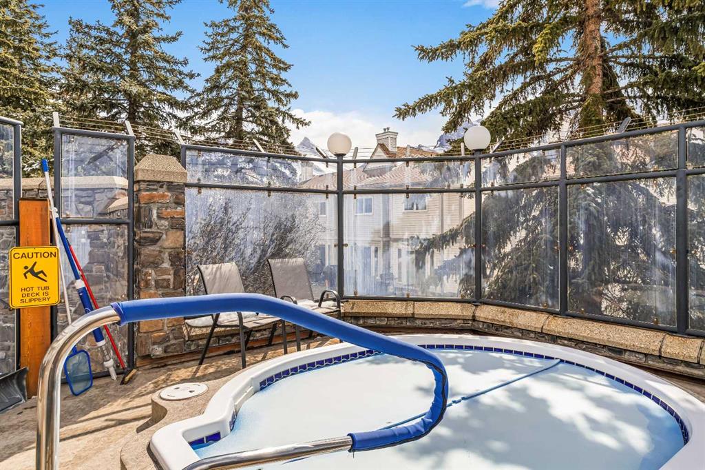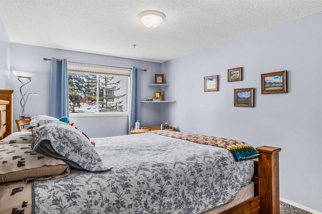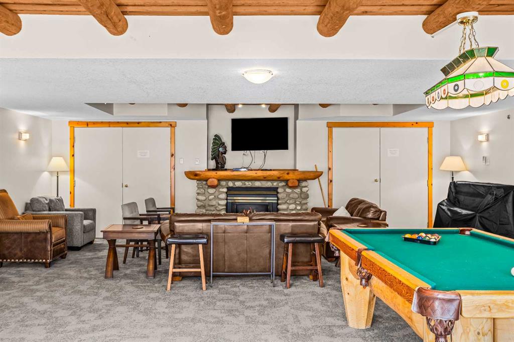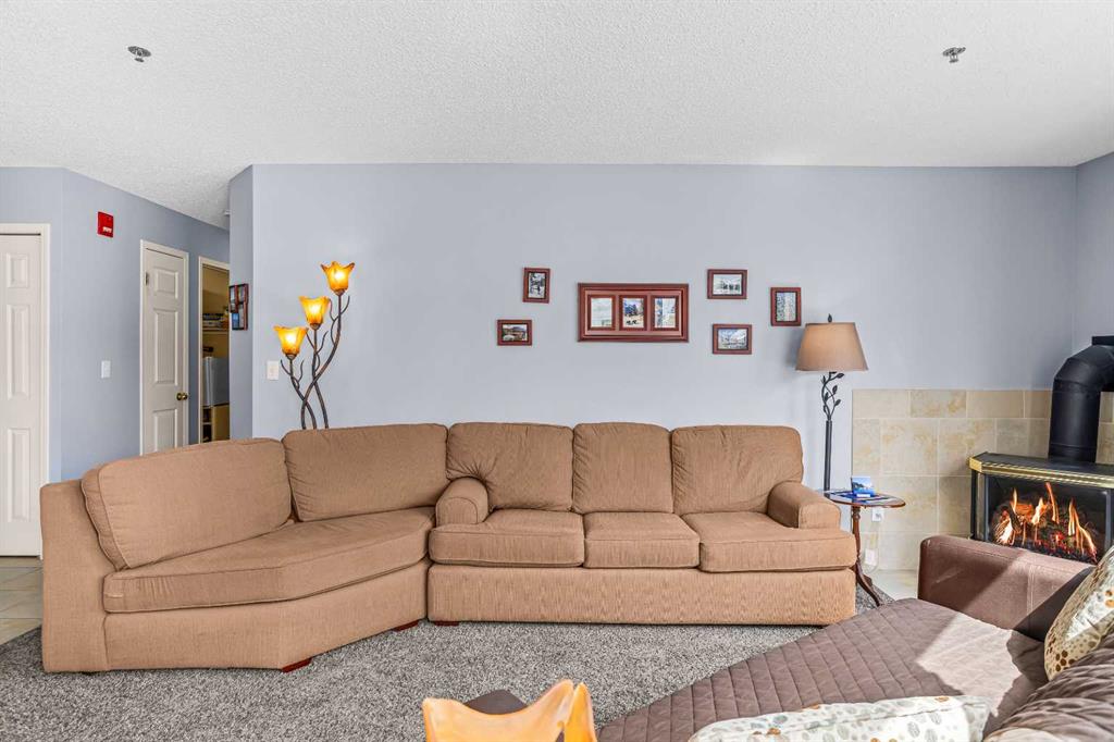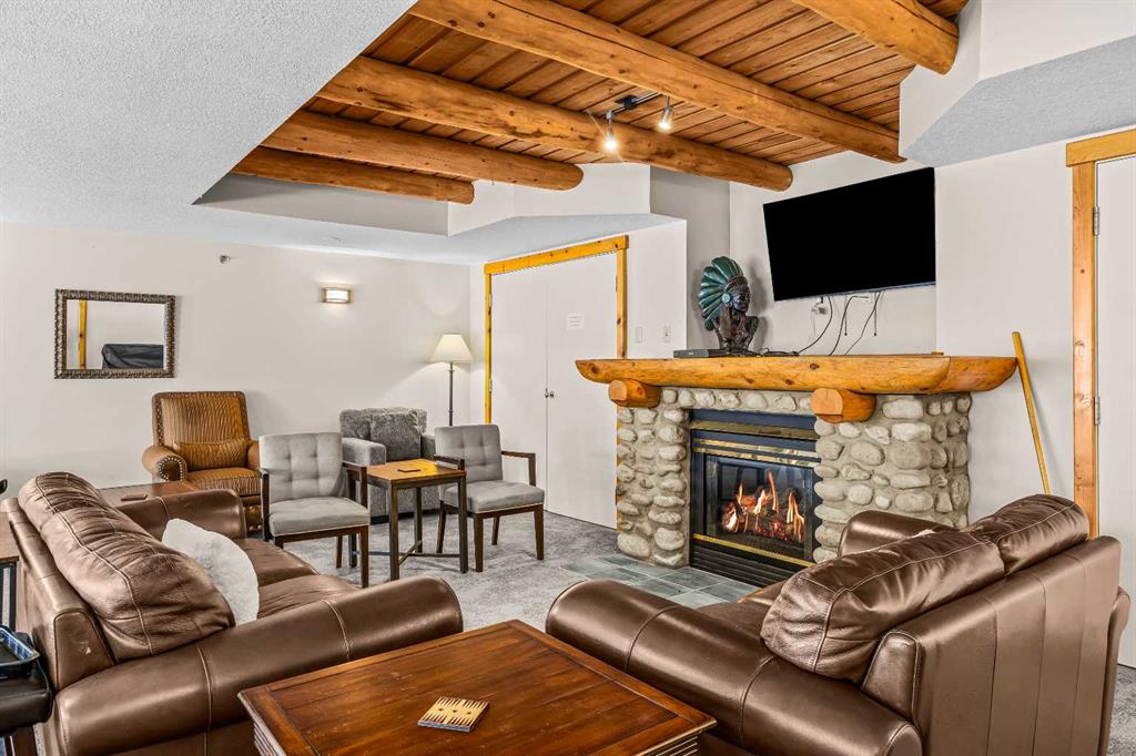 Step into this well-maintained two-bedroom, two-bathroom condo in Cougar Creek, offering a bright and functional open-concept layout. The entry and kitchen feature ceramic tile flooring that flows seamlessly into the living and dining areas. The west-facing living room captures afternoon and evening sun, highlighted by a corner gas fireplace and access to a spacious view deck with stunning mountain vistas. The generous primary bedroom includes a three-piece ensuite, while the second bedroom is thoughtfully positioned across from the updated four-piece main bathroom, alongside in-suite laundry and storage. Both bathrooms have been tastefully updated. This home also includes one heated underground parking stall and a storage locker. Located in a quiet complex with an amenities games room and out door hot tub, this property is well suited for full-time living or a mountain retreat.