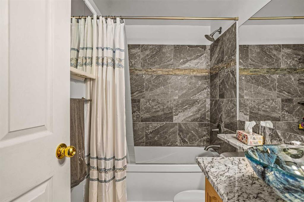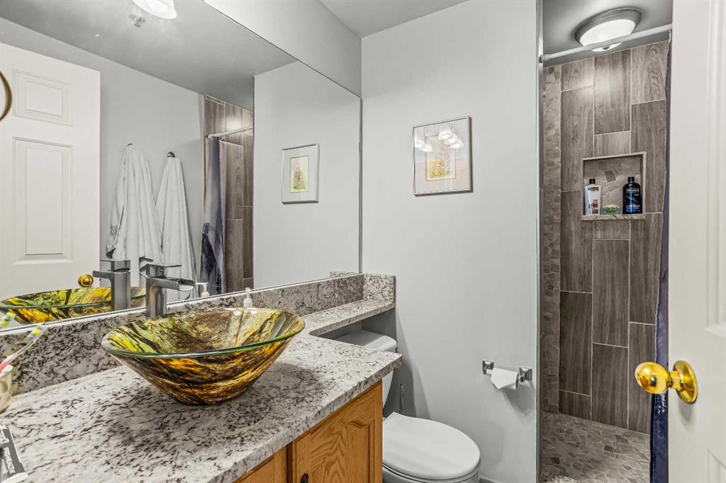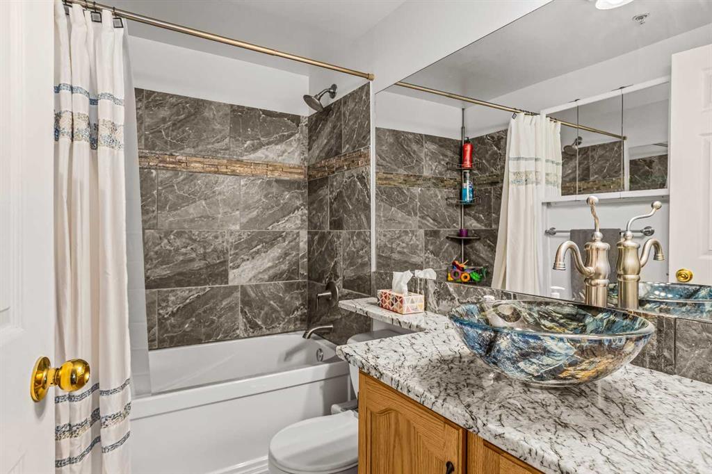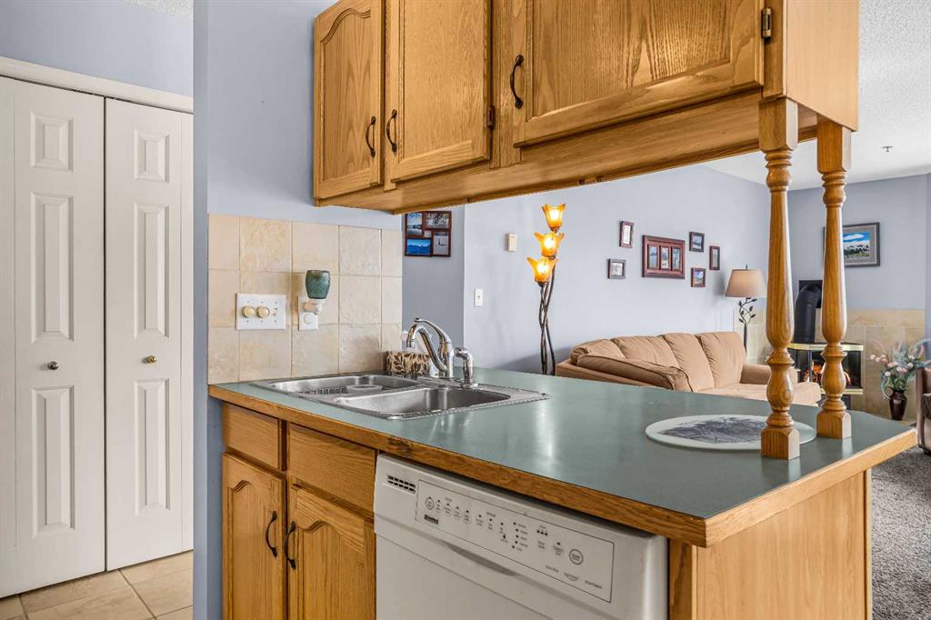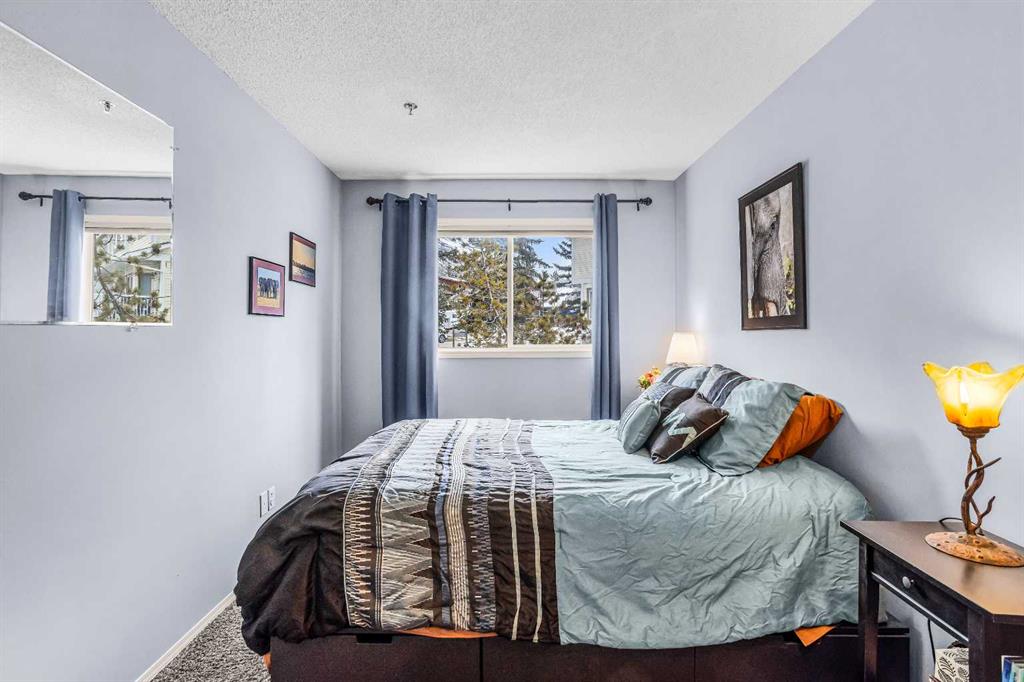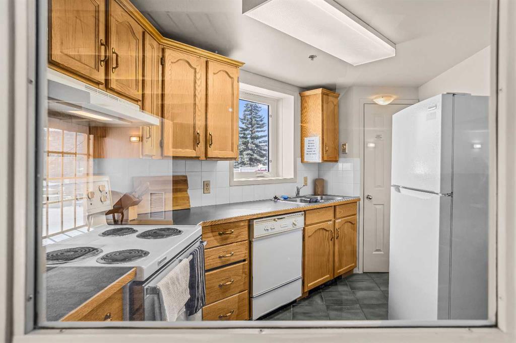 Step into this well-maintained two-bedroom, two-bathroom condo in Cougar Creek, offering a bright and functional open-concept layout. The entry and kitchen feature ceramic tile flooring that flows seamlessly into the living and dining areas. The west-facing living room captures afternoon and evening sun, highlighted by a corner gas fireplace and access to a spacious view deck with stunning mountain vistas. The generous primary bedroom includes a three-piece ensuite, while the second bedroom is thoughtfully positioned across from the updated four-piece main bathroom, alongside in-suite laundry and storage. Both bathrooms have been tastefully updated. This home also includes one heated underground parking stall and a storage locker. Located in a quiet complex with an amenities games room and out door hot tub, this property is well suited for full-time living or a mountain retreat.