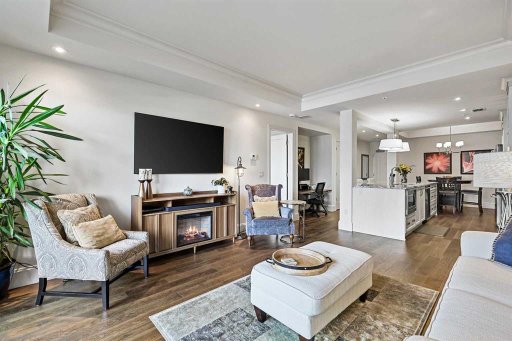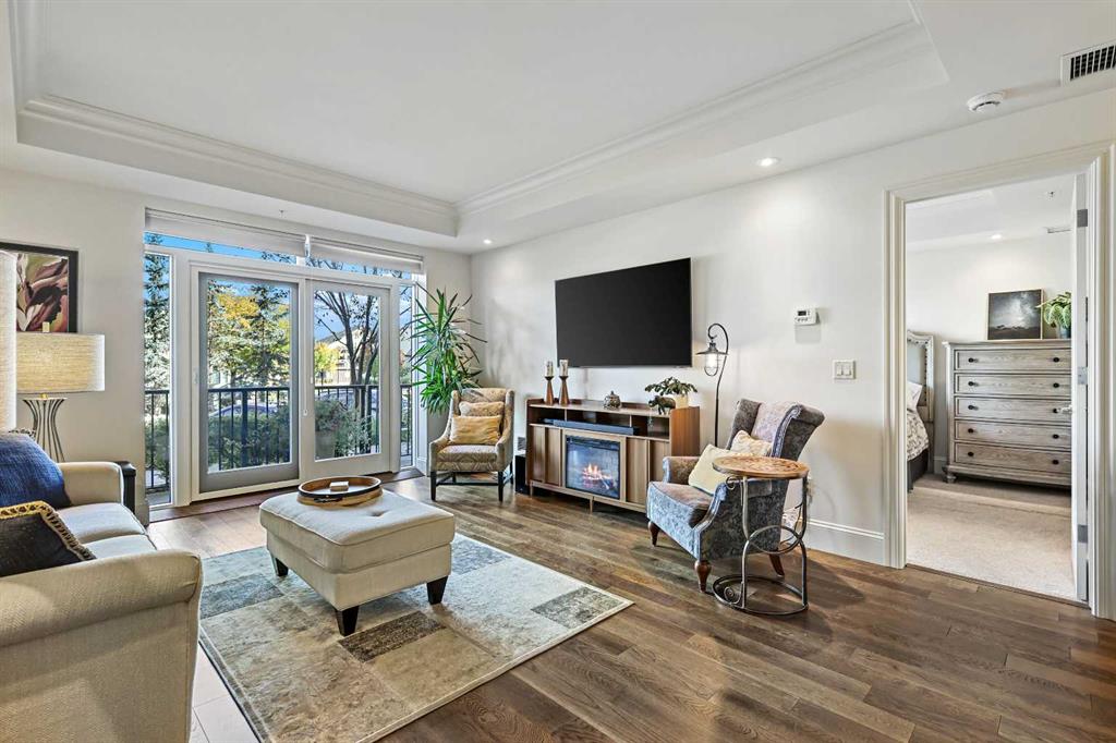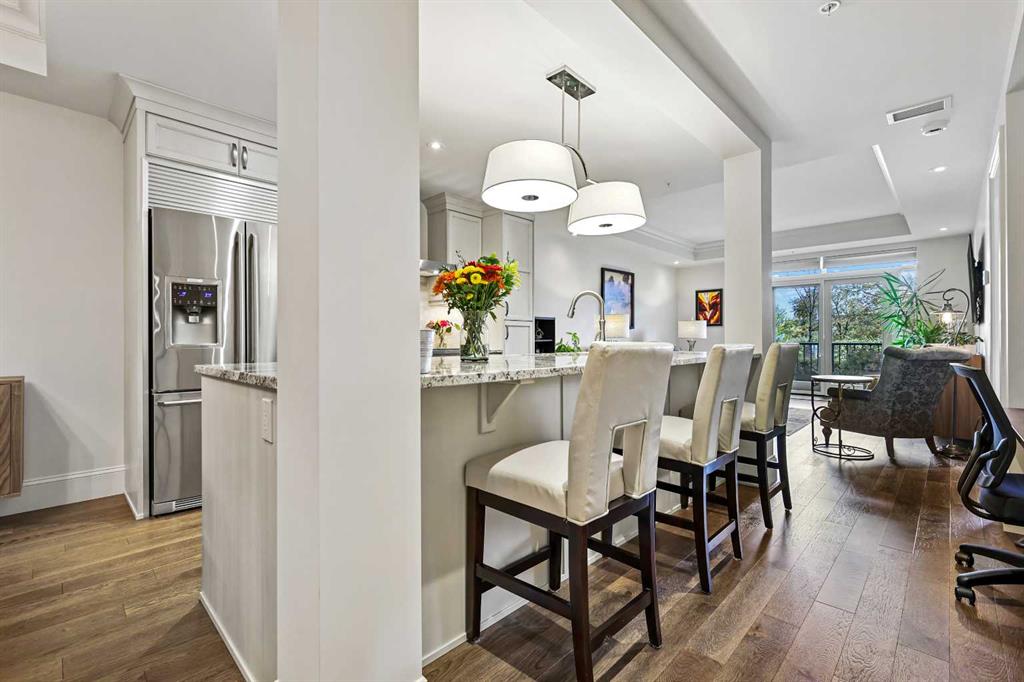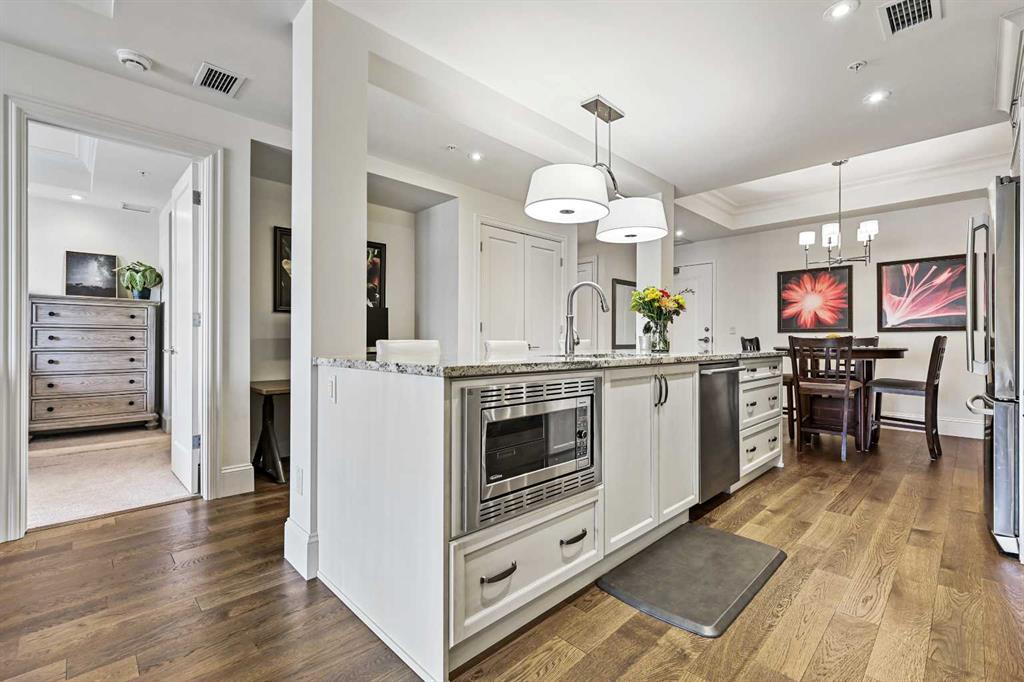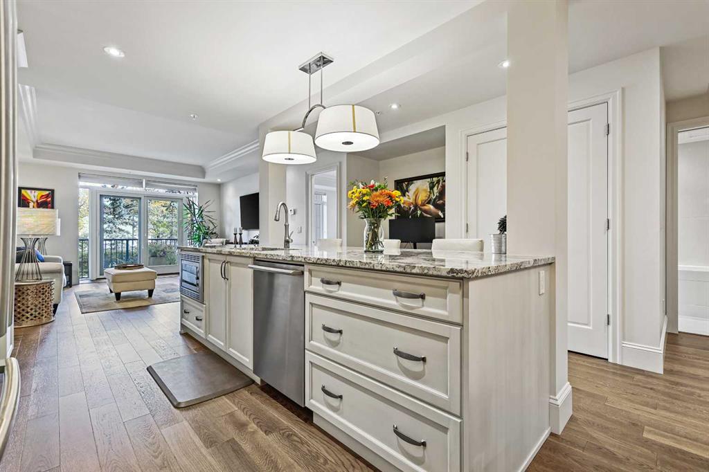 Welcome to Champagne in Quarry Park, where everyday living meets effortless style. This 1-bedroom, 1-bath condo offers a luxurious and inviting space in one of southeast Calgary’s most desirable communities. From the moment you walk into the building, you’ll notice the attention to detail—from the elegant lobby to the quality craftsmanship that carries through the entire home. Inside, the open layout feels bright and welcoming, with hardwood floors throughout the main living area, tall baseboards, and tray ceilings with crown moulding that add a touch of character. The central kitchen is both functional and stylish, featuring granite counters, a large island with seating, and stainless steel appliances, including a gas range—perfect for cooking and entertaining. On one side, there’s space for a dining table, while the living area on the other opens to sliding patio doors leading to your east-facing patio, where you can enjoy morning light and quiet outdoor time. The spacious bedroom includes a walk-through closet with doors and connects to a well-designed bathroom with a soaker tub and separate glass shower. There’s also a second entry to the bathroom from the main living area for convenience. The suite includes in-suite laundry with full-sized washer and dryer, plus titled underground parking and a storage unit. The heated parkade even has a car wash bay—a small luxury that makes a big difference in Calgary winters. Champagne is known for its solid concrete construction and timeless design, offering a peaceful and comfortable place to call home. The Quarry Park community is one of Calgary’s best-kept secrets, offering the perfect balance of city living and quiet convenience. You’re close to shops, restaurants, schools, and the Remington YMCA, and just steps from river pathways for walking or biking. Commuting is easy with quick access to Deerfoot Trail, Stoney Trail, and downtown. Whether you’re looking for a first home, a downsized lifestyle, or a low-maintenance place that still feels special, this Champagne condo delivers comfort, quality, and a great location—all wrapped up in a community you’ll love to come home to.
