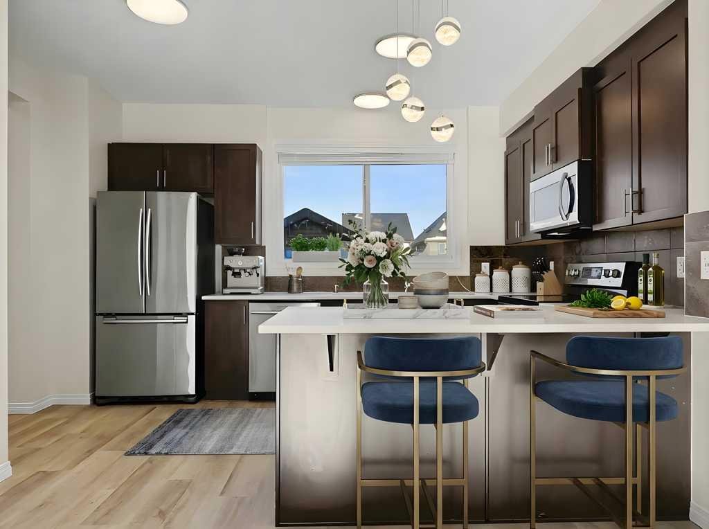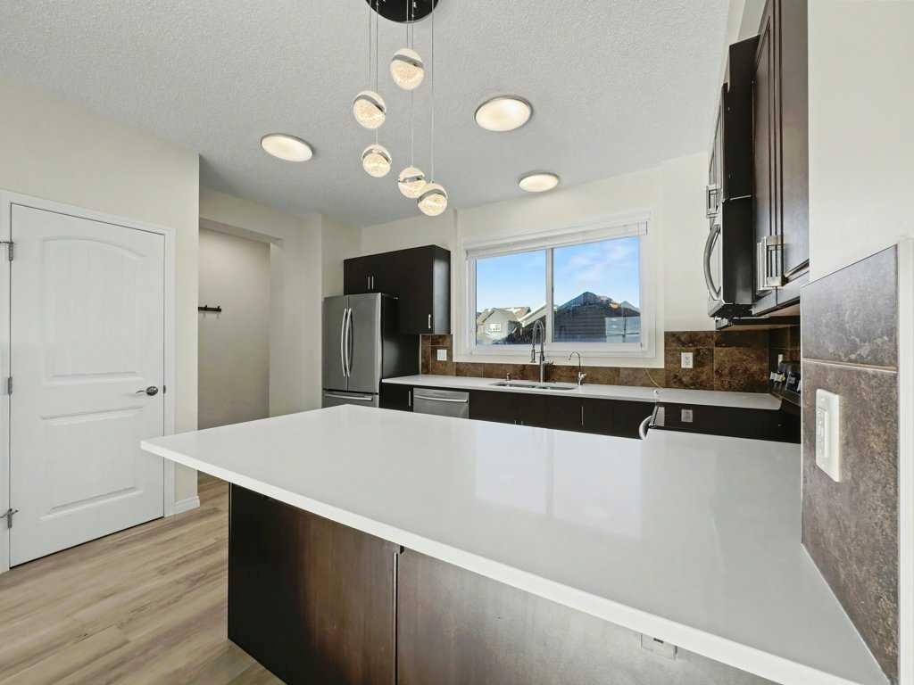 Lake Privileges in Mahogany! This “like new” two-storey Jayman-built home offers over 2,270 sq. ft. of renovated living space. The exterior features new sod and a new fence with two new gates. Inside, discover new quartz countertops throughout the kitchen and all bathrooms, complemented by new sinks, soap dispenser, and stainless steel appliances (brand new stove – never used)! The kitchen is further upgraded with high-end fixtures and a Kinetico water filtration system. The main floor shines with new luxury wide-vinyl plank flooring and designer lighting, including colour-changing disc lights. Brand new “luxury ivory wedlock” carpets throughout with upgraded thick underlay! Upstairs, the primary suite includes a private ensuite, plus two additional spacious bedrooms and a 4 piece bathroom. The entire home has been freshly repainted, including all baseboards and railings. The fully finished “warm” basement features a fourth bedroom or office, a large recreation area perfect for a home theatre, and another four piece bathroom. Technical highlights include a tankless hot water system, a high-efficiency furnace (recently serviced and ducts cleaned), triple-pane low-E windows, and solar panel rough-ins. Enjoy Hunter Douglas blinds and the peace of mind of a non smoking home that has been meticulously maintained,—having never housed children or pets and just deep-cleaned for its next owners. This zero-lot-line property also includes an oversized deck, an oversized double detached garage, and a back alley approved for paving. Perfectly situated on a quiet, family-friendly street, you are within walking distance of schools, wetlands, and shopping. Commuting is effortless with Deerfoot and Stoney Trail just 10 minutes away, plus close proximity to the world’s largest YMCA and South Health Campus Hospital. Best of all, enjoy full access to Mahogany’s famous 63-acre lake and Beach Club. From summer swimming and kayaking to winter skating and hockey, this community offers year-round sports, gymnasium access, and family-friendly activities and entertainment. This pristine property truly shows like a model home!