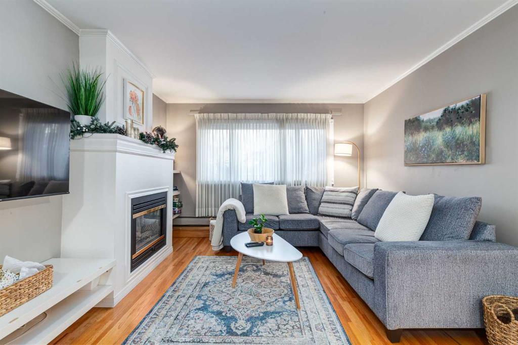 Enjoy the warmth and character of original hardwood floors that flow seamlessly throughout, leading to a welcoming living room with a cozy gas fireplace and built-in bookshelf — perfect for relaxing evenings at home.