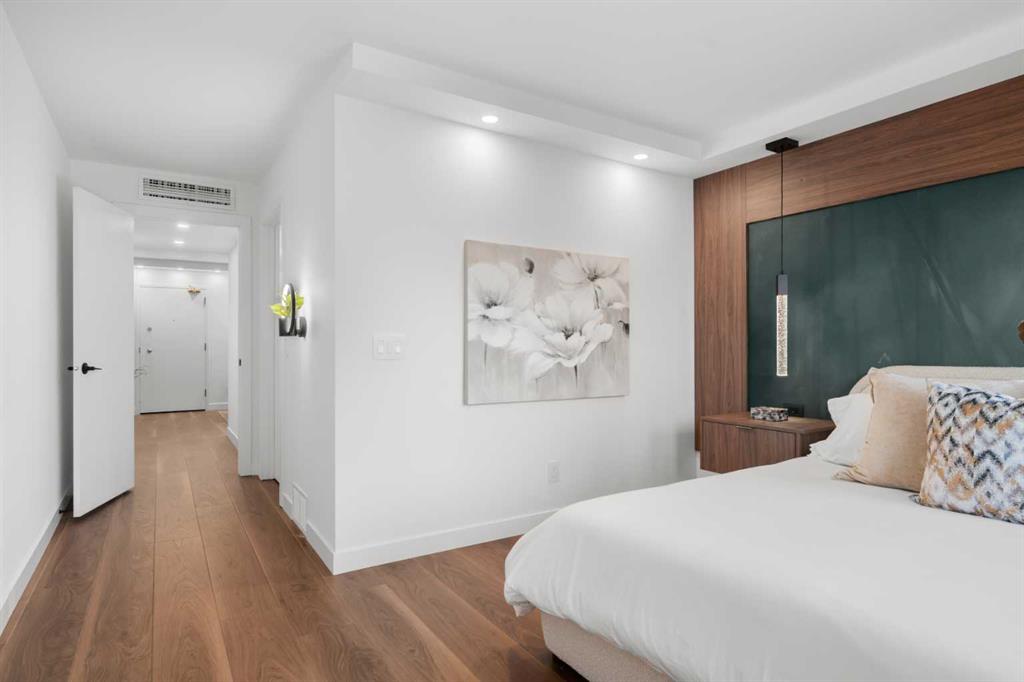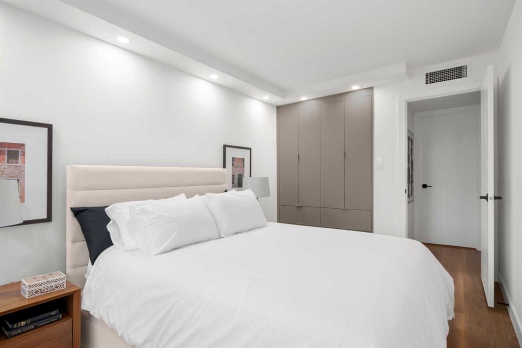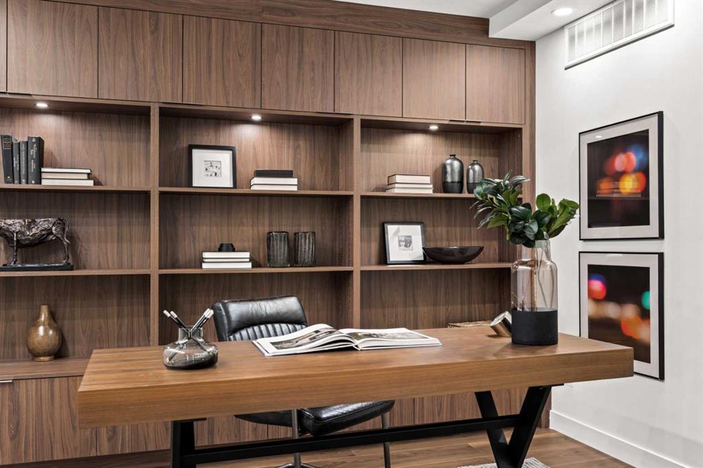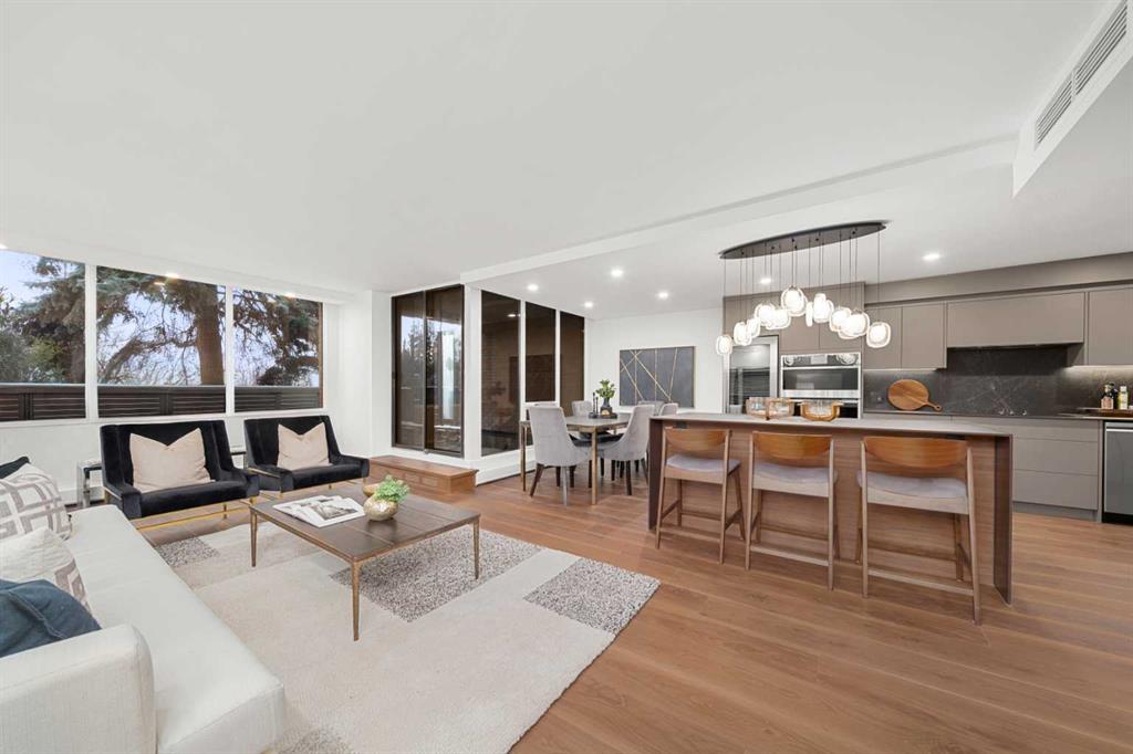 Rarely does a residence of this calibre become available—particularly one of the highly sought-after main-floor, south-facing townhomes with private yard access and river views. Recently redesigned with attention to detail, this two-level home offers the comfort and flow of a modern single-family residence, paired with the prestige and convenience of executive condo living in Roxboro House. The main floor unfolds in a bright, airy expanse framed by oversized south-facing windows that flood the space with natural light. A dramatic 74” Dimplex fireplace, wrapped in porcelain slab, anchors the living area and sets a sophisticated tone. The open-concept kitchen is a true showpiece, showcasing custom Metro cabinetry, porcelain countertops and backsplash, brand-new Samsung smart appliances, a Zephyr wine cooler, and designer Delta fixtures. Premium Coretec/HQ luxury vinyl flooring runs seamlessly throughout, while Cartwright lighting and an integrated bulkhead design elevate the architectural finish. From the living area, step directly into your private fenced yard and patio—an exceptionally rare offering in this buiilding hat delivers the ease of outdoor living within a luxury building. A beautifully appointed main-floor powder room adds both style and practicality for guests.m Upstairs, sleek glass railings lead to a striking imported wallpaper feature wall—an artful statement that reflects the thoughtful design carried throughout. At the top of the stairs, a dedicated library or home office provides a quiet, inspiring retreat, perfectly removed from the activity below. The upper level is designed with comfort and privacy in mind. The principal suite is a refined sanctuary, complete with a custom feature wall, built-in side tables, a spacious walk-in closet, and an elegantly finished ensuite with tile and glass shower. A private balcony extends from the bedroom, offering tranquil views of the Elbow River and the tree-lined streets of Rideau Park—the perfect setting for morning coffee or an evening unwind. The second bedroom also enjoys river views and features integrated custom cabinetry to maximize storage and functionality. A full bathroom is conveniently located across the hall, and the upper-level laundry area adds everyday ease and efficiency. Life here extends well beyond your front door. Residents of Roxboro House enjoy a full suite of amenities, including professional concierge service, an indoor pool and hot tub, a well-equipped fitness centre, a party room for entertaining and secure underground parking. Outside, the location is unmatched—river pathways are directly across the street; boutique shops, high-end retailers, and specialty services are all within walking distance; and groceries sit just steps from your door.