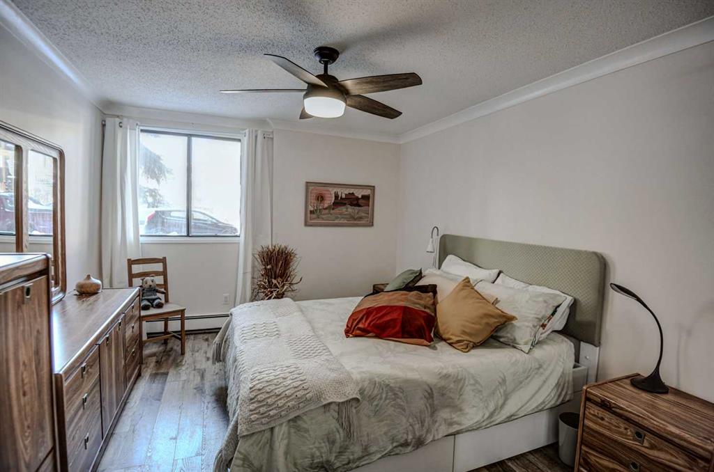 ? Quiet, 40+ age restricted living can be yours in Chinook Manor, a well-managed and maintained five storey concrete building, with elevator, that is only a couple of blocks from Chinook Center. The spacious two-bedroom unit offers 993 square feet of living space and literally needs no work. Just move in and enjoy. This home is freshly painted throughout. along with all brand-new vinyl plank flooring . Large open living room dining room combination with crown moulding overlooking your exclusive use patio. Second bedroom can be used as an office. The Murphy bed is included.The full bath has a newer vanity. In-unit laundry and storage room.There is also a separate assigned storage room locker . Amenities Include a social room, billiard room, fitness room, laundry room and workshop. The available underground parking is an option, subject to availability, over and above the building’s included surface parking and abundant on-street parking. There is a strict no-pet policy here and respectable condo fees of $604 per month. Enjoy the quiet lifestyle.Close to transportation and all types of shopping and restaurants.