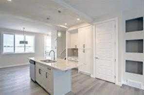IMMEDIATE POSSESSION, END UNIT, SIDE ENTRY TO BASEMENT. DOUBLE DETACHED GARAGE, DECK, FENCED AND LANDSCAPED, NO CONDO FEES. INTERIOR PICTURES ARE OF SAME MODEL, NOT SUBJECT PROPERTY. Welcome to the “St. Andrews” townhome, by Award winning, Master Builder, Douglas Homes Ltd. From the front covered porch, the entry opens onto the spacious great room with 9ft ceiling and gleaming hardwood floors throughout the main floor. The aspiring chef will appreciate the well planned “island” kitchen. From the upgraded 42 inch, soft close cabinets, to the gorgeous quartz countertops, everything is within easy reach. The sparkling stainless steel fridge, the glass top, self cleaning electric range, dishwasher, and over the range microwave/hoodfan are all just an arms length from the kitchen sink. Opposite side of the island, provides a convenient pantry, and desk with upper cabinet for all those recipe books you will collect. The spacious dining area features a large picture window looking out upon the back yard with room for the kids to play, with a rear entry door to the deck for those summer bbq’s. Here also is a 2pc powder room for your guests convenience, and perhaps the kids hurried need. Upstairs includes 2 good sized secondary bedrooms, a 4pce bathroom with quartz vanity and tile floors, a convenient upstairs laundry, and a spacious primary bedroom with large upsized window and ensuite bath, with walk in shower, with glass front, tile floor and again a quartz vanity. The full basement provides rough in plumbing for a future bath, one window for future bedroom, and enough space remaining for a spacious future family room if you decide your family needs room to spread. All this in the desirable new subdivision Cobblestone Creek, with tennis courts, playgrounds, future school reserve, pathways and numerous green spaces, on the western edge of Airdrie, with wide open country side, and views to the west. THIS HOMES SIDES ONTO GREEN AREA.
