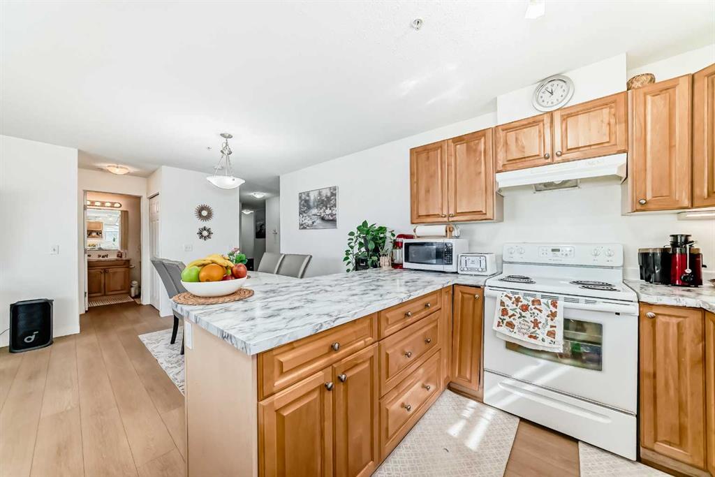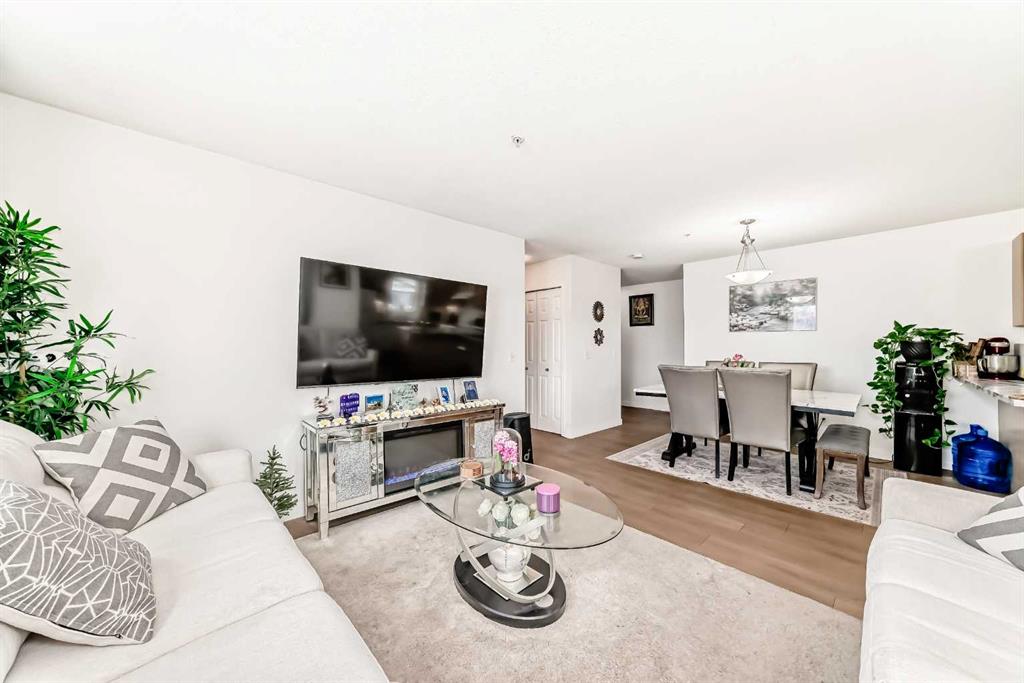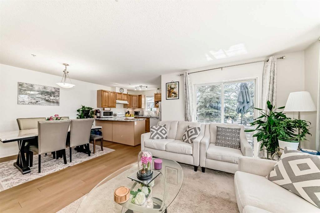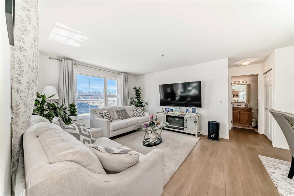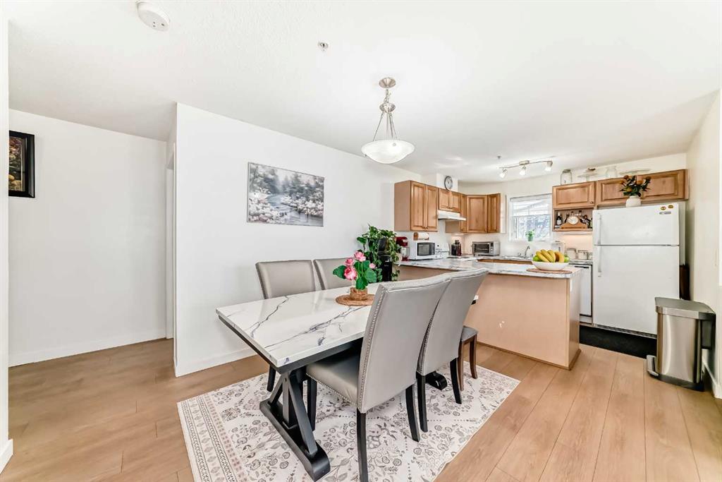Stylishly updated 933 sq. ft. condo in an easily accessible location on Railway Street, just steps from Elizabeth Street in the heart of Okotoks. This bright unit features modern laminate flooring throughout and soft, inviting paint colours that enhances the clean, contemporary feel. The open-concept design offers a spacious living and dining area, ideal for everyday living and entertaining. The kitchen includes sleek countertops, generous cabinetry, and included appliances for added convenience. Two well-sized bedrooms are highlighted by a private primary suite with ensuite, plus a versatile second bedroom perfect for guests, family, or a home office. Includes an assigned underground parking stall. Unbeatable location close to shopping, dining, parks, and amenities—perfect for professionals, downsizers, or investors seeking low-maintenance living.