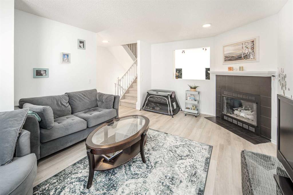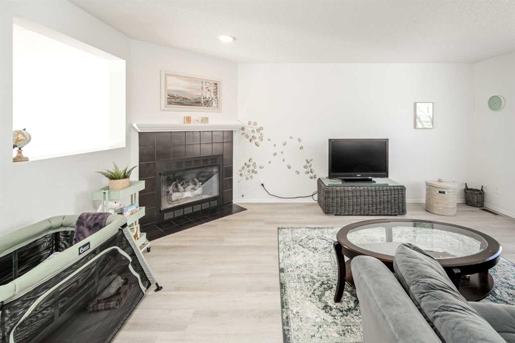 The upper level features a second living area with a cozy gas fireplace, filled with natural light from both east- and west-facing windows, and completed with a convenient 2-piece powder room.