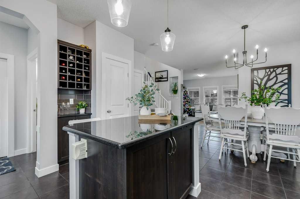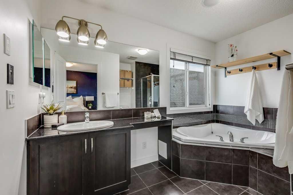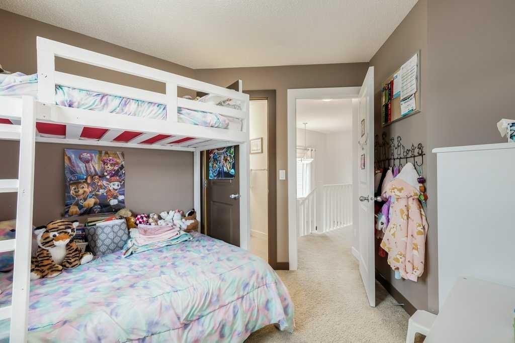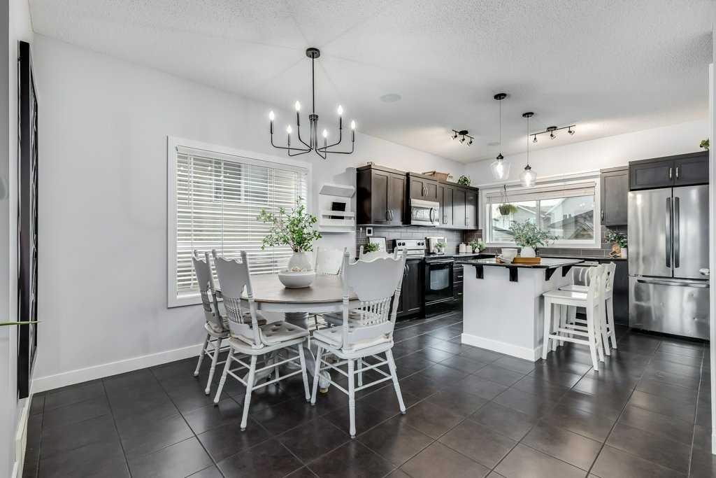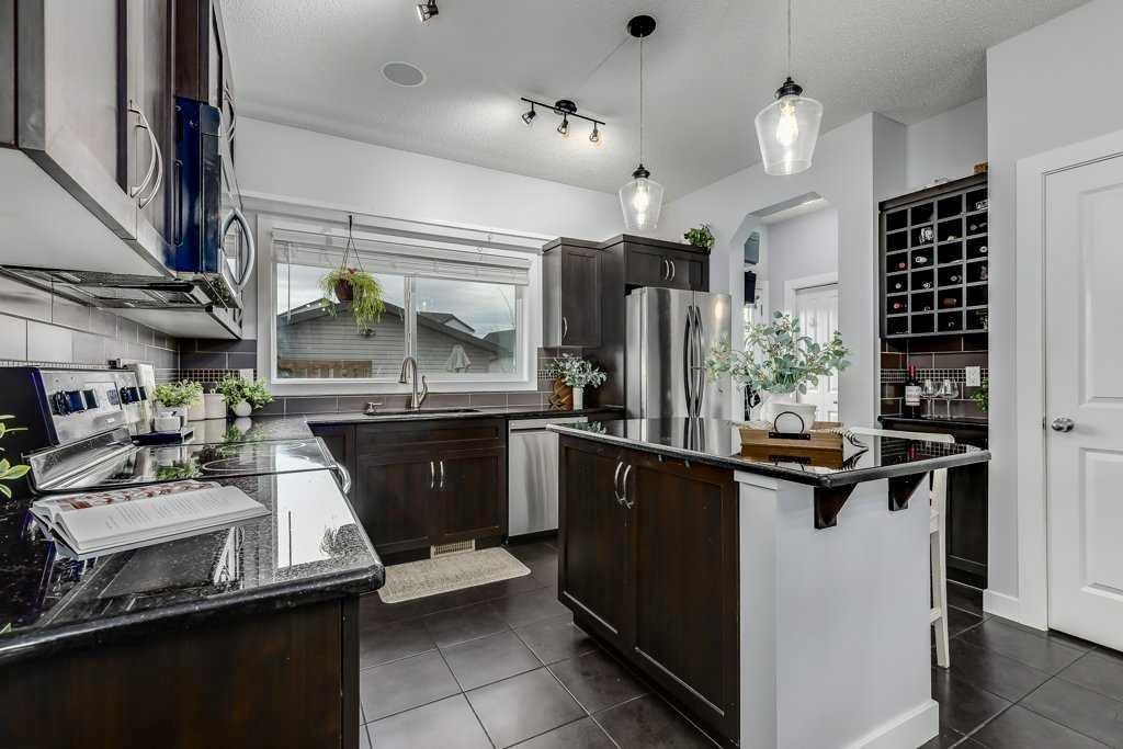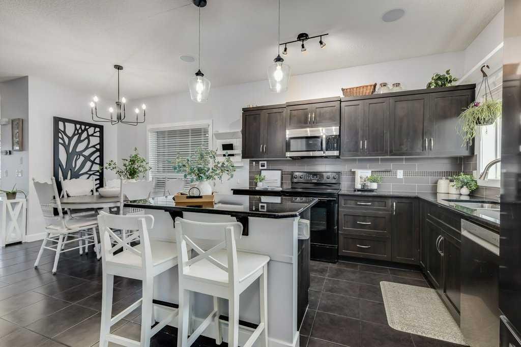 Welcome home to this beautifully kept family home on a quiet street in Airdrie with almost 2200 sq ft of living space! Just a short walk to parks, ponds, skating rink, soccer fields, wide-open green spaces and nearby schools. Step inside to an inviting, open-concept main floor with 9 ft ceilings, built-in speakers, a gas fireplace and an abundance of windows that keep everything bright and cheerful. The kitchen offers granite counters, plenty of cabinet space and a generous dining area, plus a handy desk/workstation area on the main floor. Upstairs you’ll find three comfortable bedrooms, convenient upper laundry, a large full bathroom with door to the bedroom, and a spacious primary suite with a walk-in closet and a large ensuite featuring a jetted corner soaker tub, makeup area, and separate shower. The basement is fully finished with permits and feels like its own retreat, complete with a kitchenette, cool concrete countertops, slate flooring, warm wood (cedar-style) ceilings, a cozy living area, full bathroom, 4th bedroom and great storage. This home offers the potential to easily add a side entrance, allowing access to the basement that way, if desired.