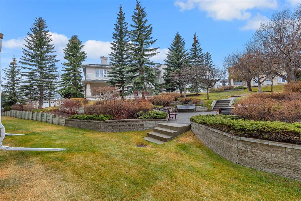 Location, Location, main floor unit backing onto green area. This apartment offers a gas fireplace, 9′ ceilings, jetted tub, upgraded toilets,, gas line on patio for bbq, underground titled parking & assigned storage space. Bright open concept offering laundry room, 2 full bathrooms, 2 bedrooms, kitchen that offers a raised eating bar, dining area & a living room that features a gas fireplace with patio doors that access the west facing patio & green space. Click on link to view 3D walk through