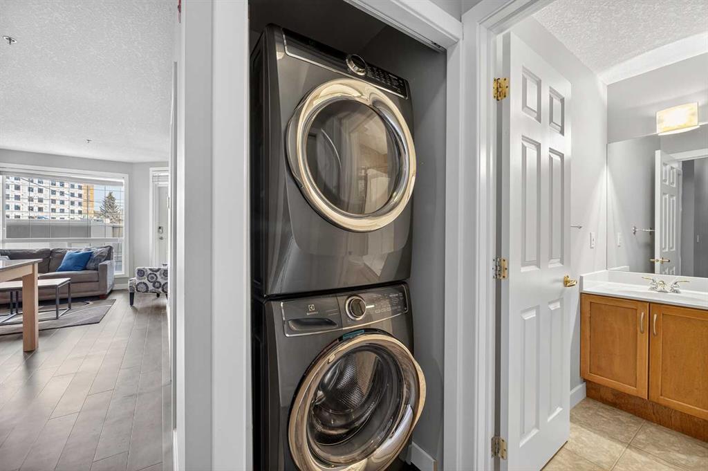 Look no further! This freshly painted, move-in-ready 2-bedroom, 2-bath home is ideally located directly across from the river pathway—outside of both the flood and flood fringe zones—and offers quick access to downtown and a straight shot to the mountains. Enjoy a vibrant lifestyle with top amenities nearby including Foothills Hospital, Market Mall, the University District, Angel’s Café, Lic’s Ice Cream, and the Lazy Loaf and Kettle. Inside, the open-concept main living area is designed for entertaining, featuring a spacious kitchen with an oversized eating island, abundant counter space, and a cozy corner gas fireplace that sets the perfect ambiance. From the living room, step out to your massive private patio, partially covered for year-round enjoyment. The generous primary suite includes a large custom organizer closet and a 4-piece ensuite with jetted tub. A second bedroom with its own custom closet, a 3-piece bathroom, and in-suite laundry complete this well-designed floor plan. Added value comes with a titled heated underground parking stall, a storage locker, and access to a secure common bike storage room. This home truly has it all—you’ll love living here!