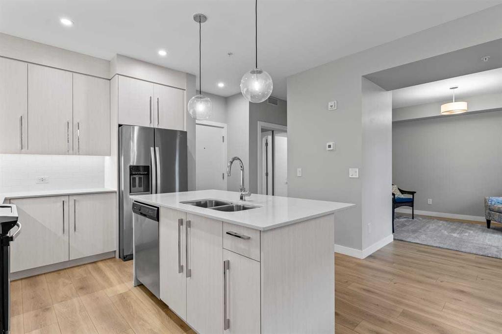 Unit 107 is a convenient main-floor condo with direct access to the covered patio and walking paths; ideal for easy comings and goings or running a quick errand. This 728 sq ft home features an open-concept floorplan with 9-foot ceilings, engineered hardwood flooring, and large triple plane picturesque windows. The modern kitchen includes quartz countertops, stylish cabinetry, a designer backsplash, and stainless steel appliances. The large island is perfect for casual meals or prepping a beautiful dinner at home. The dining area is spacious and also great for hosting family visits or playing cards with the grandchildren. The kitchen and dining area open to the living room, creating a comfortable space to relax at the end of the day. The generously sized bedroom includes a walk-through closet and a spacious 4-piece ensuite. A second full bathroom adds extra convenience for any guests. This unit also includes in-suite laundry and your own heated underground parking stall.