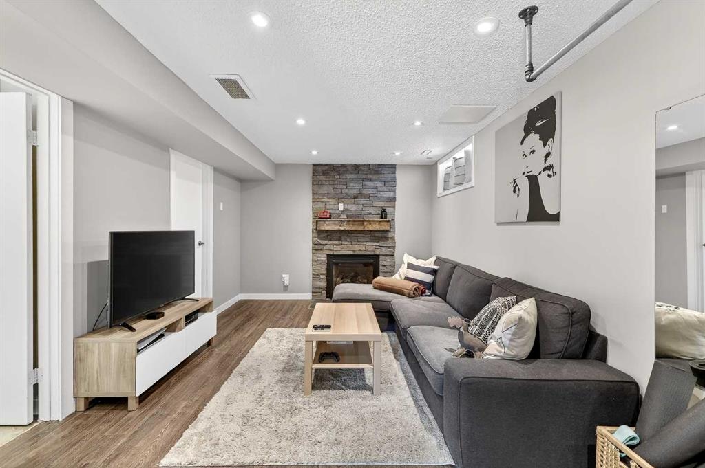 The fully finished basement offers even more living space, featuring laminate flooring, a large family room highlighted by another gas fireplace with a stone surround, a spacious fourth bedroom, a 3-piece bath, and a generous laundry/utility area.