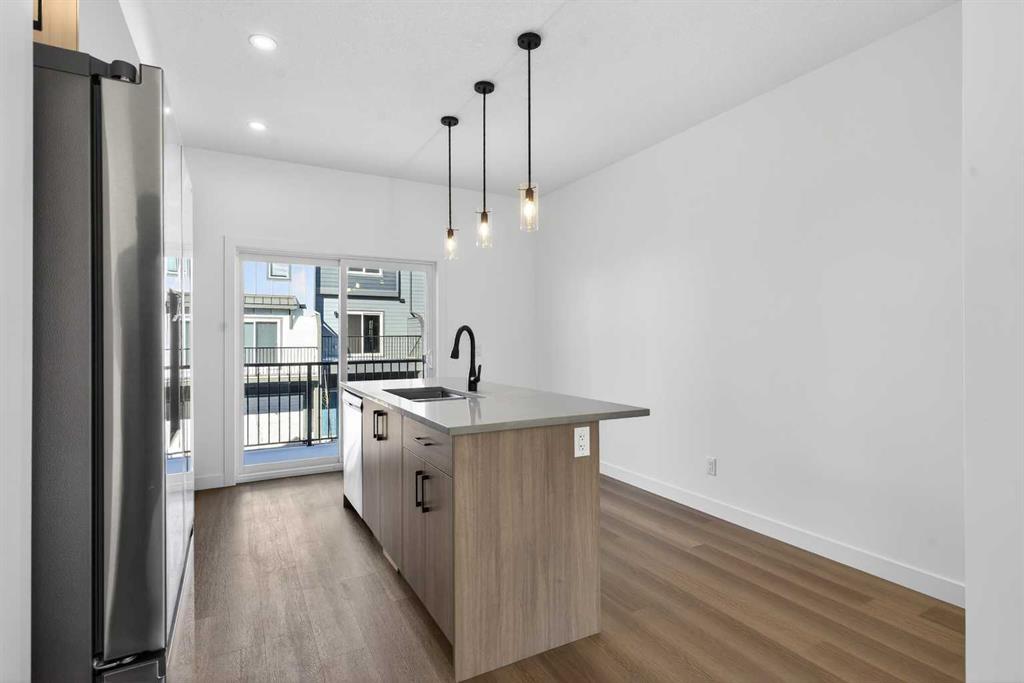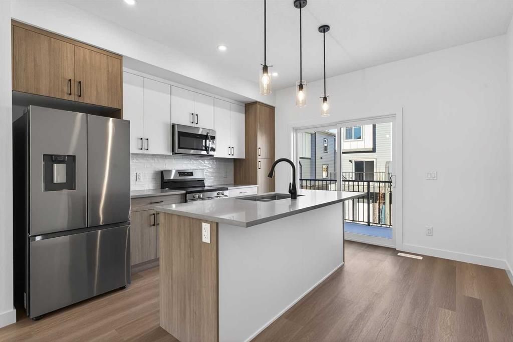 The open-concept main floor features 9′ ceilings and is bathed in natural light, creating a cozy and welcoming atmosphere for daily living or entertaining guests. The modern kitchen is equipped with quartz countertops, a breakfast bar, high-end stainless steel appliances, and a chimney-style range hood. Sliding doors lead to a full-sized balcony — perfect for unwinding or dining outside.