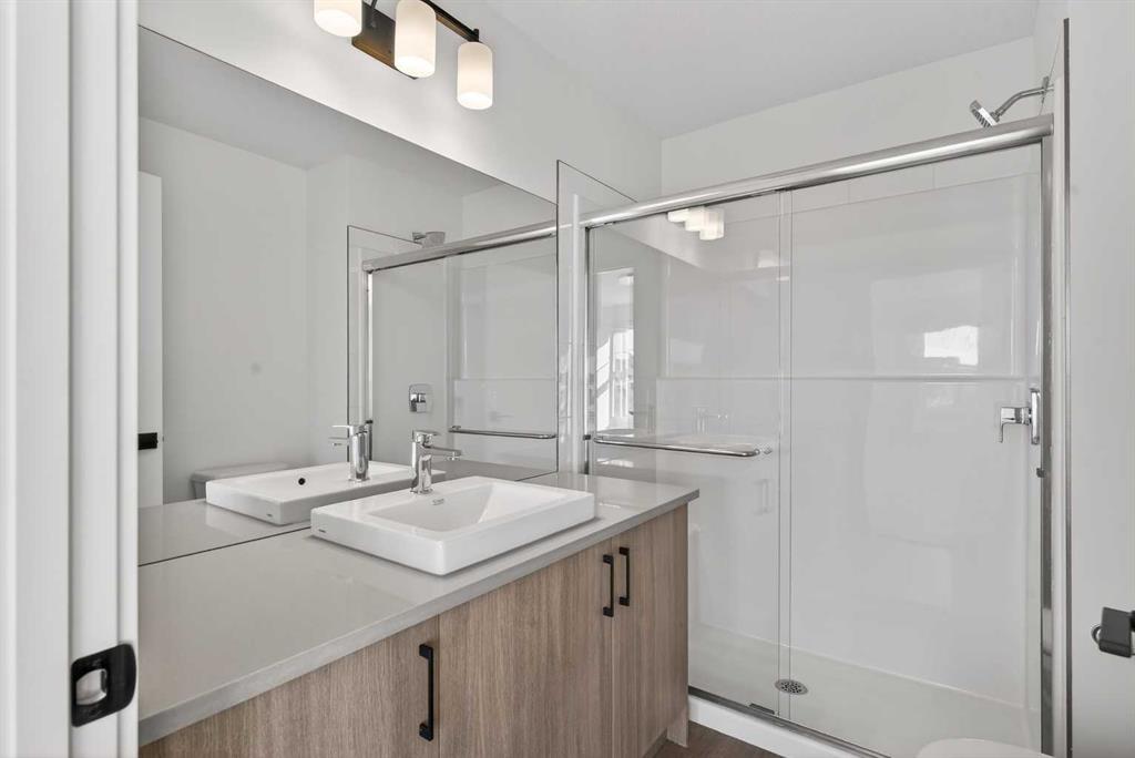 On the upper level, there are two roomy bedrooms, including a primary suite that has a double access closet and a private ensuite with a stand-up shower and a sliding glass door. A second full 3-piece bathroom is available for the additional bedroom, which can also serve as a home office. The upper floor further includes a washer and dryer conveniently situated, a linen closet, and ample storage options throughout.