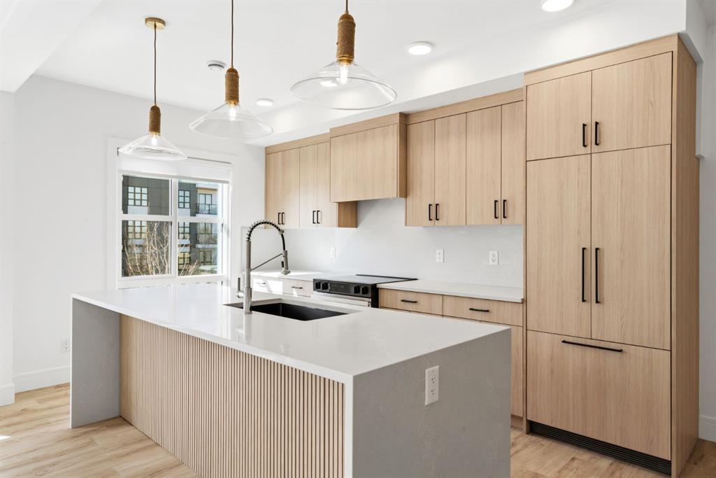 Step inside to discover beautiful luxury vinyl plank flooring, setting the tone for modern sophistication from the moment you arrive. The open-concept layout is flooded with natural light, enhanced with ample pot lights that illuminate every thoughtfully curated detail. At the heart of the home is a kitchen where form meets function white quartz countertops cascade in a stunning waterfall design, complemented by a matching quartz backsplash for a seamless, luxurious finish. The built-in refrigerator and dishwasher are concealed within cabinetry for a sleek, cohesive aesthetic, while a powerful hood fan integrates seamlessly into the overall design.
