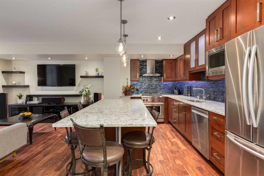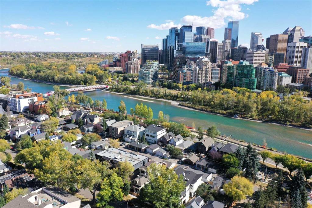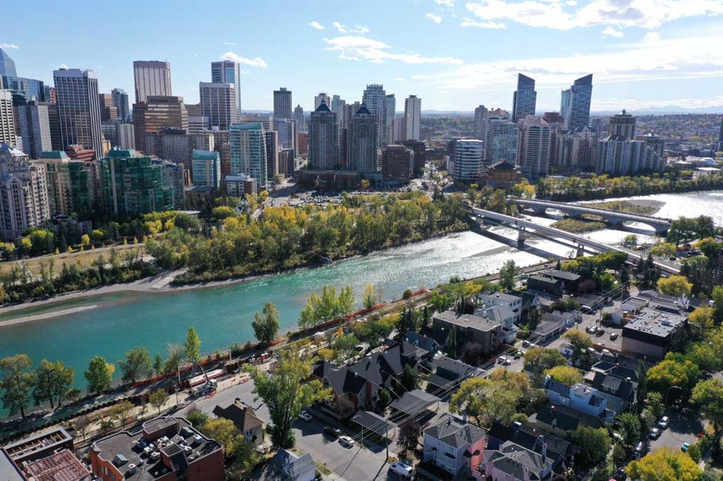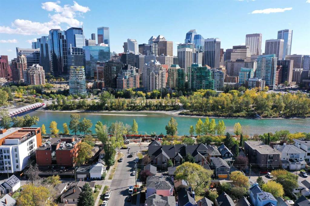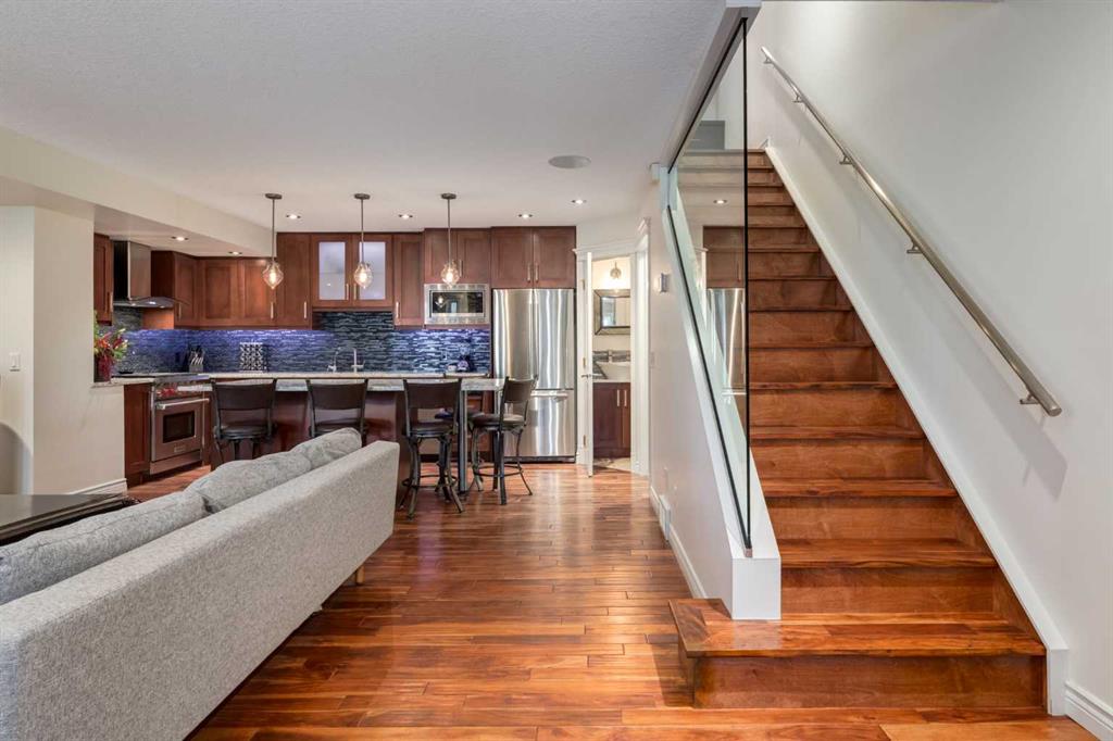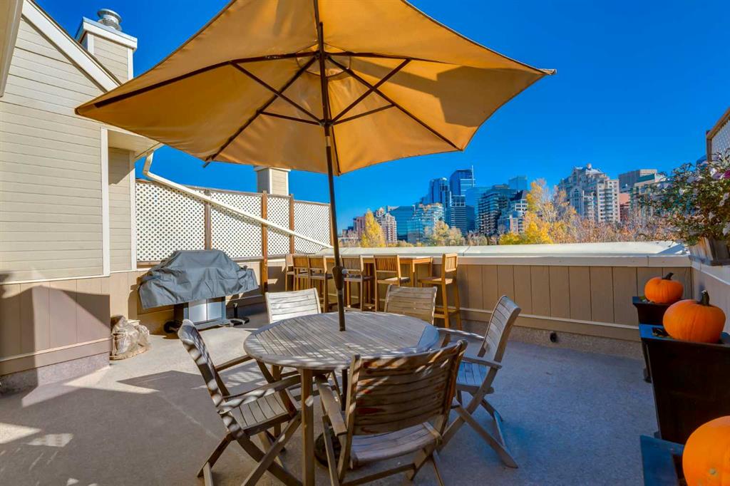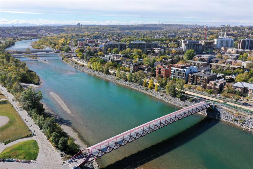 OPEN HOUSES – Thursday October 16 from 3 to 5 PM and Saturday October 18 from 1 to 3 PM. SUNNYSIDE townhome along the BOW RIVER with DOWNTOWN VIEWS. Located in a small enclave of 10 townhomes, this inner city home has had numerous updates over the past 10+ years. With 1948 square feet of living space over four levels, there are 2 bedrooms and 2.5 baths plus an exceptional top floor loft space with vaulted ceilings adjacent to an outstanding 20” x 16” roof top patio. The views of Calgary’s city skyline are truly exceptional. The home has newer windows & doors, plus the decking has been replaced. The custom kitchen includes Makore cabinetry, large island and stainless appliances. There is hardwood flooring on three levels, tile in the foyer and bathrooms, quartz countertops, chrome finish hardware, updated light fixtures, built-in entertainment cabinets in living area, air conditioning, and a two 2-sided gas fireplace with remote control. The lower level is developed, including a four piece bath. The Sierras Riverside in Sunnyside is a one of a kind condominium in a vibrant walkable and bikeable location with restaurants, retail, transit, and the Peace Bridge steps away.