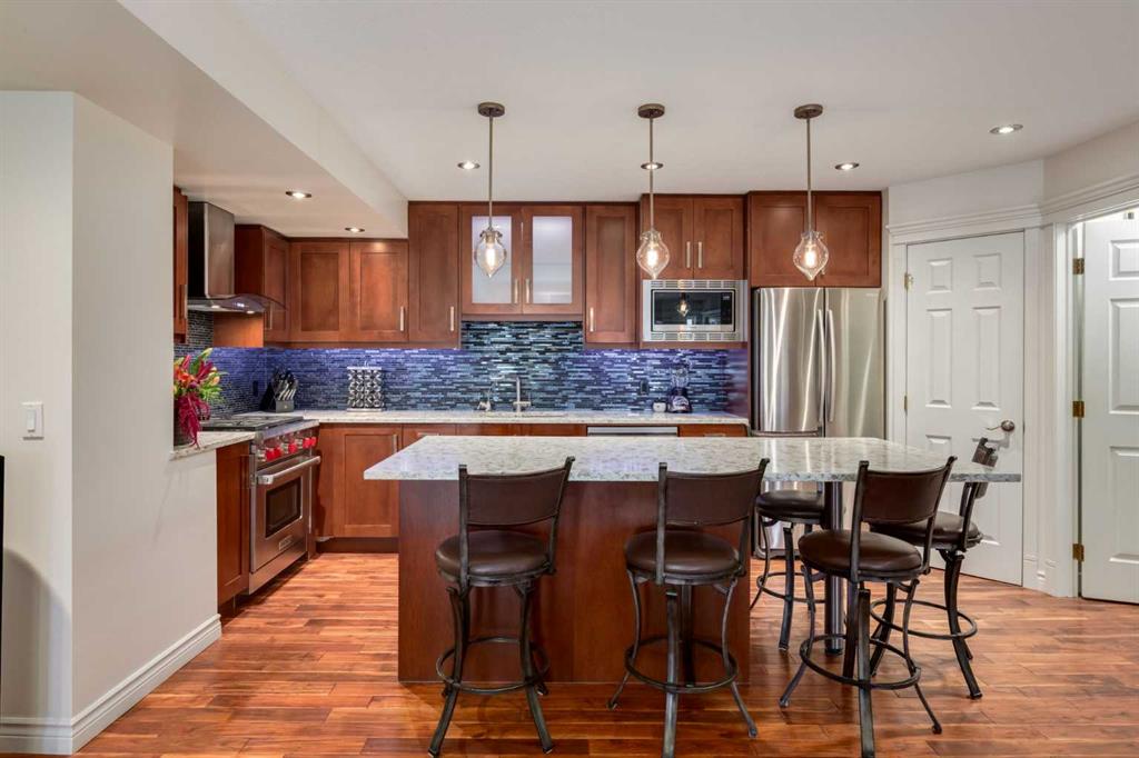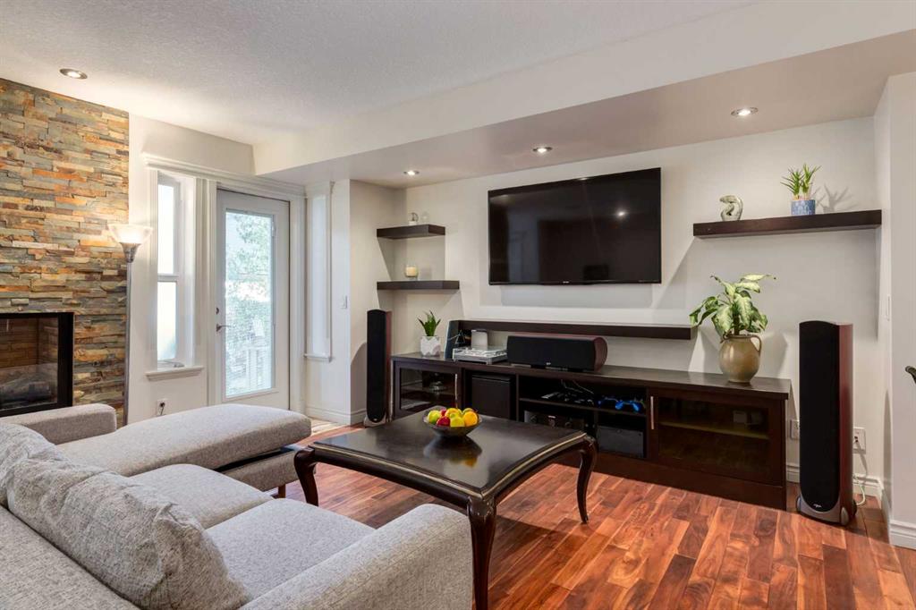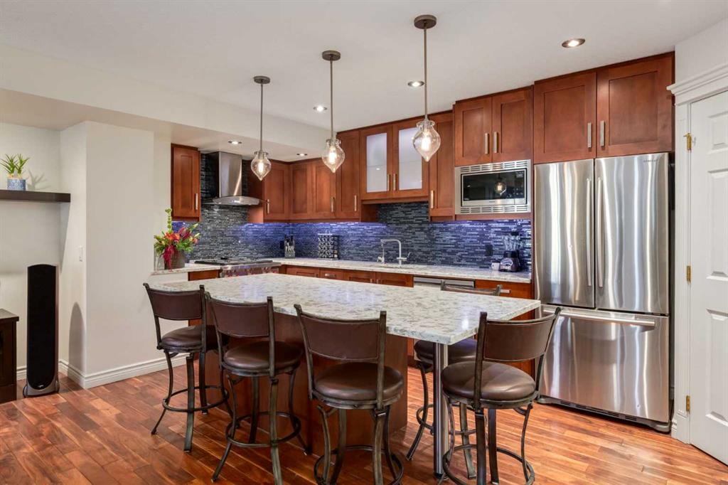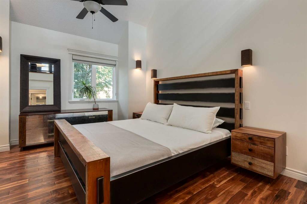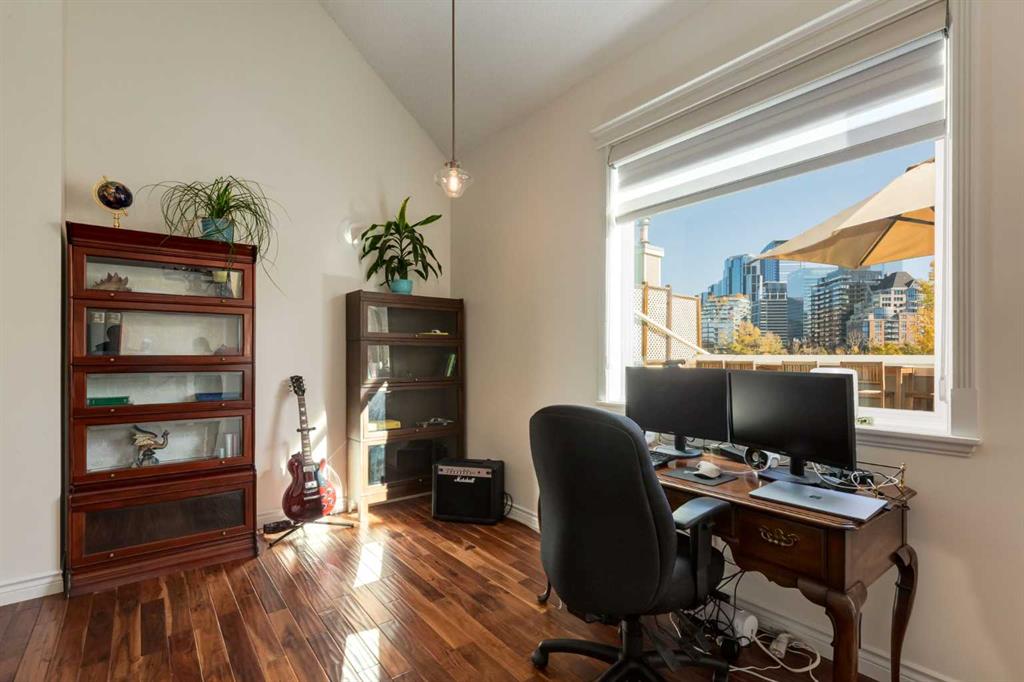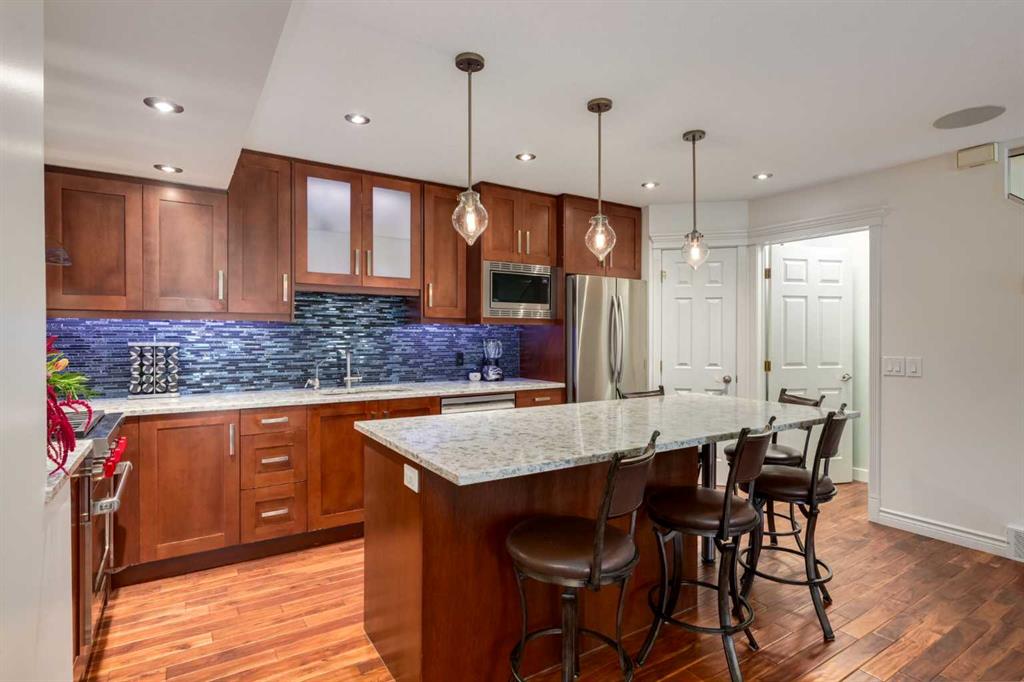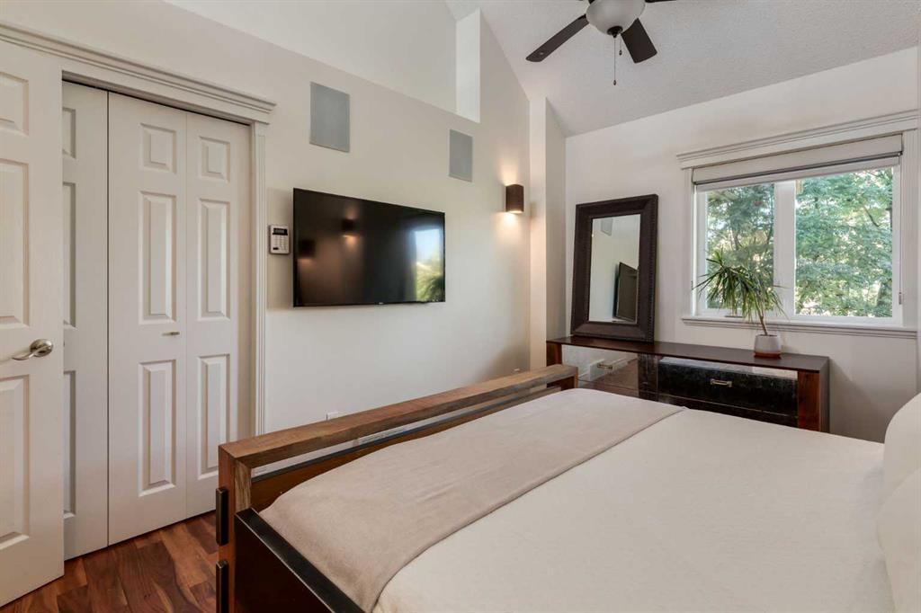 OPEN HOUSES – Thursday October 16 from 3 to 5 PM and Saturday October 18 from 1 to 3 PM. SUNNYSIDE townhome along the BOW RIVER with DOWNTOWN VIEWS. Located in a small enclave of 10 townhomes, this inner city home has had numerous updates over the past 10+ years. With 1948 square feet of living space over four levels, there are 2 bedrooms and 2.5 baths plus an exceptional top floor loft space with vaulted ceilings adjacent to an outstanding 20” x 16” roof top patio. The views of Calgary’s city skyline are truly exceptional. The home has newer windows & doors, plus the decking has been replaced. The custom kitchen includes Makore cabinetry, large island and stainless appliances. There is hardwood flooring on three levels, tile in the foyer and bathrooms, quartz countertops, chrome finish hardware, updated light fixtures, built-in entertainment cabinets in living area, air conditioning, and a two 2-sided gas fireplace with remote control. The lower level is developed, including a four piece bath. The Sierras Riverside in Sunnyside is a one of a kind condominium in a vibrant walkable and bikeable location with restaurants, retail, transit, and the Peace Bridge steps away.