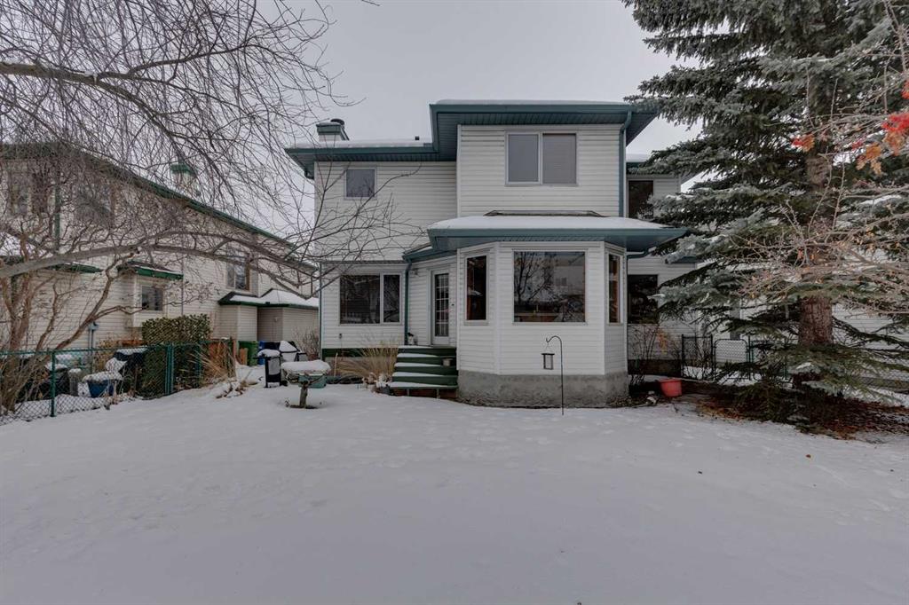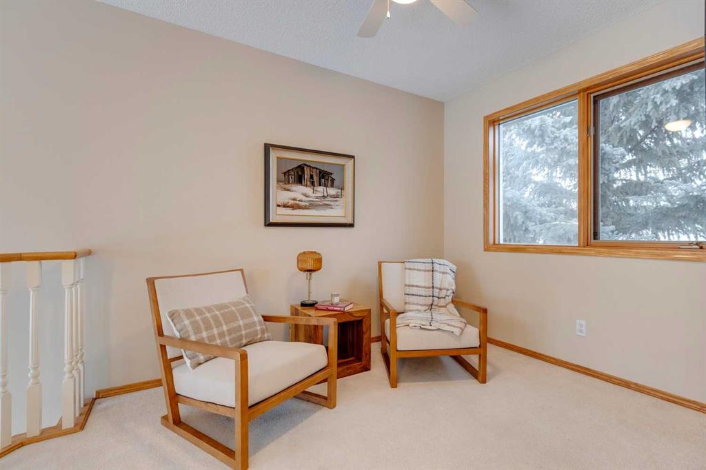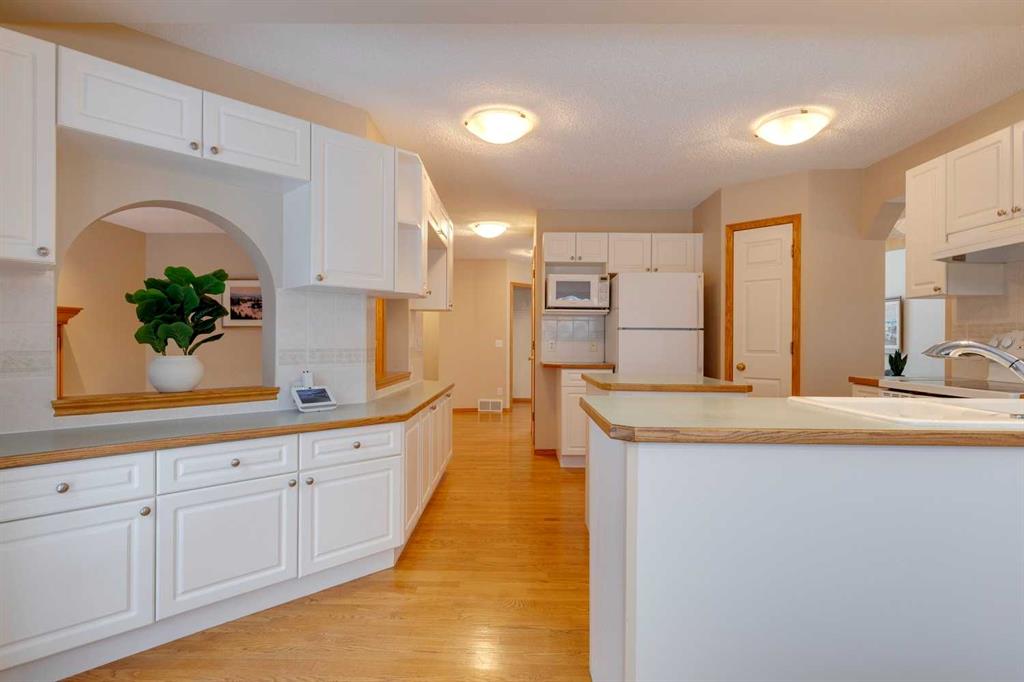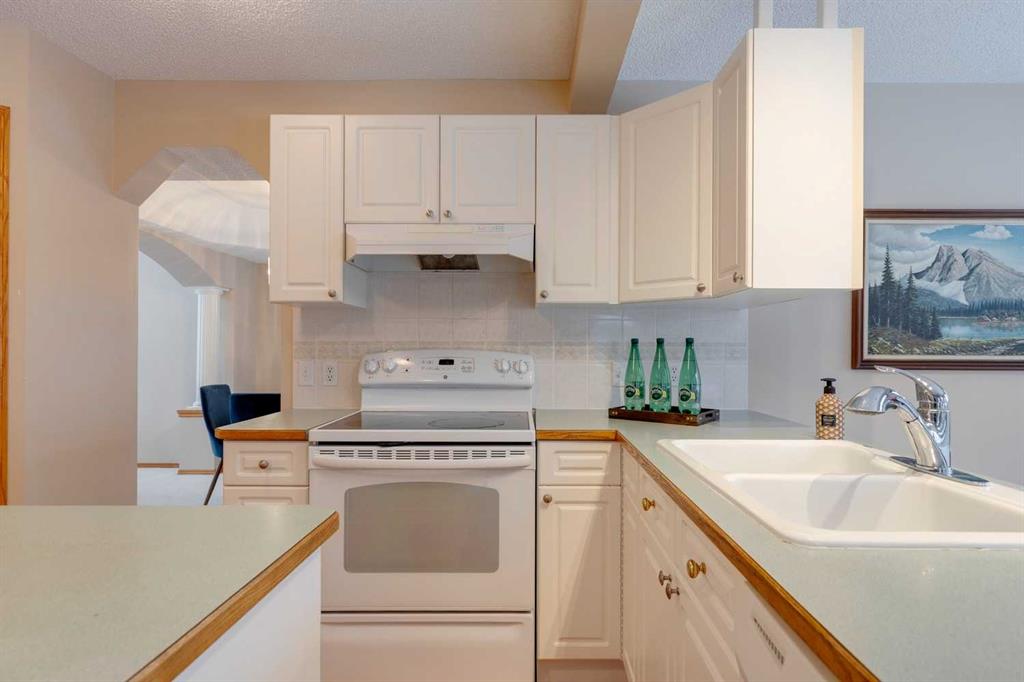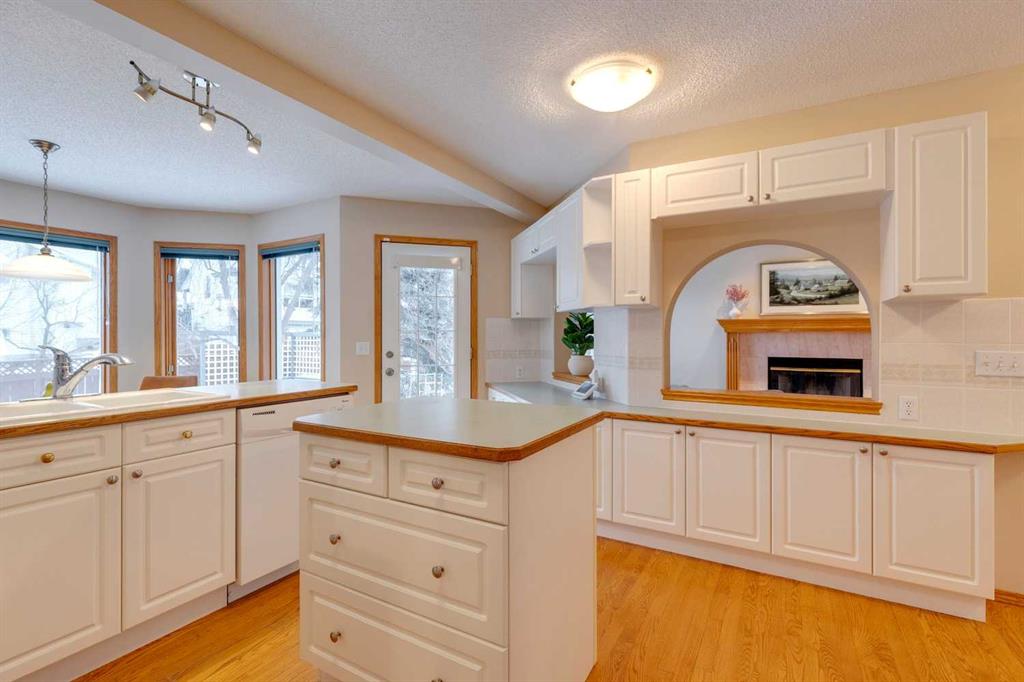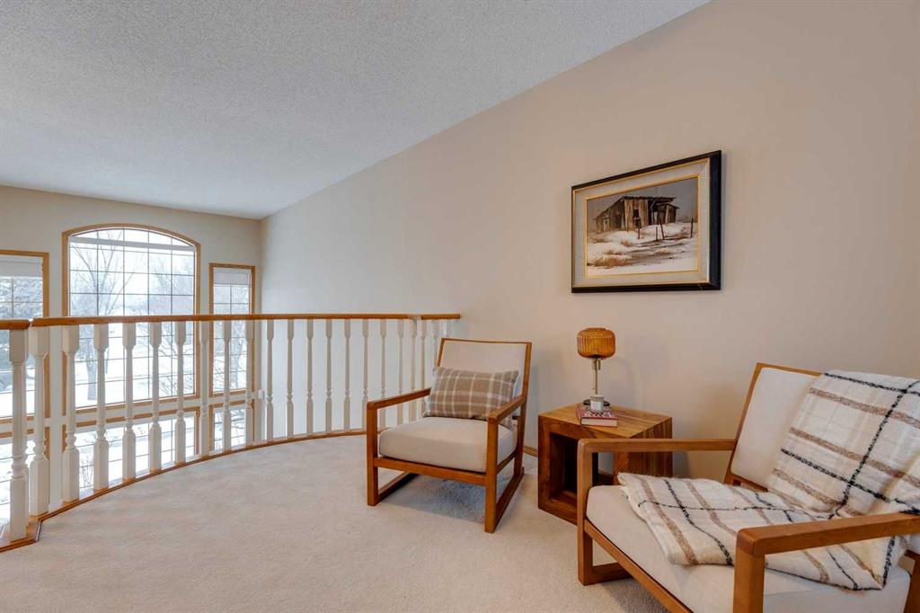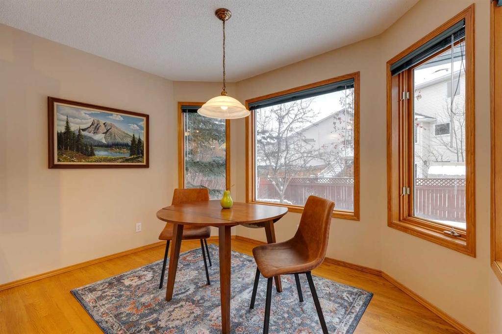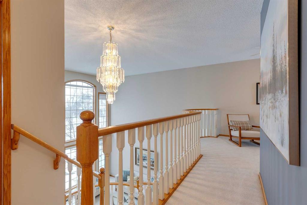 **READY FOR QUICK POSSESSION** This two-story home sits in an excellent, quiet location just steps off the Bow Valley Parkway, offering very pleasing curb appeal that leads into a welcoming two-story entrance. The living room also impresses with its two-story height, abundant windows + natural light, while the neutral décor + paint palette create a fresh, inviting feel throughout. Hardwood flooring + carpeting cover the main floor, which features a spacious kitchen with generous storage + counter space, a roomy breakfast nook overlooking the backyard + a cozy family room with fireplace. A mudroom + laundry area sit conveniently off the attached double garage. Upstairs offers a loft/sitting room plus two bedrooms, including a generous primary suite with ceiling fan, roomy en-suite bath + walk-in closet. The lower level is partly finished with a rec room + bathroom, providing ample opportunity to tailor the remainder of the space. The pretty, flat backyard with mature trees completes this appealing property.