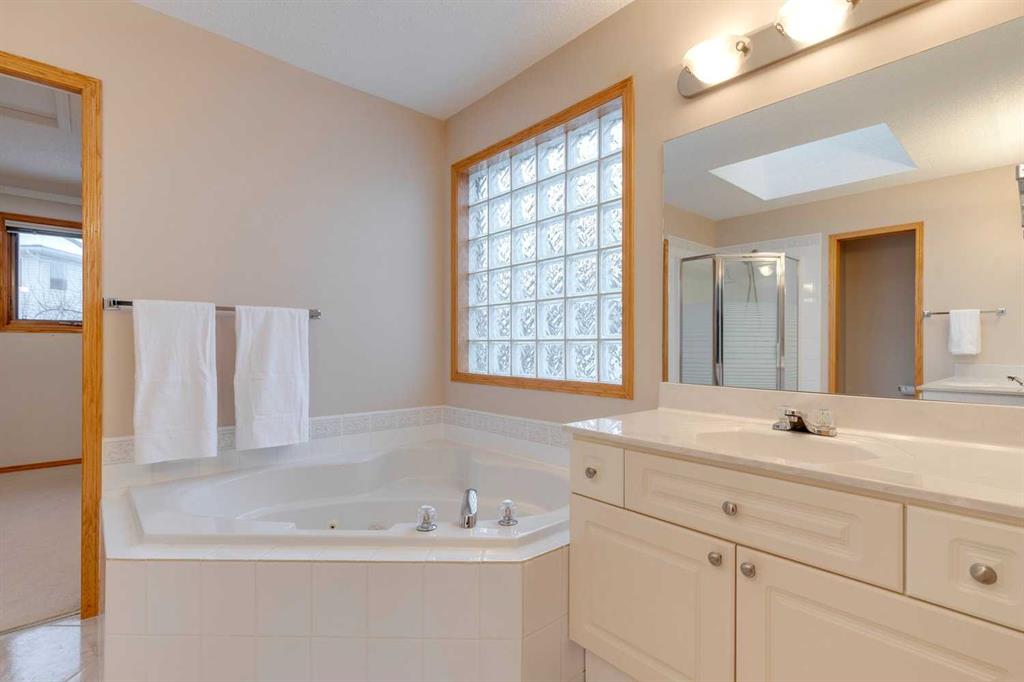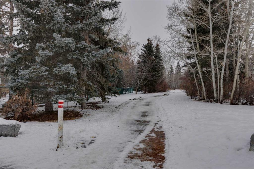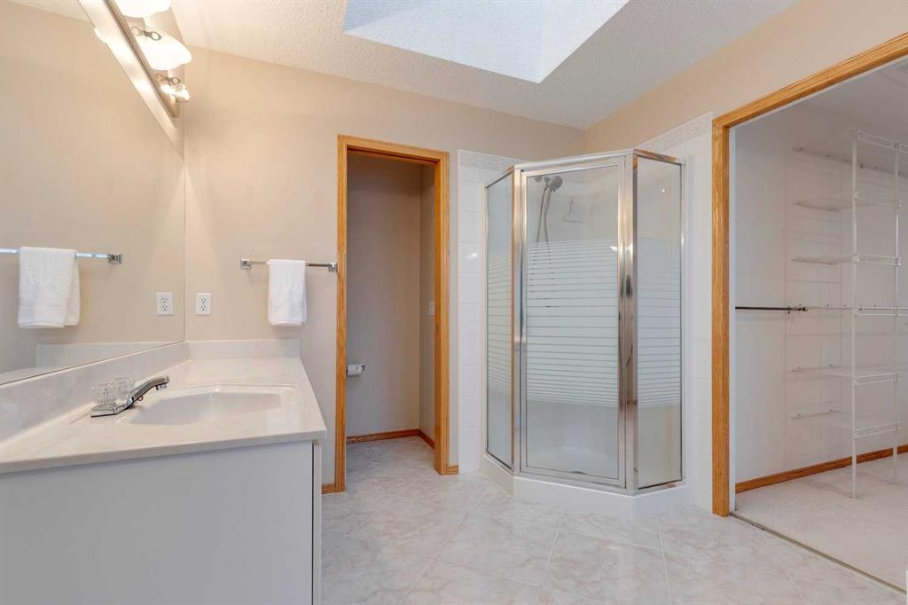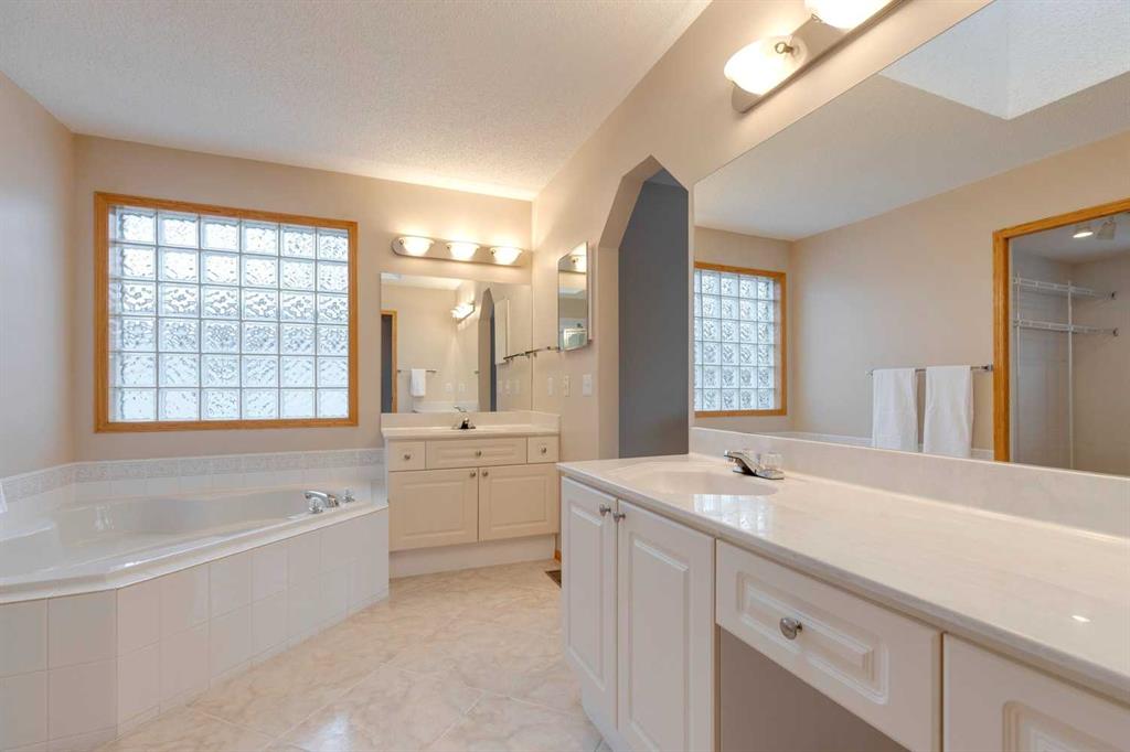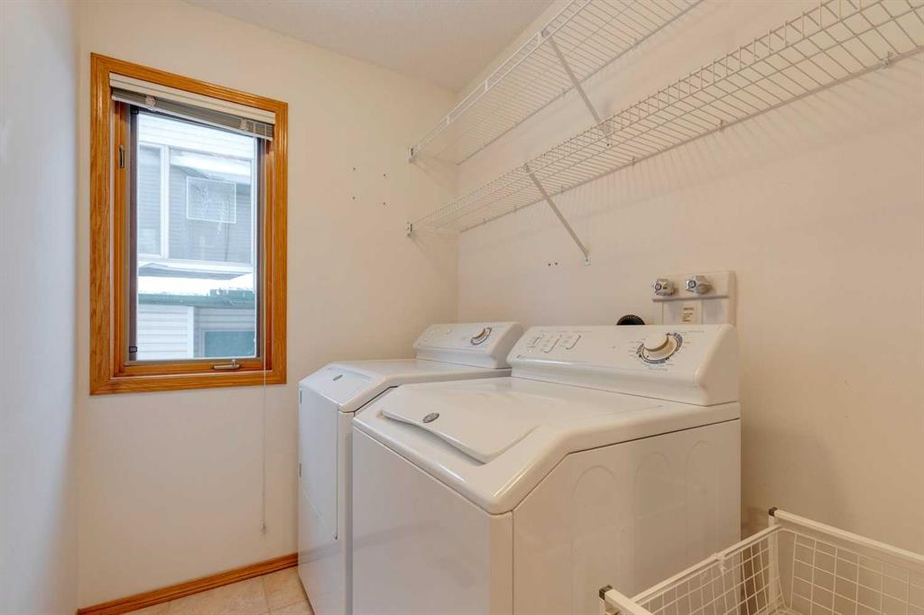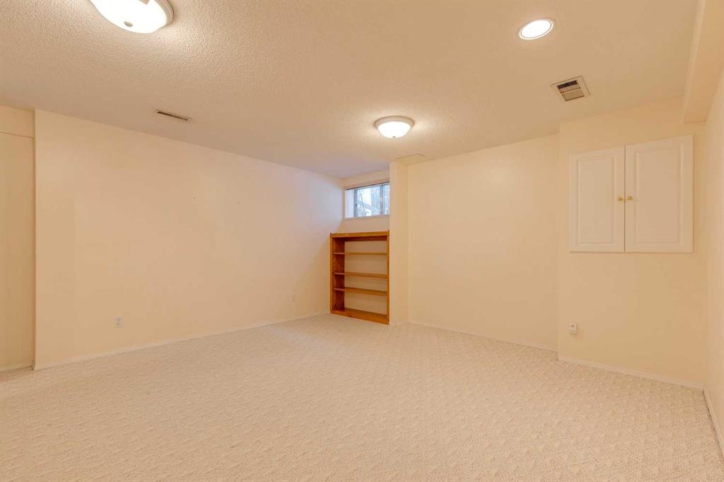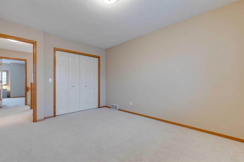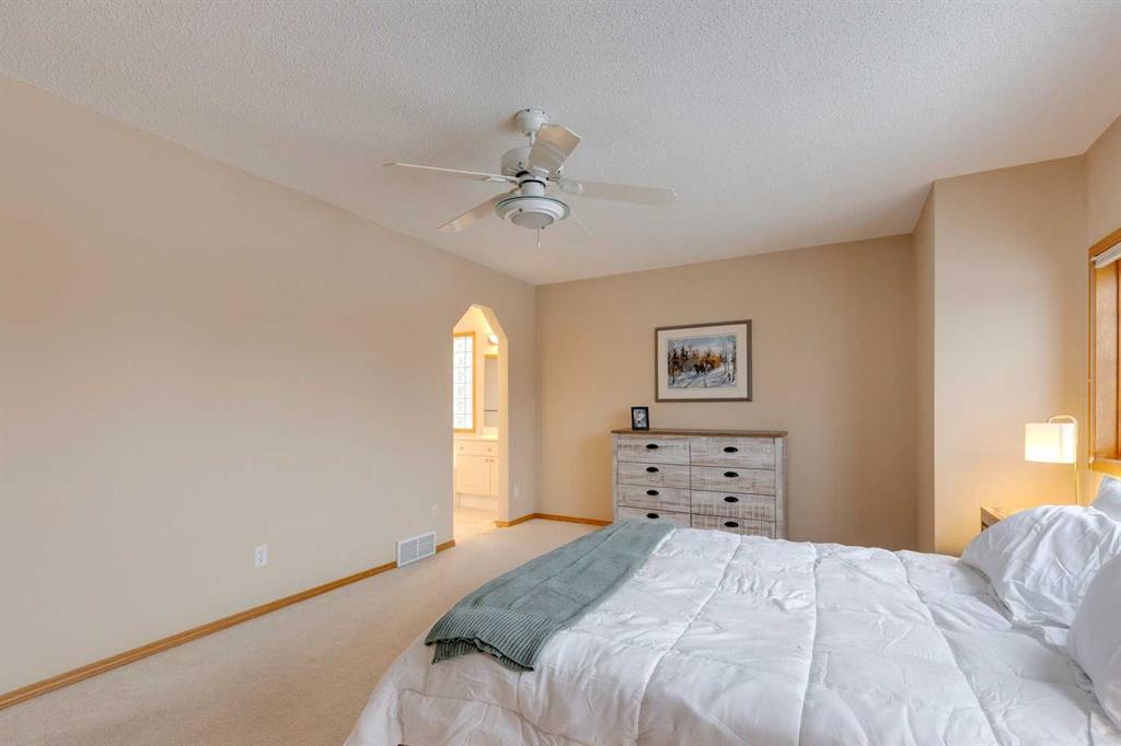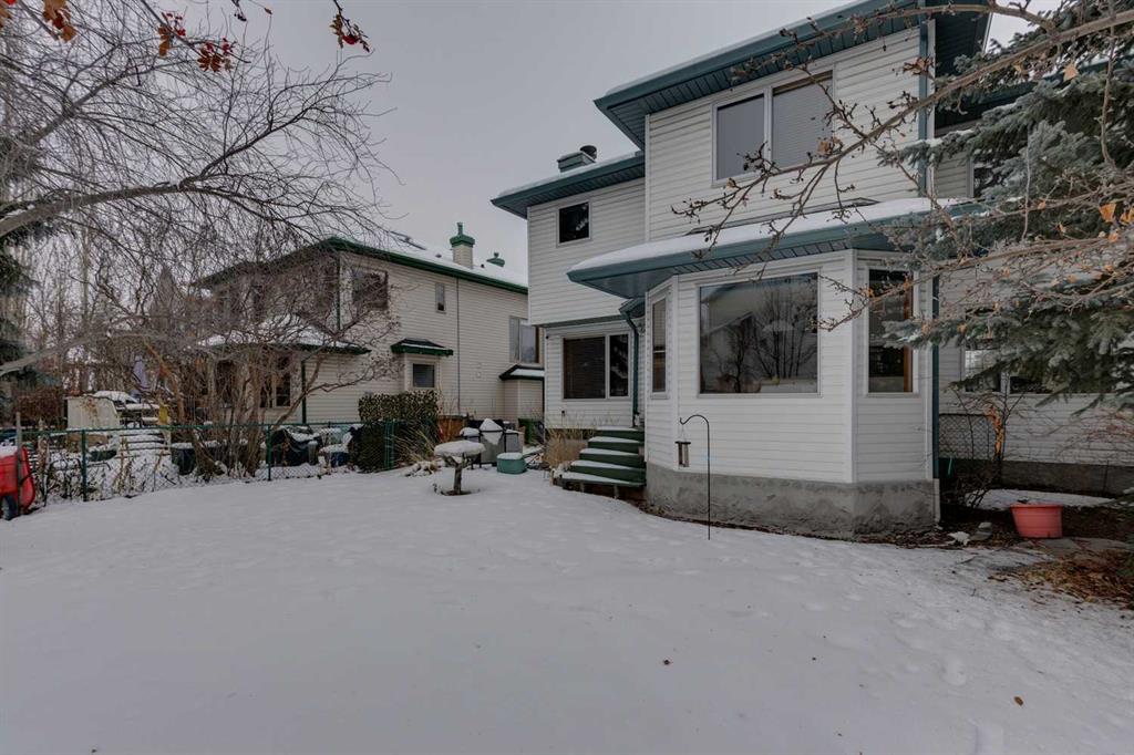 **READY FOR QUICK POSSESSION** This two-story home sits in an excellent, quiet location just steps off the Bow Valley Parkway, offering very pleasing curb appeal that leads into a welcoming two-story entrance. The living room also impresses with its two-story height, abundant windows + natural light, while the neutral décor + paint palette create a fresh, inviting feel throughout. Hardwood flooring + carpeting cover the main floor, which features a spacious kitchen with generous storage + counter space, a roomy breakfast nook overlooking the backyard + a cozy family room with fireplace. A mudroom + laundry area sit conveniently off the attached double garage. Upstairs offers a loft/sitting room plus two bedrooms, including a generous primary suite with ceiling fan, roomy en-suite bath + walk-in closet. The lower level is partly finished with a rec room + bathroom, providing ample opportunity to tailor the remainder of the space. The pretty, flat backyard with mature trees completes this appealing property.