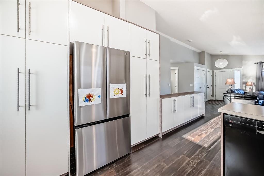 Step inside to a bright, open-concept main floor bathed in natural light from abundant windows. Vaulted ceilings, neutral tones, trendy cabinetry, and extensive built-in storage enhance the modern appeal. The spacious living room flows seamlessly into the dining area and kitchen, complete with modern appliances (including a brand-new fridge) and direct access to the south-facing back deck—perfect for effortless indoor-outdoor living.